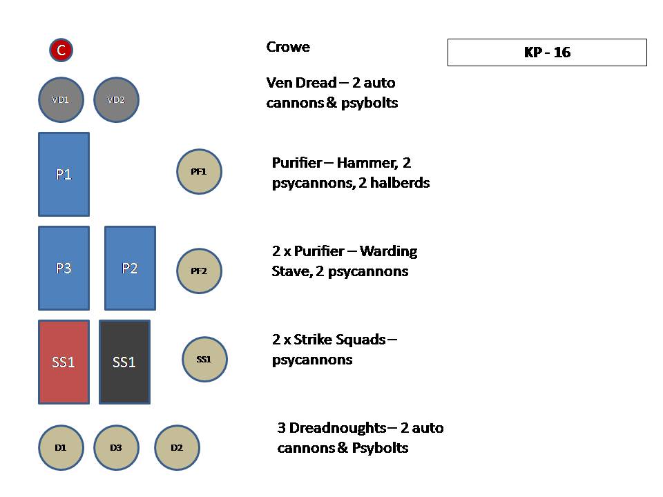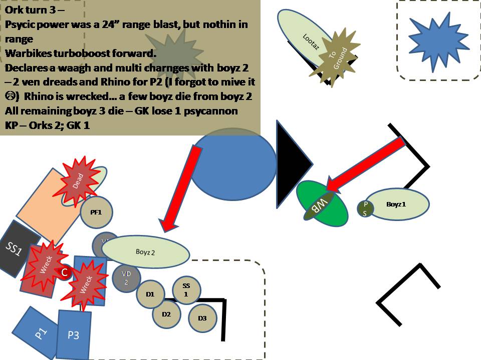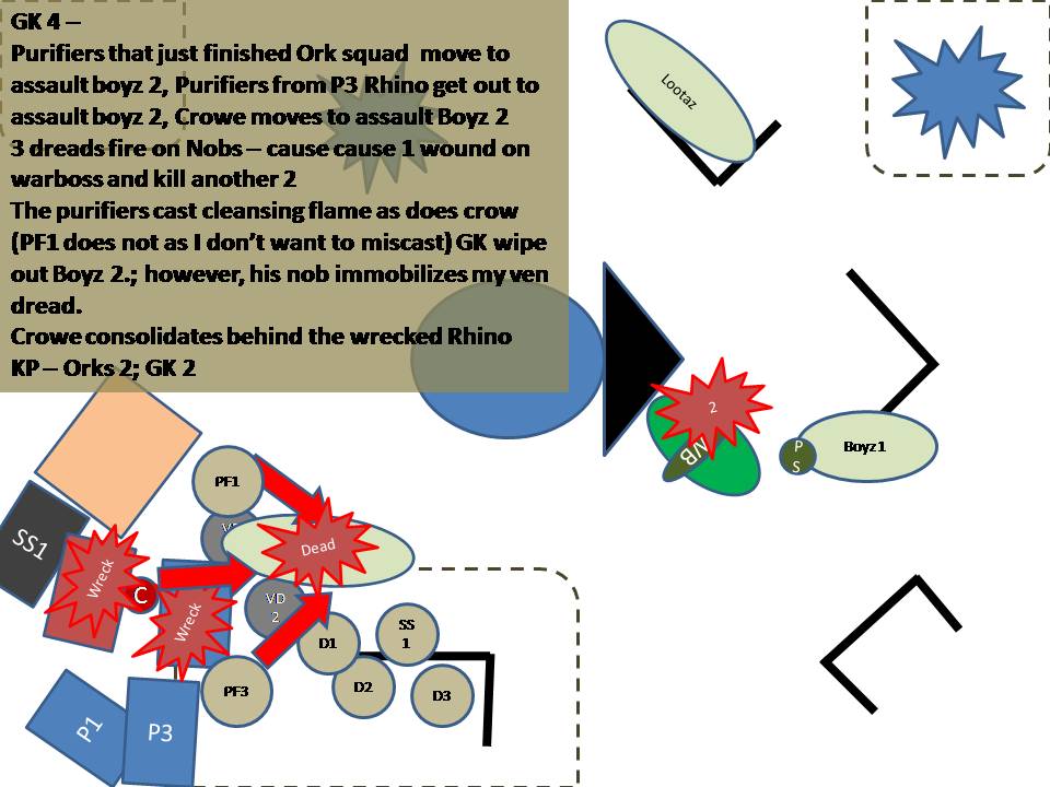 Summary – at the end of Lukes turn 2 I have, 1 immobilized Rhino (red), Crowe, 2 squads of purifiers with only a psycannon left, 1 4 man purifier squad (both psycannons and warding stave), 1 full strike squad in rhino, 1 seargetn from a strike squad, and all of my dreadnoughts.