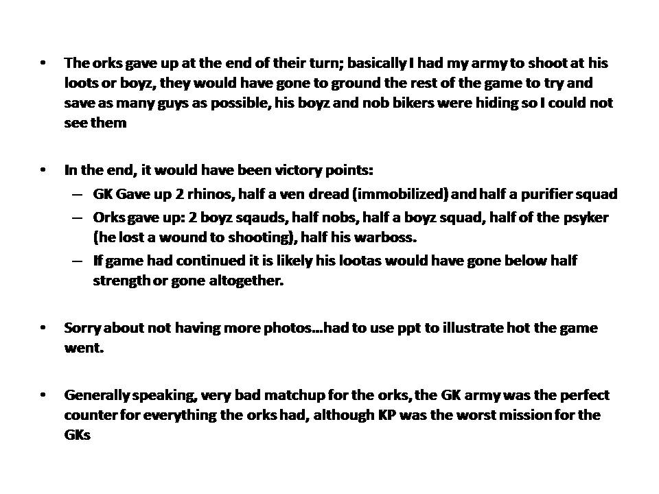 We played a second game, this one on KPs. No photos and this game the dice were not with Luke…we stopped at top of turn 6 (luke went first again) at this point (I would have had another turn) it was 9-5 VPs (4 of my rhinos and 1 strike squad that ran off the board) – (I had taken out all o fhis transports, and his psykers and I think ieven a strike squad.