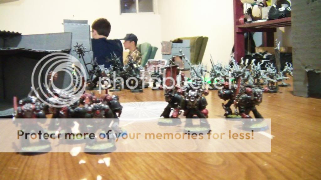 Turn 5 – Tyranids With 2 objectives in the possession of Chaos, Nick had to make some quick moves to win the game. First off, he assaulted the conga line with the lone Zoanthrope, dragging the unit off of both objectives, and leaving him with the only captured objective. The Chaos Marines are unable to kill it too, so as long as the game didn't go on for another turn, then Nick had the game in the bag. In addition, the Bloodthirster finishes off the Tervigon. The Broodlord manages to rip the Demolisher Cannon off of the Defiler, but the entire unit is killed afterwards.