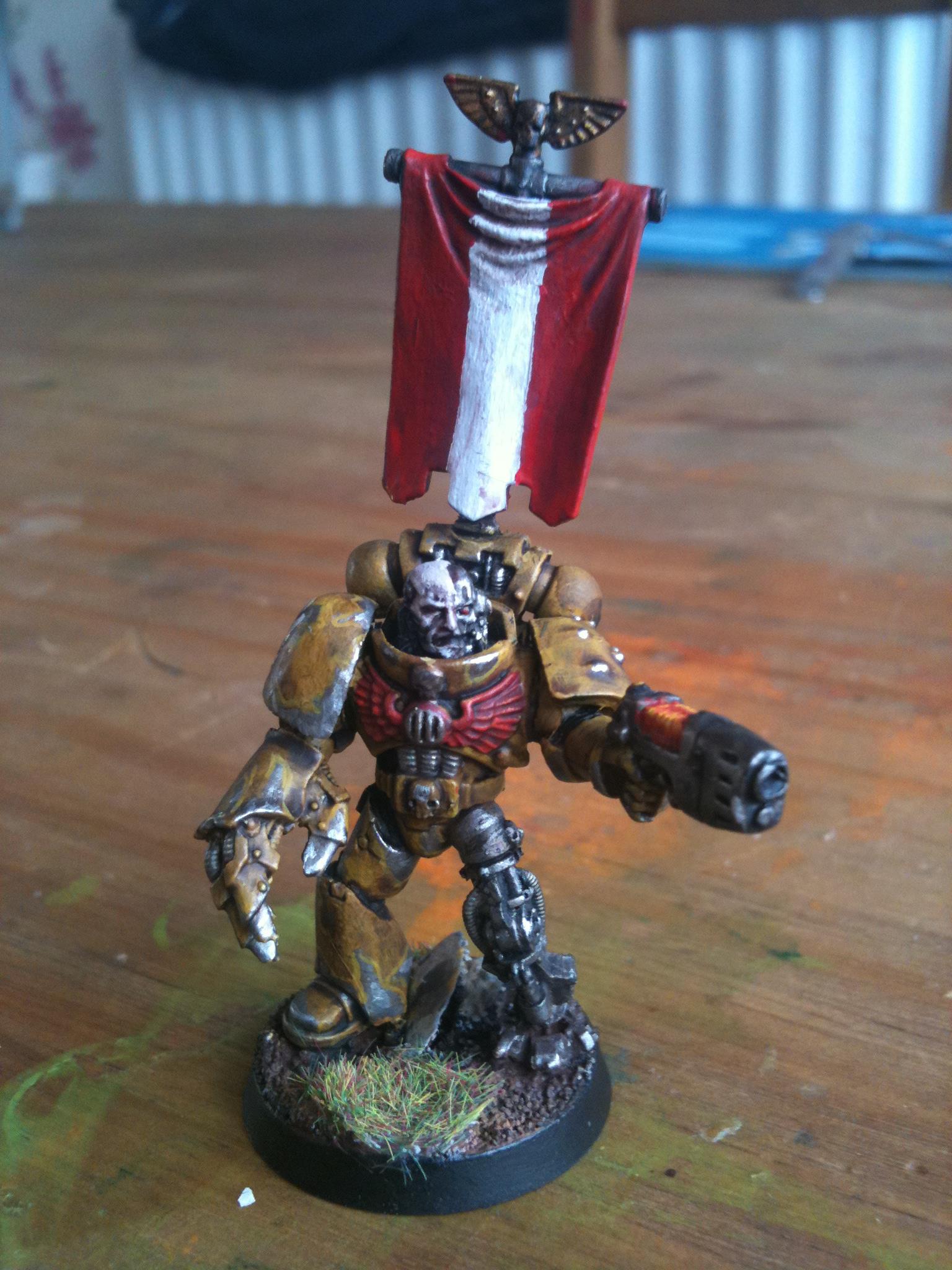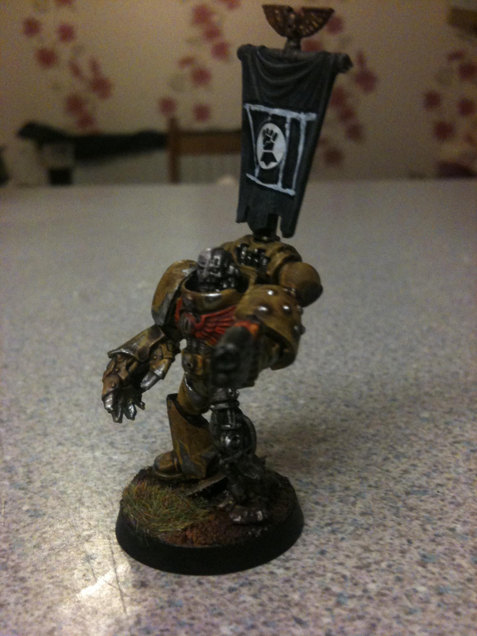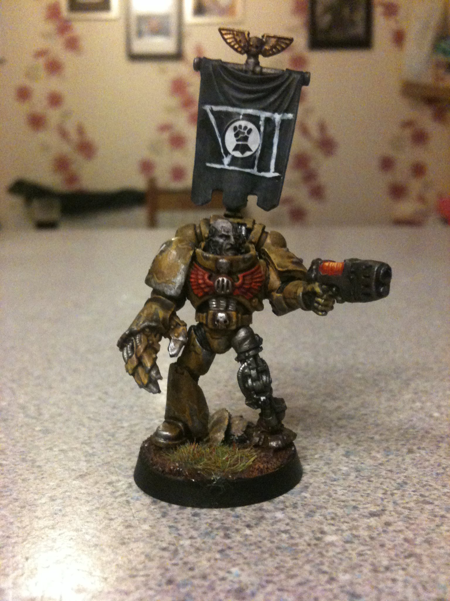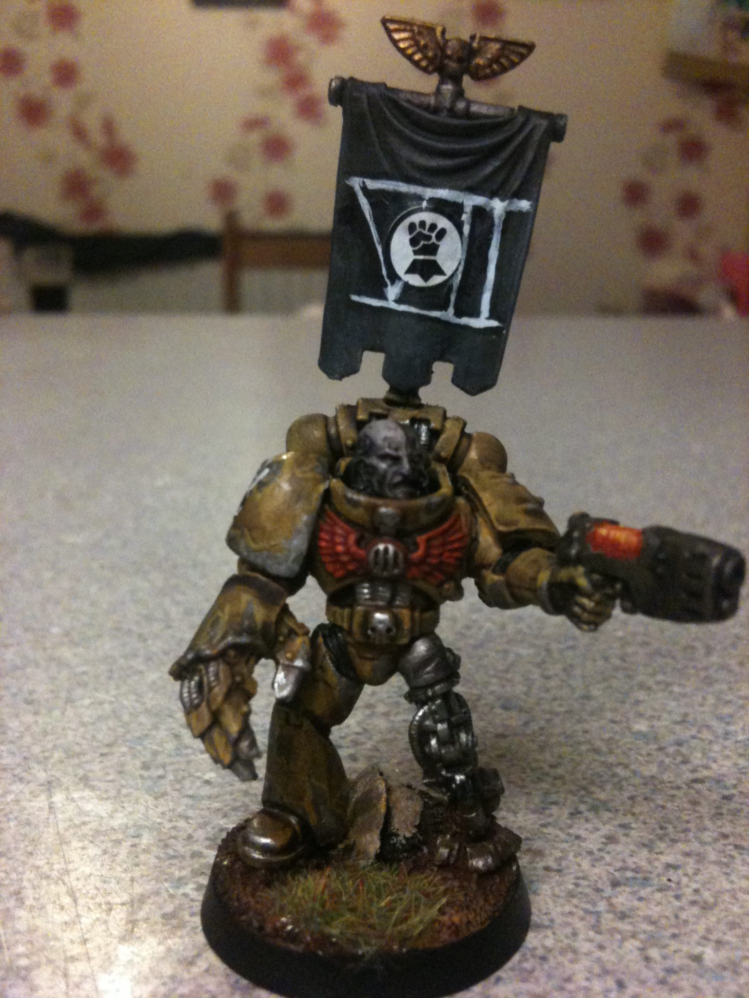 I think just dave got it right it the face needs to be brighter and may be a white banner with a yellow fist on it I'll get on to it and post pics in the morning.. Thanks guy Automatically Appended Next Post: Ow and the power fist is from forge world ... Automatically Appended Next Post: Yep the lighting is a bit darker on this on I was at a different part of my room when I did it so I won't be taking my pics there any more lol
