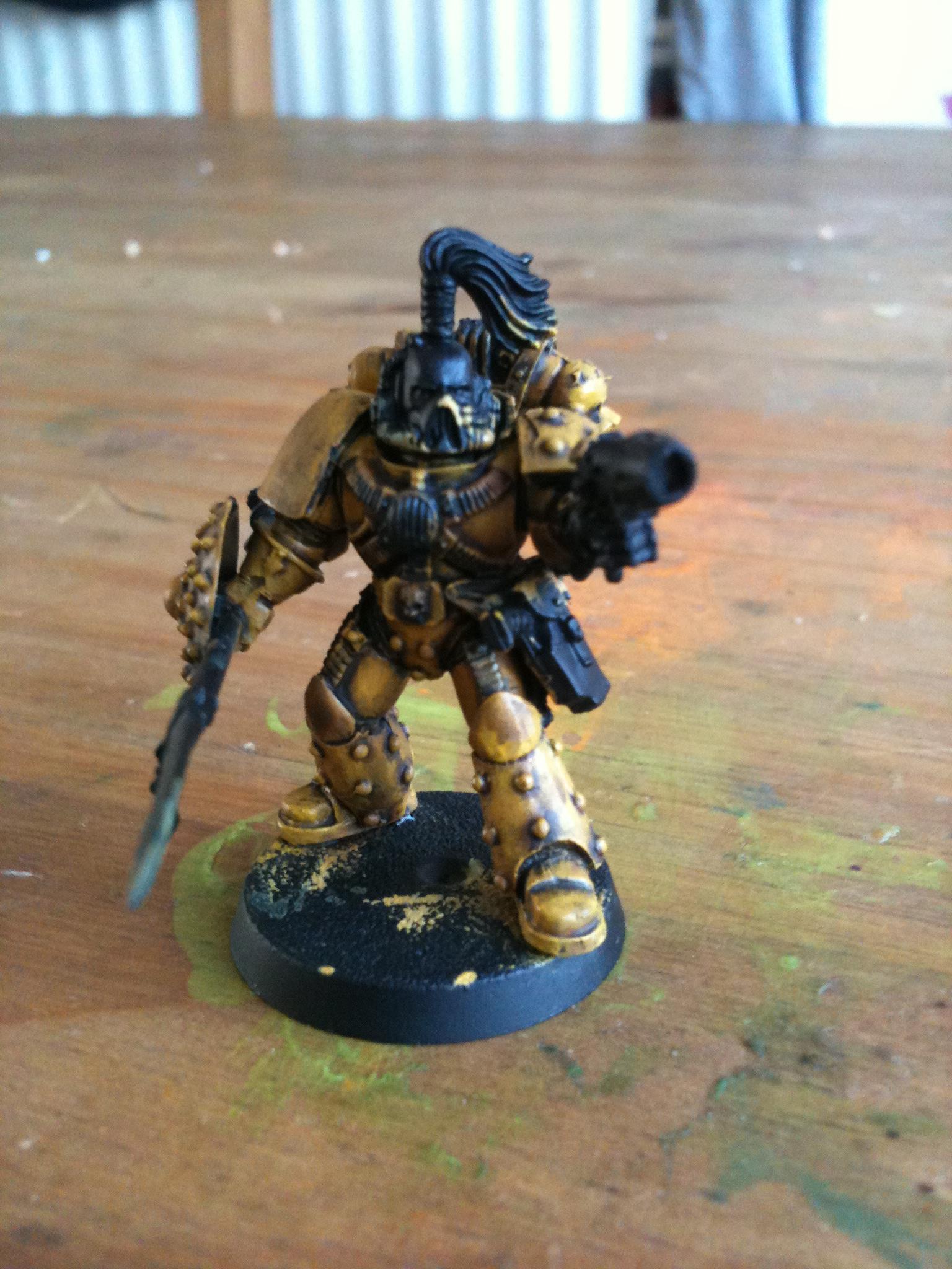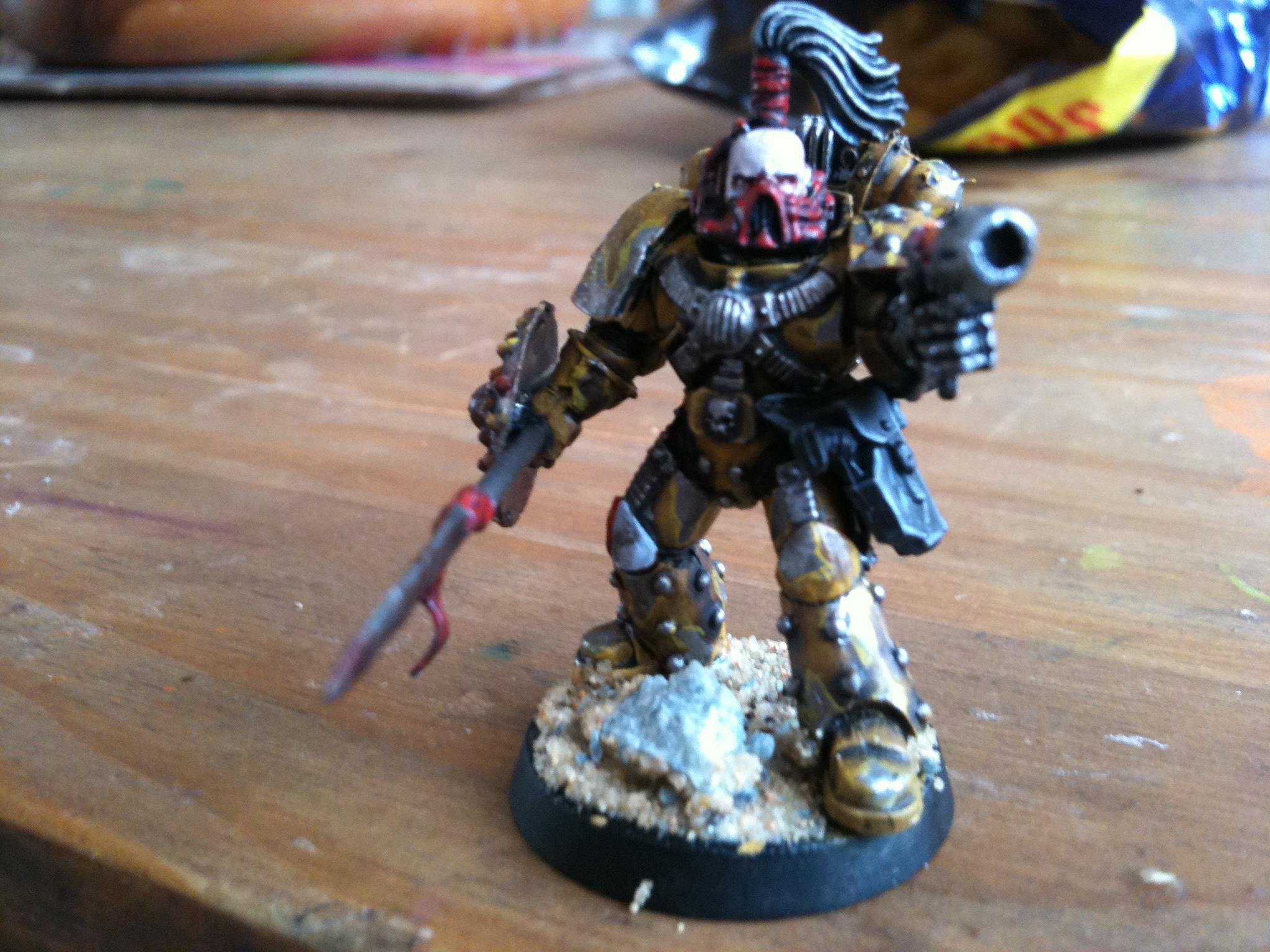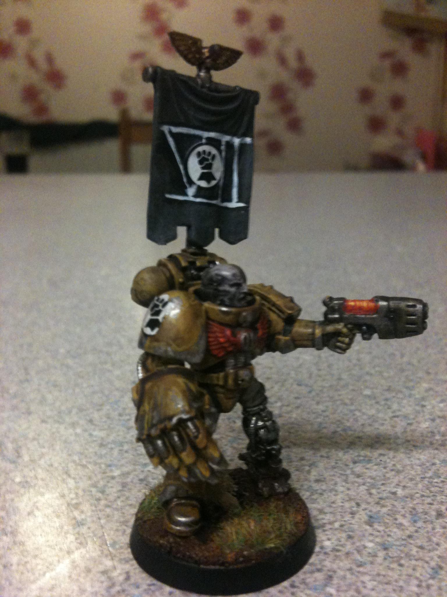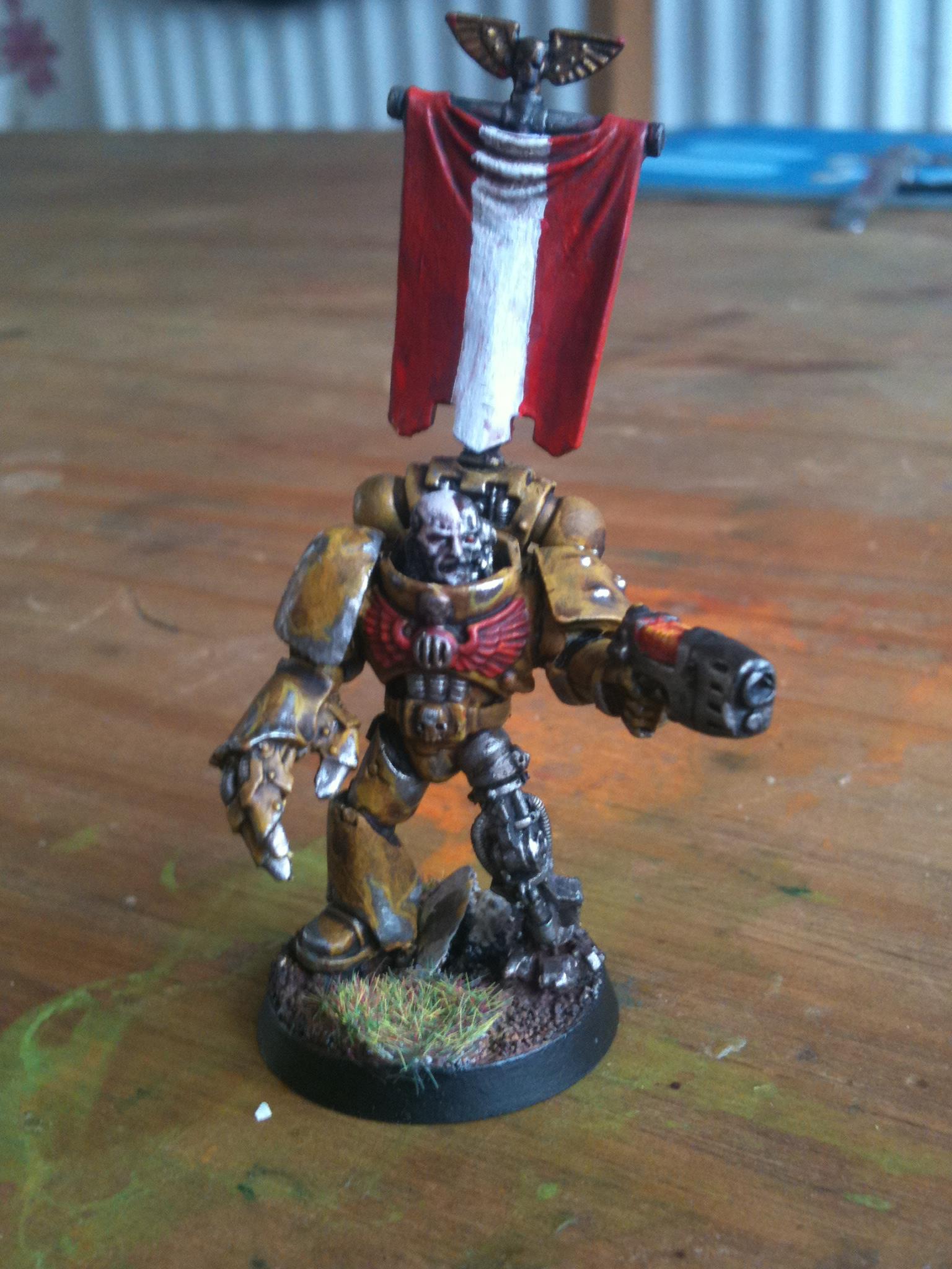 I think just dave got it right it the face needs to be brighter and may be a white banner with a yellow fist on it I'll get on to it and post pics in the morning.. Thanks guy Automatically Appended Next Post: Ow and the power fist is from forge world ... Automatically Appended Next Post: Yep the lighting is a bit darker on this on I was at a different part of my room when I did it so I won't be taking my pics there any more lol
