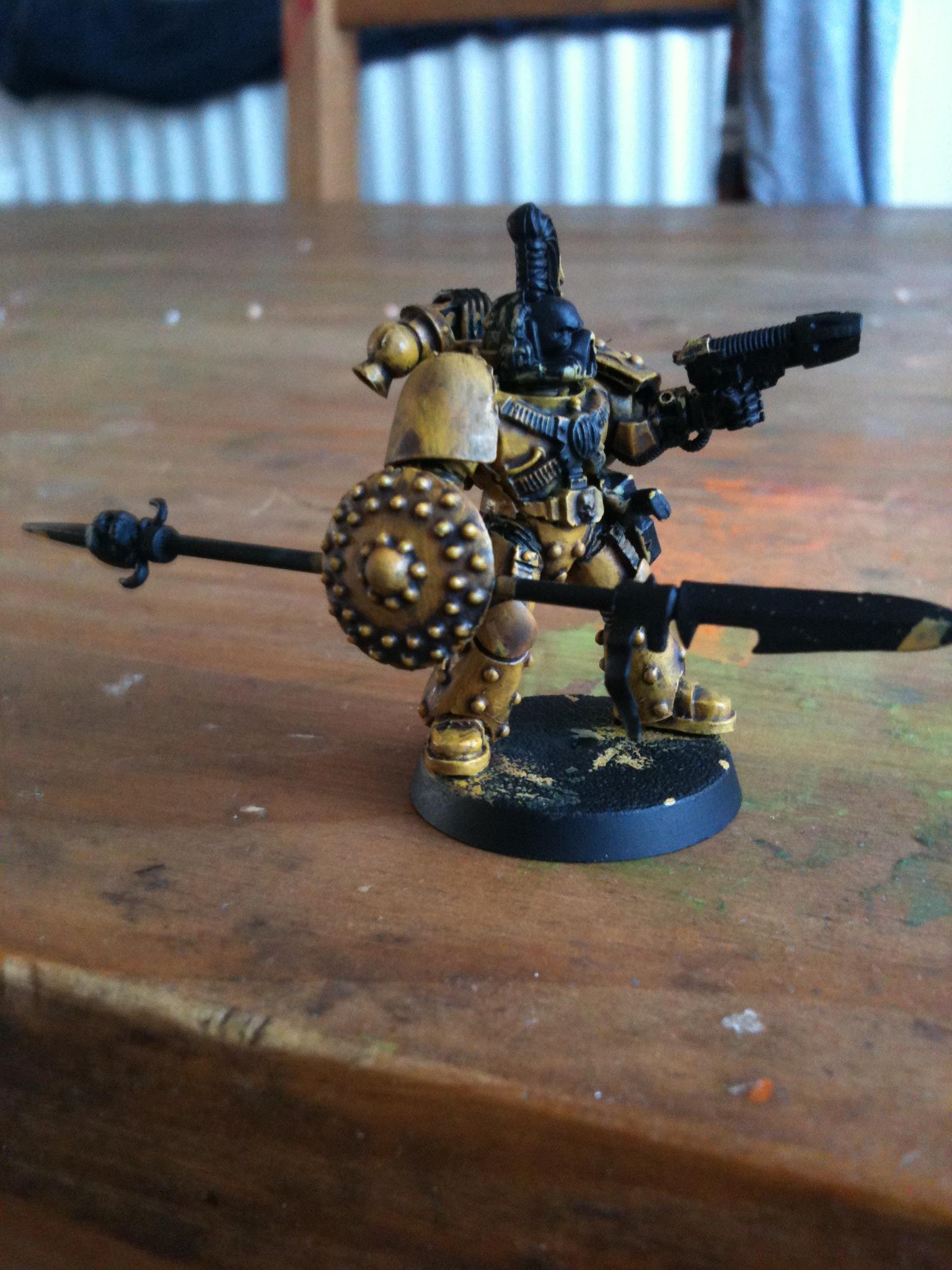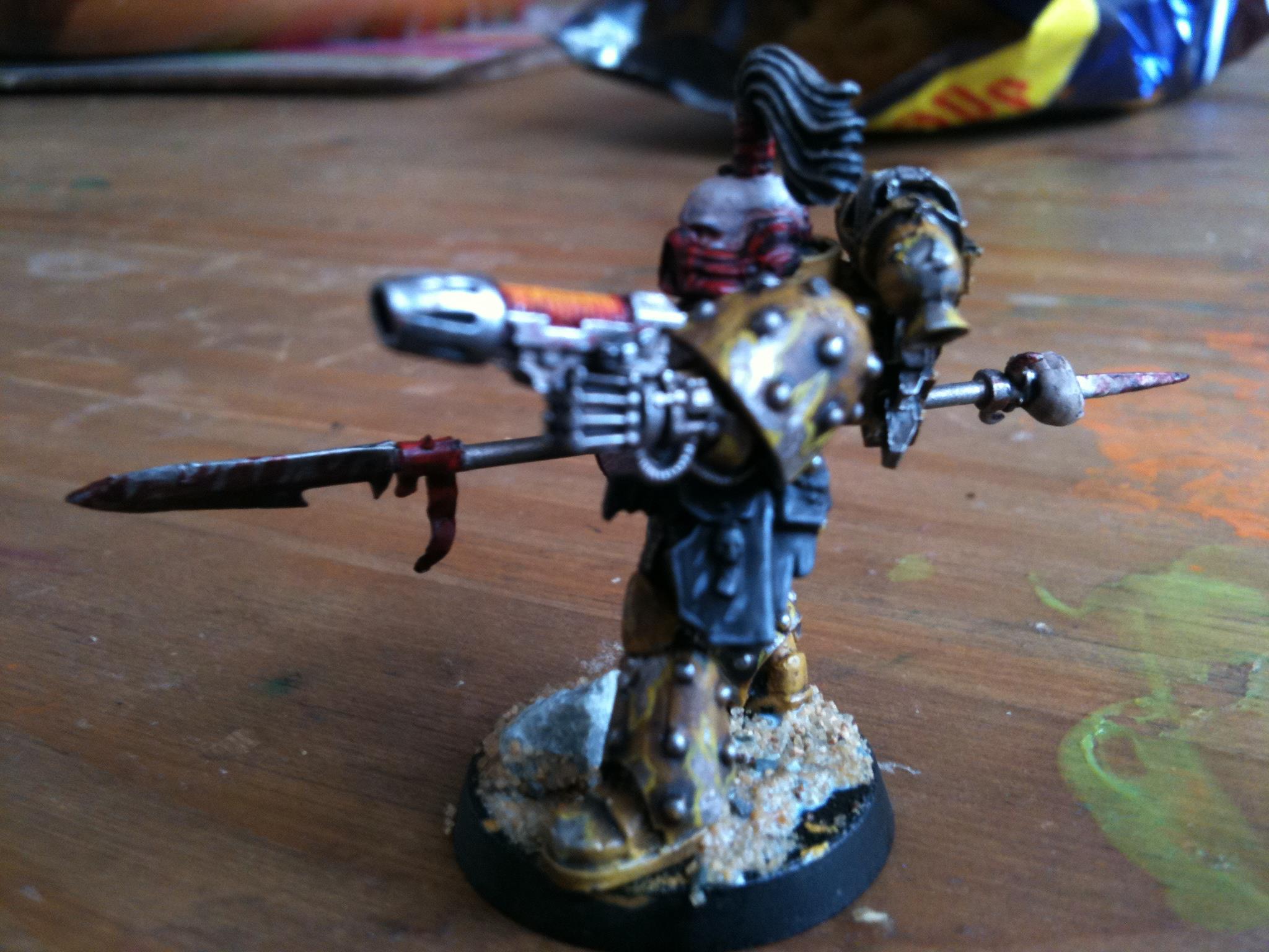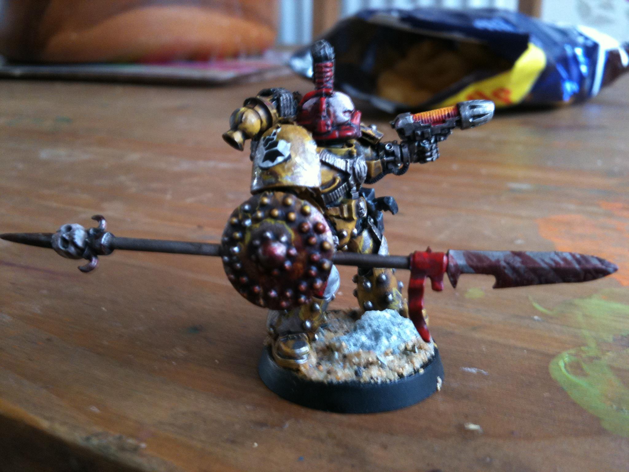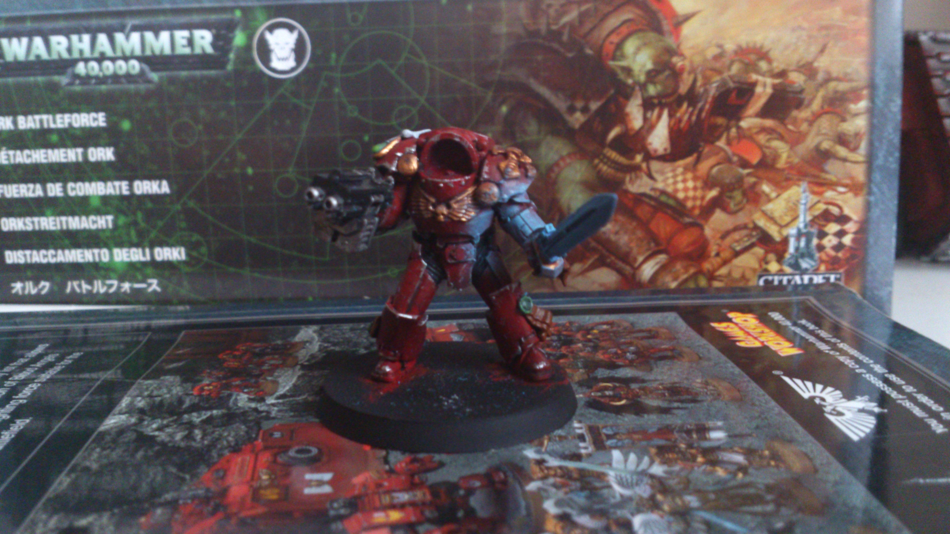 I think just dave got it right it the face needs to be brighter and may be a white banner with a yellow fist on it I'll get on to it and post pics in the morning.. Thanks guy Automatically Appended Next Post: Ow and the power fist is from forge world ... Automatically Appended Next Post: Yep the lighting is a bit darker on this on I was at a different part of my room when I did it so I won't be taking my pics there any more lol