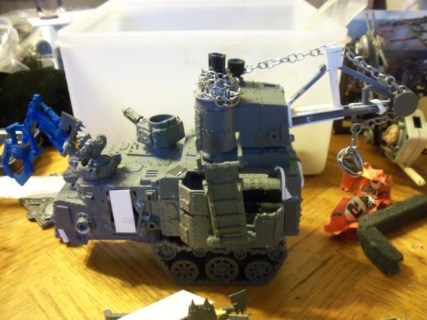 I'm BAAAACK!! Well, back with my Orks, anyways. Was over at Primarch of Mechmarine's place, and we wuz Mekkin' it up for a bit. I managed to do some work on my skratch Stompa (no pics from that) as well as work on my one Battlewagon (I have two, this is the one made of an actual Battlewagon kit. The other one uses Defiler legs.)