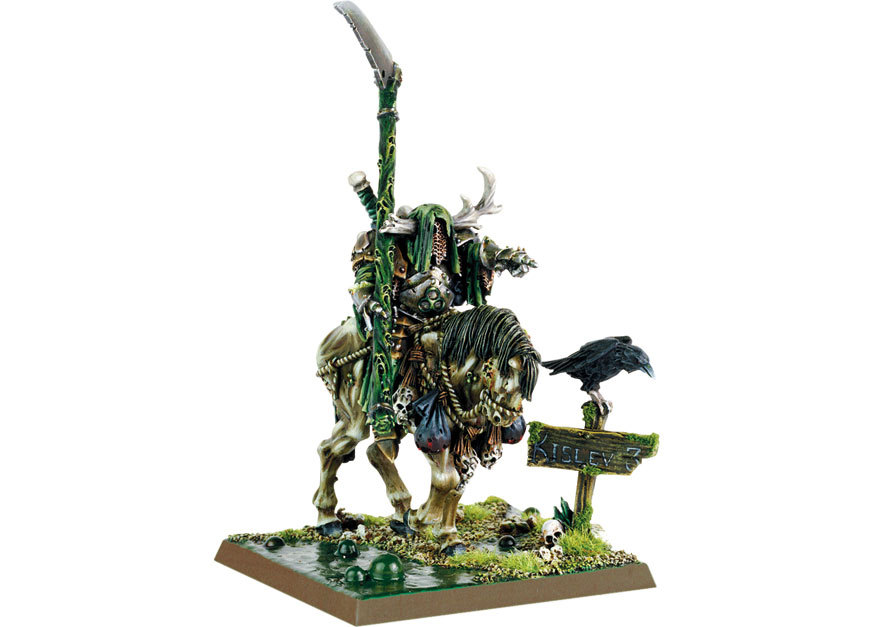 I'd have to go with King Louen Leoncouer of Bretonnia or the now appearently out of production female Wood Elf Highborn/Noble with spear, sword, a cloak with hood and antlers.