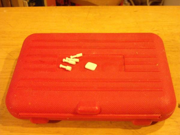 the red box thing is a set of screwdriver bits and the styrene thing shaped the same is a scale model using "eh that looks about right" math.