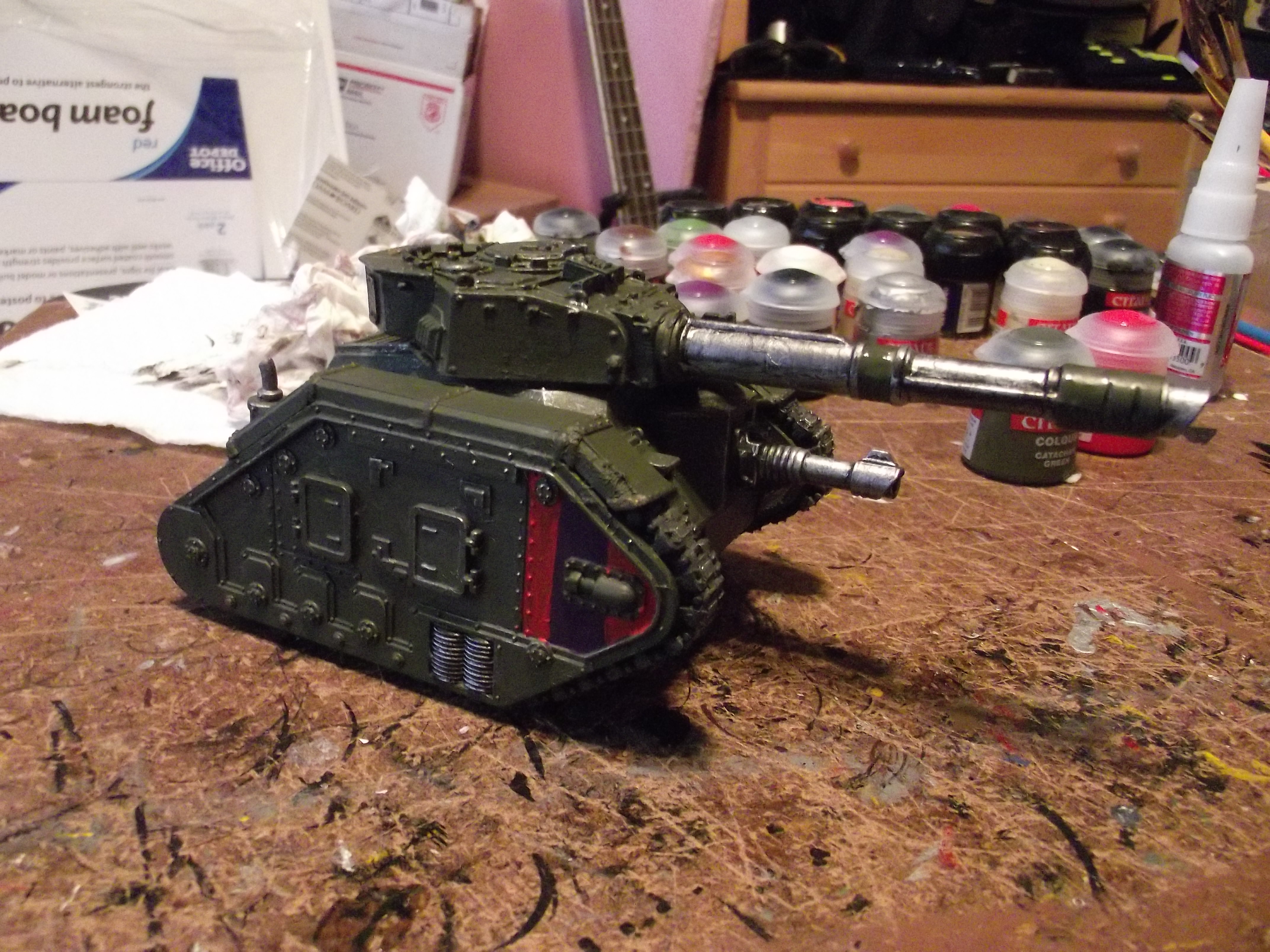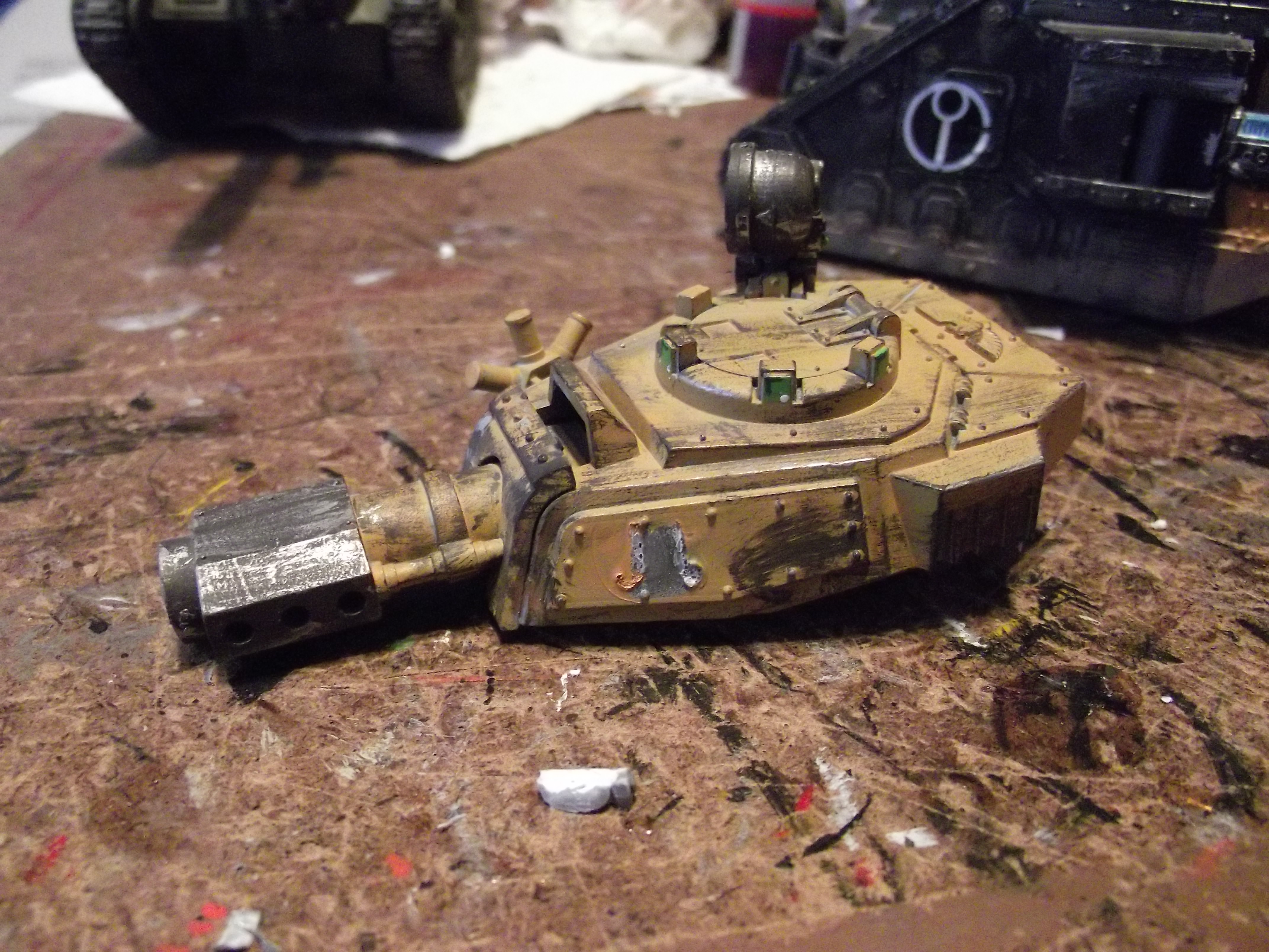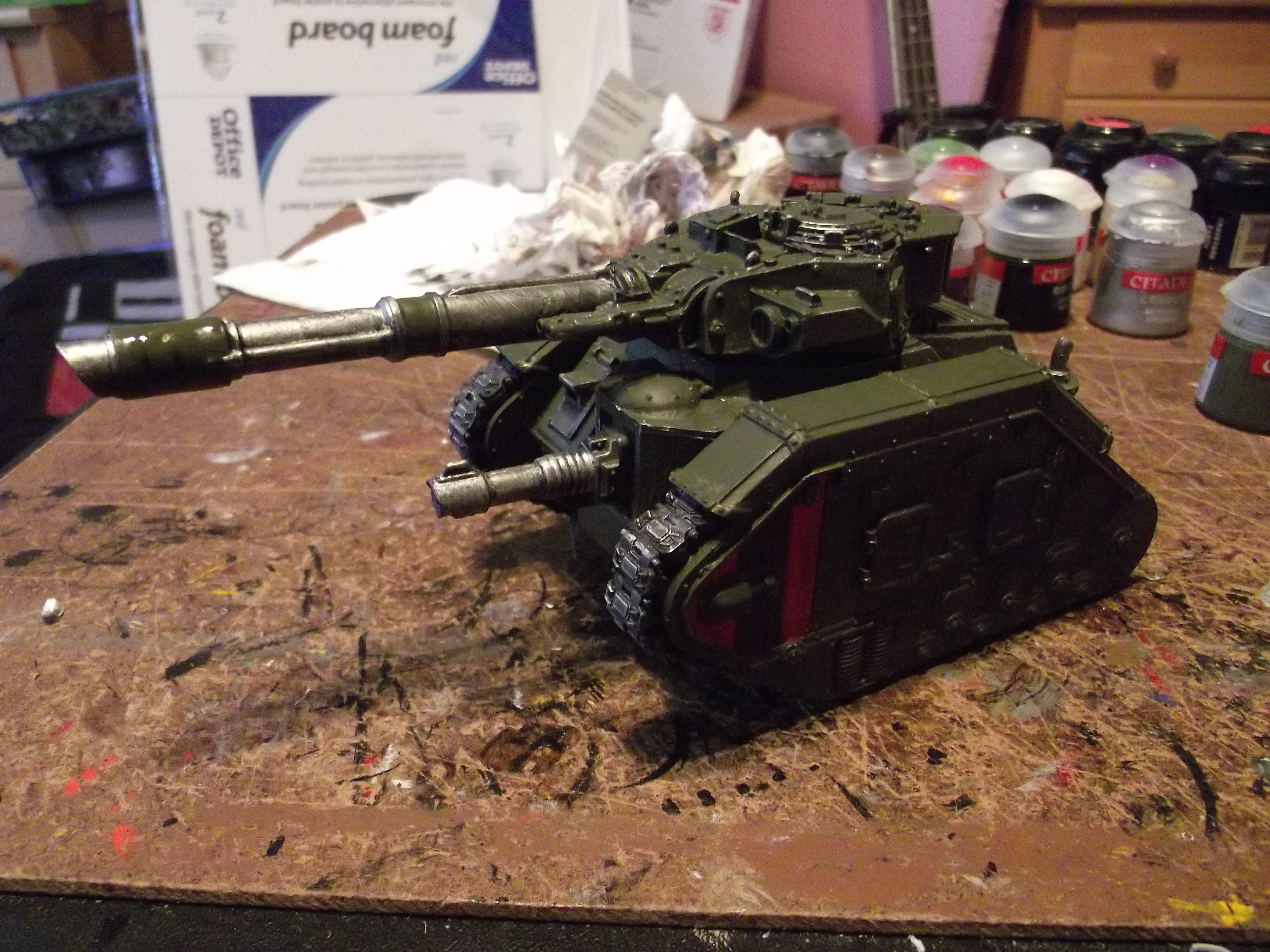 Update time again! I hope to have another one up sunday, as I have a lot of free time to get some painting (and gaming) in. As for now, I spent this morning converting one of the turrests on a tank. Im not a huge fan of the varient so I swapped out the gun on the turret (with some open turret surgery). I also converted a new hull mounted lascannon in place of the heavy flamer that used to be there. I also managed to finish up another vanquisher (with a 3rd in the mail now).