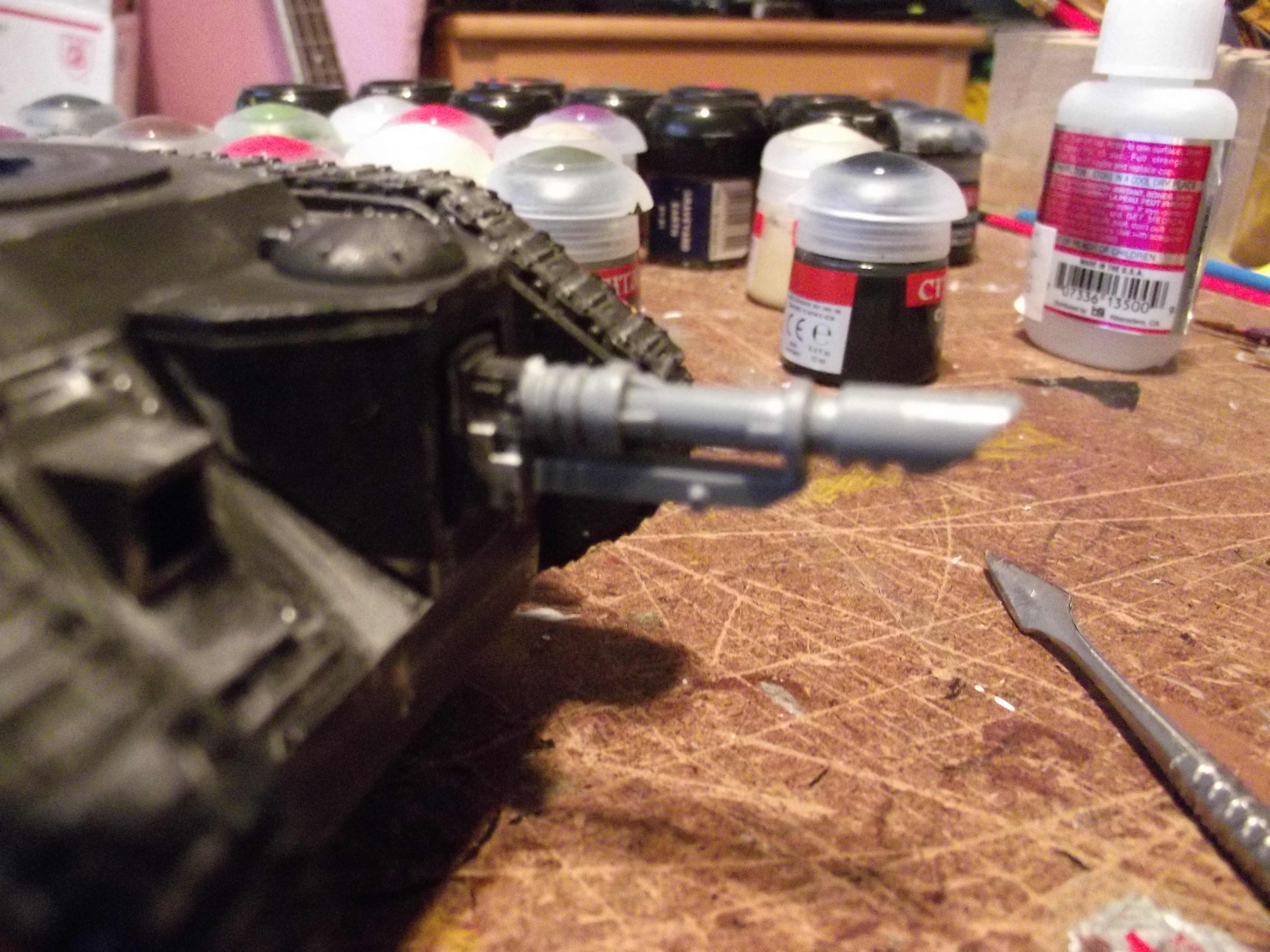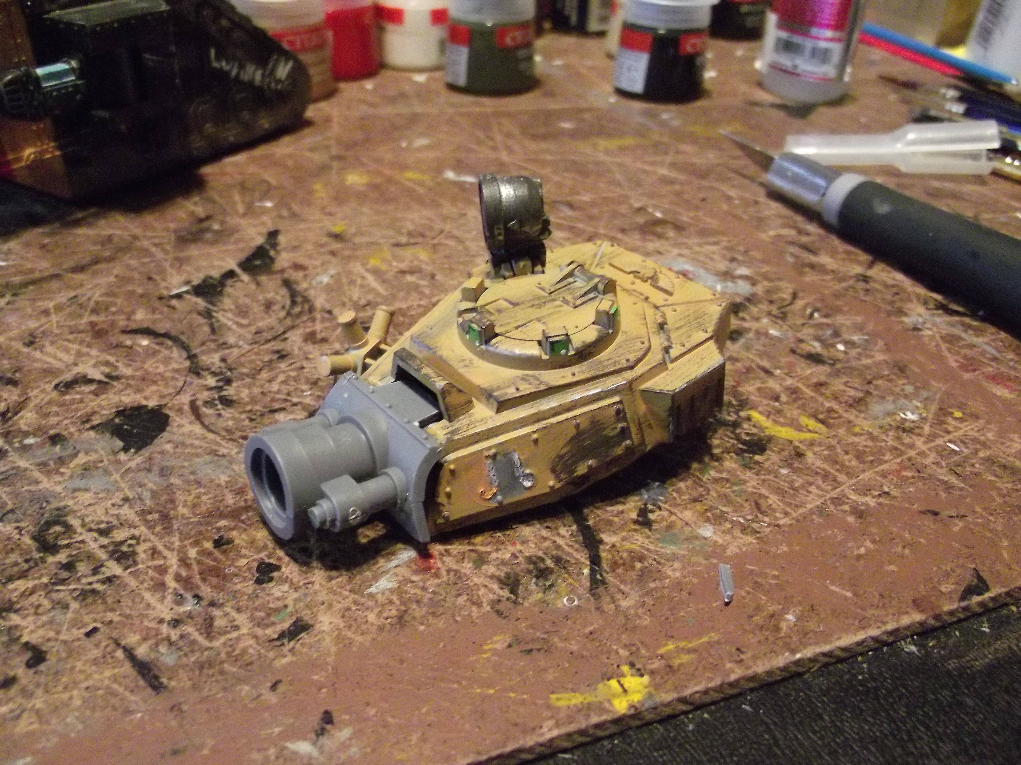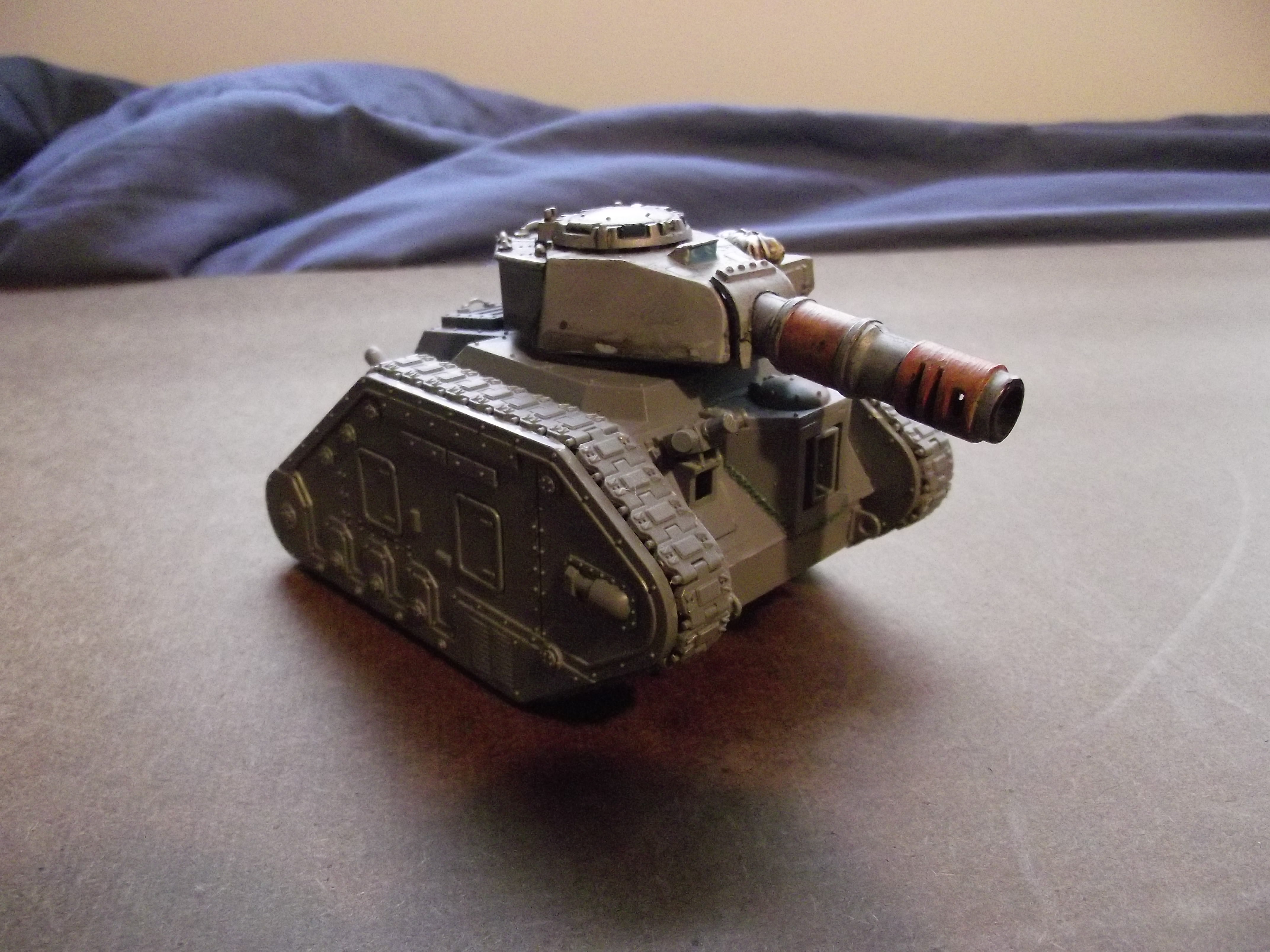 Update time again! I hope to have another one up sunday, as I have a lot of free time to get some painting (and gaming) in. As for now, I spent this morning converting one of the turrests on a tank. Im not a huge fan of the varient so I swapped out the gun on the turret (with some open turret surgery). I also converted a new hull mounted lascannon in place of the heavy flamer that used to be there. I also managed to finish up another vanquisher (with a 3rd in the mail now).