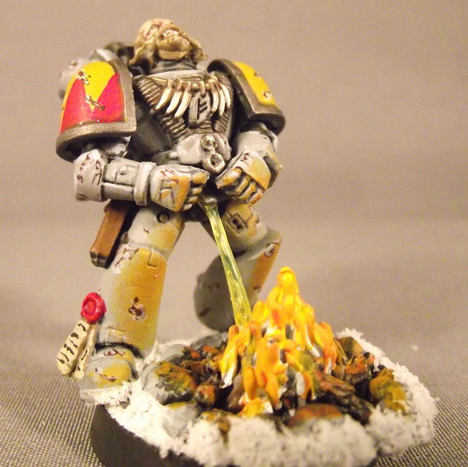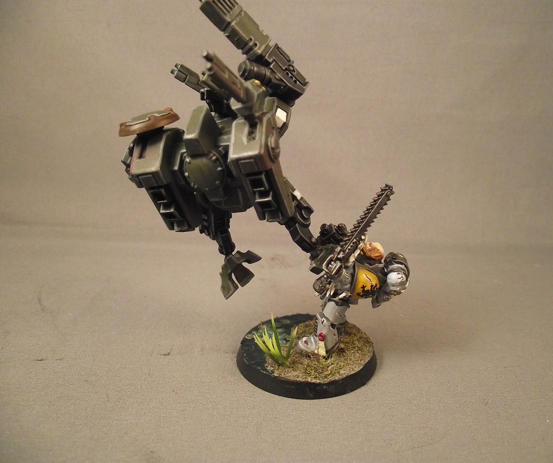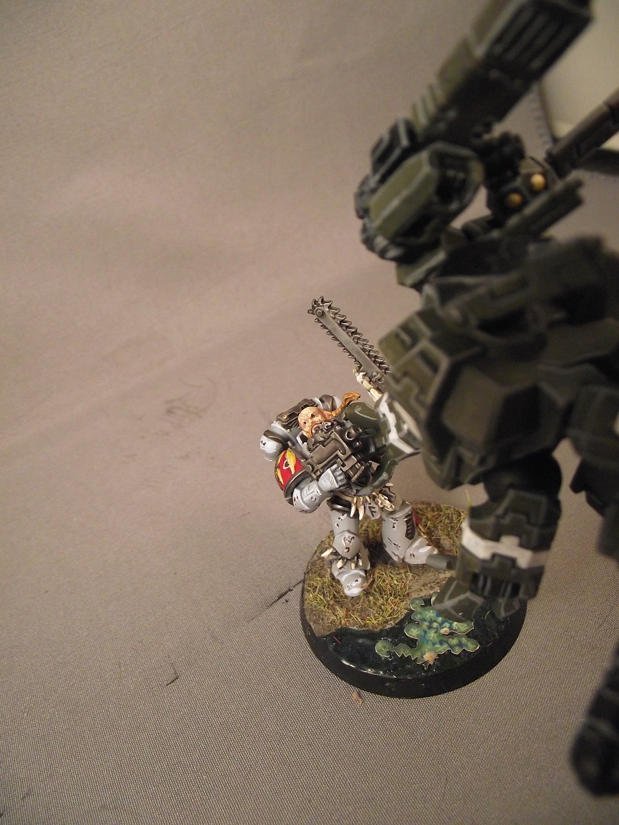 Looks much better with the change. Looks actually dynamic now rather then like you glued a marine to the foot of a normal suit. Now he looks like he is ready for business. Automatically Appended Next Post: It might look even better if the arms were reversed with the left arm pointed at the victim and the right up in the are if you make another one. Then you could drill a hole right through the head of the marine to show how dead he is.