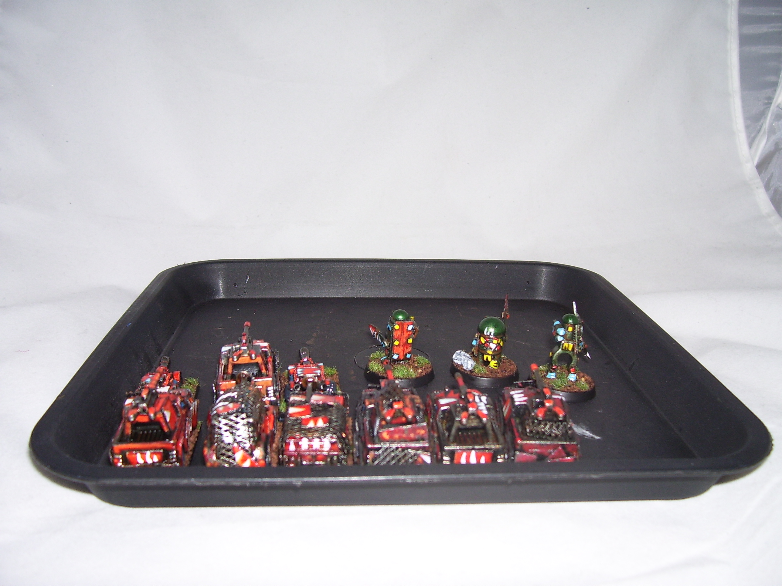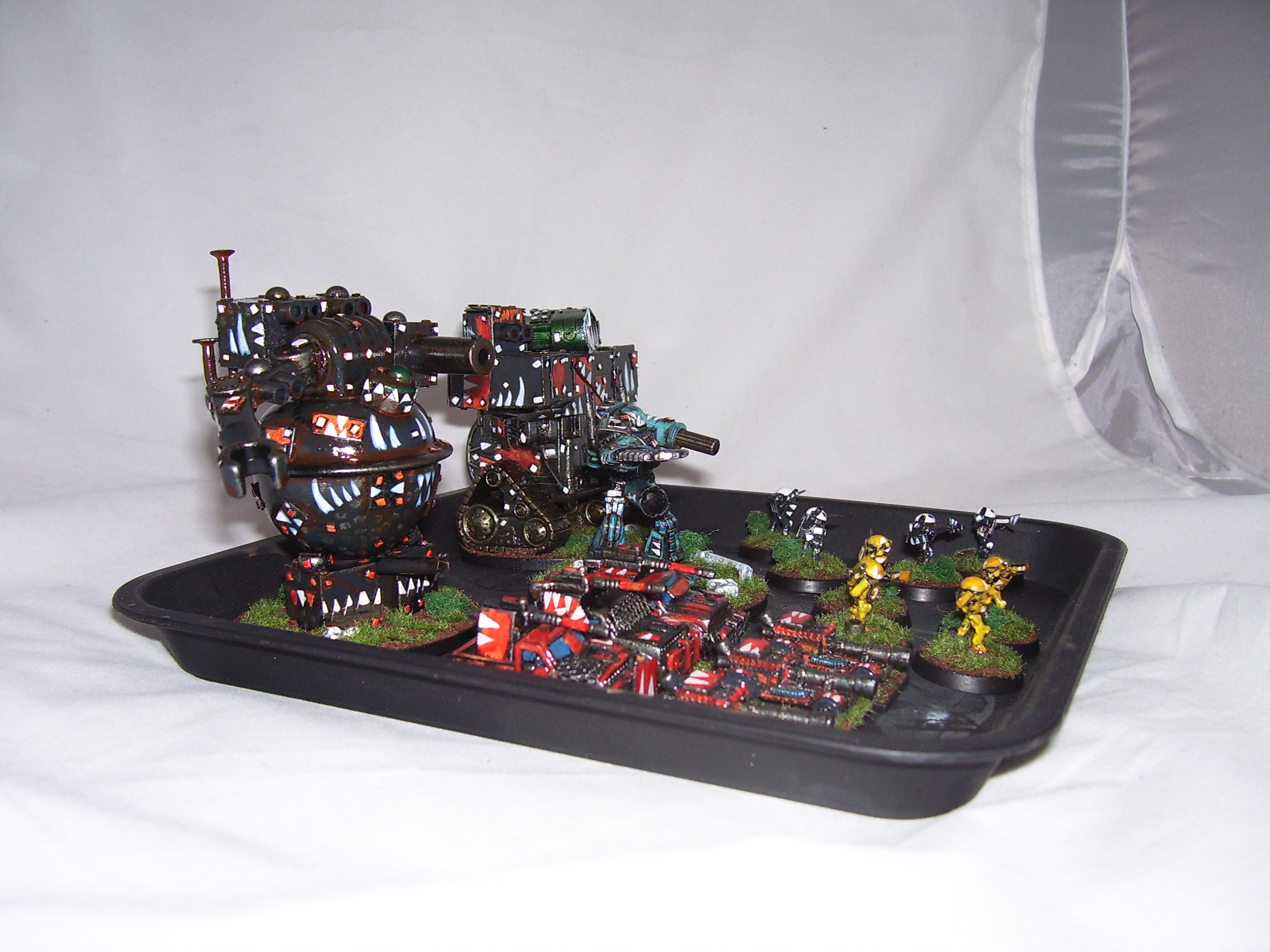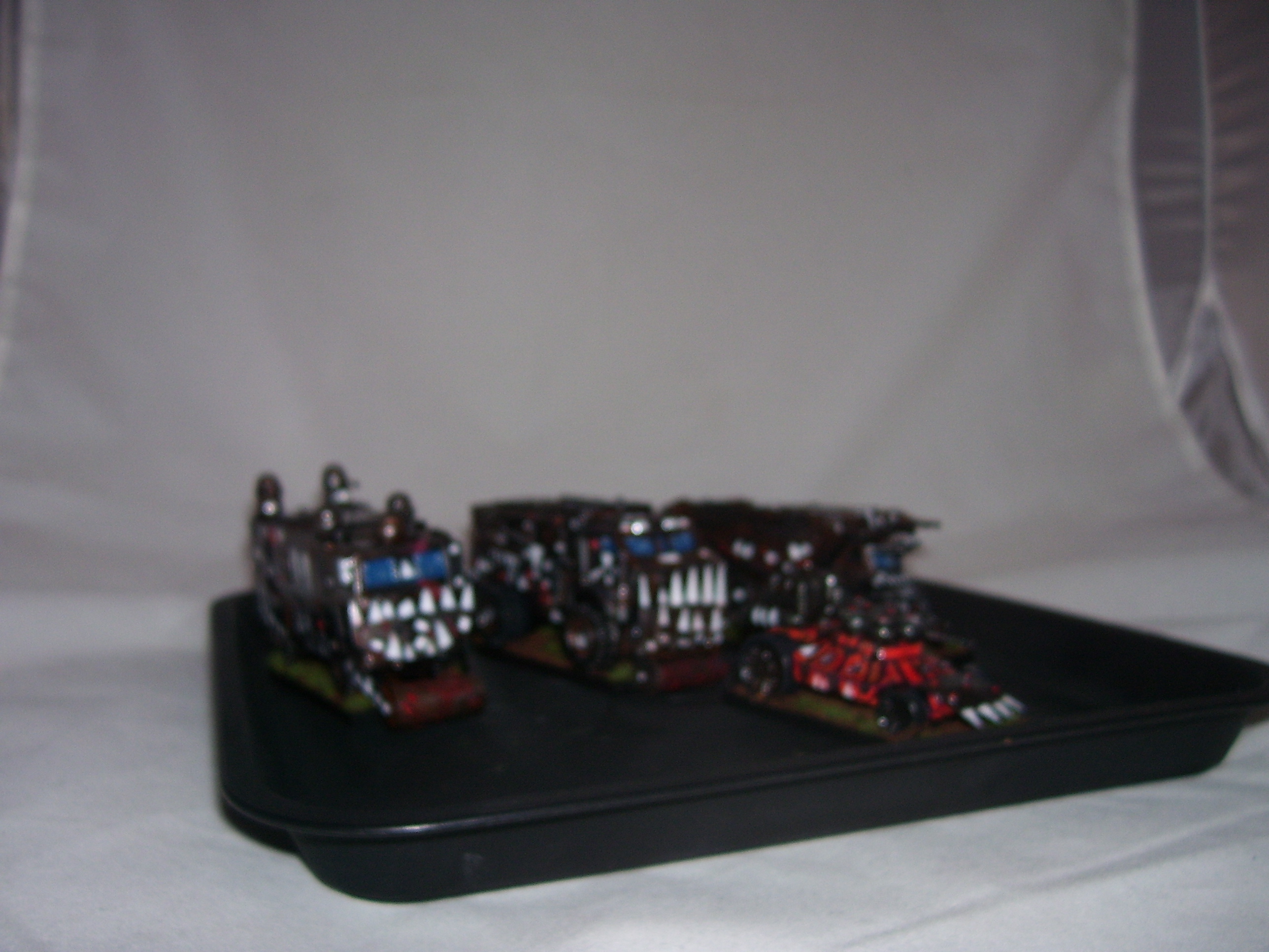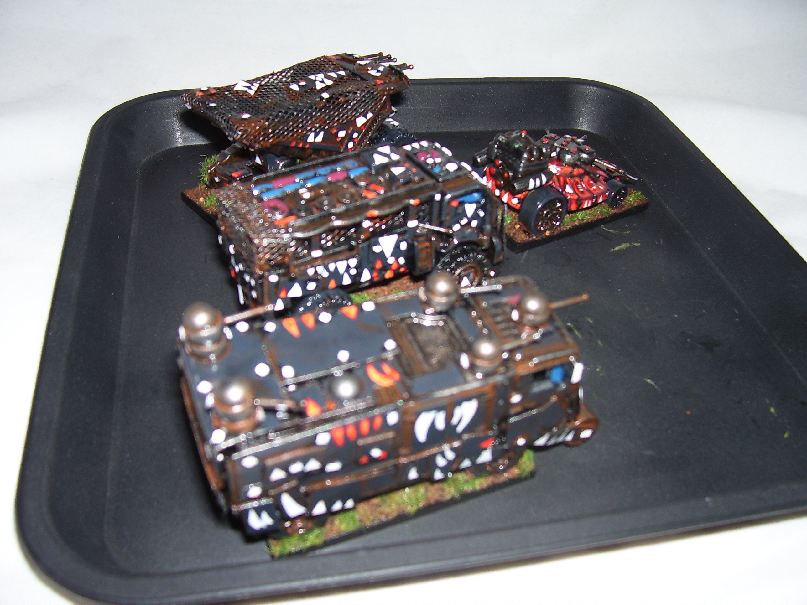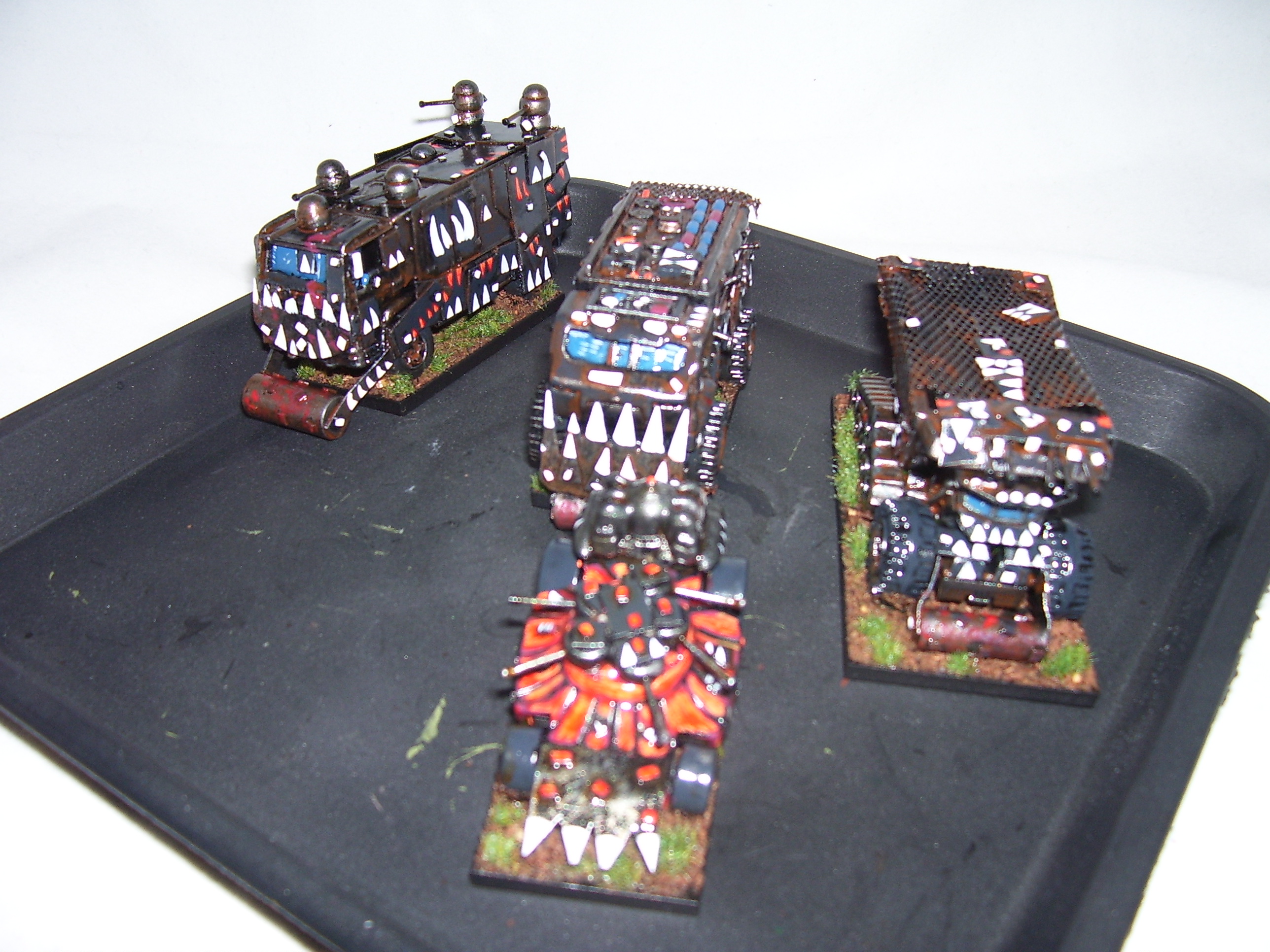 Very cool, I love the detailing on the battlewagons. Think they look a lot more retro-Ork in their style than the later 40k type designs, if you don't mind me saying (i.e. not everything looking like it is made out of sheet metal randomly hammered together and would fall apart immediately)