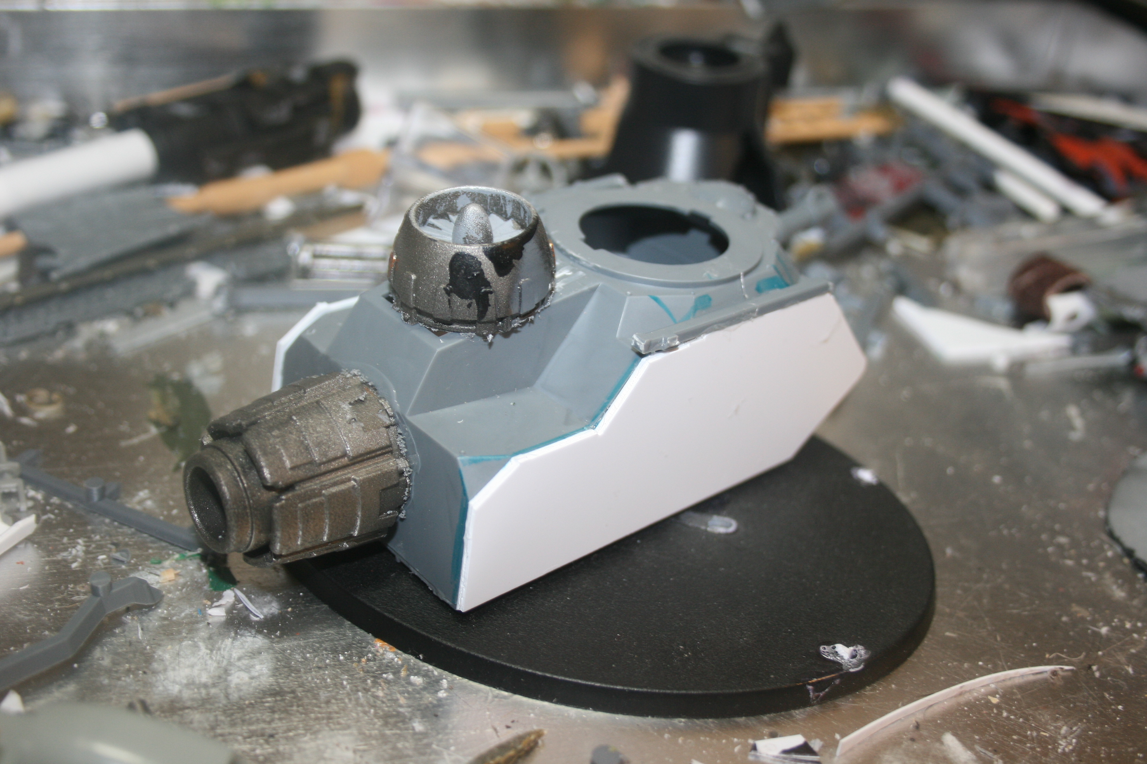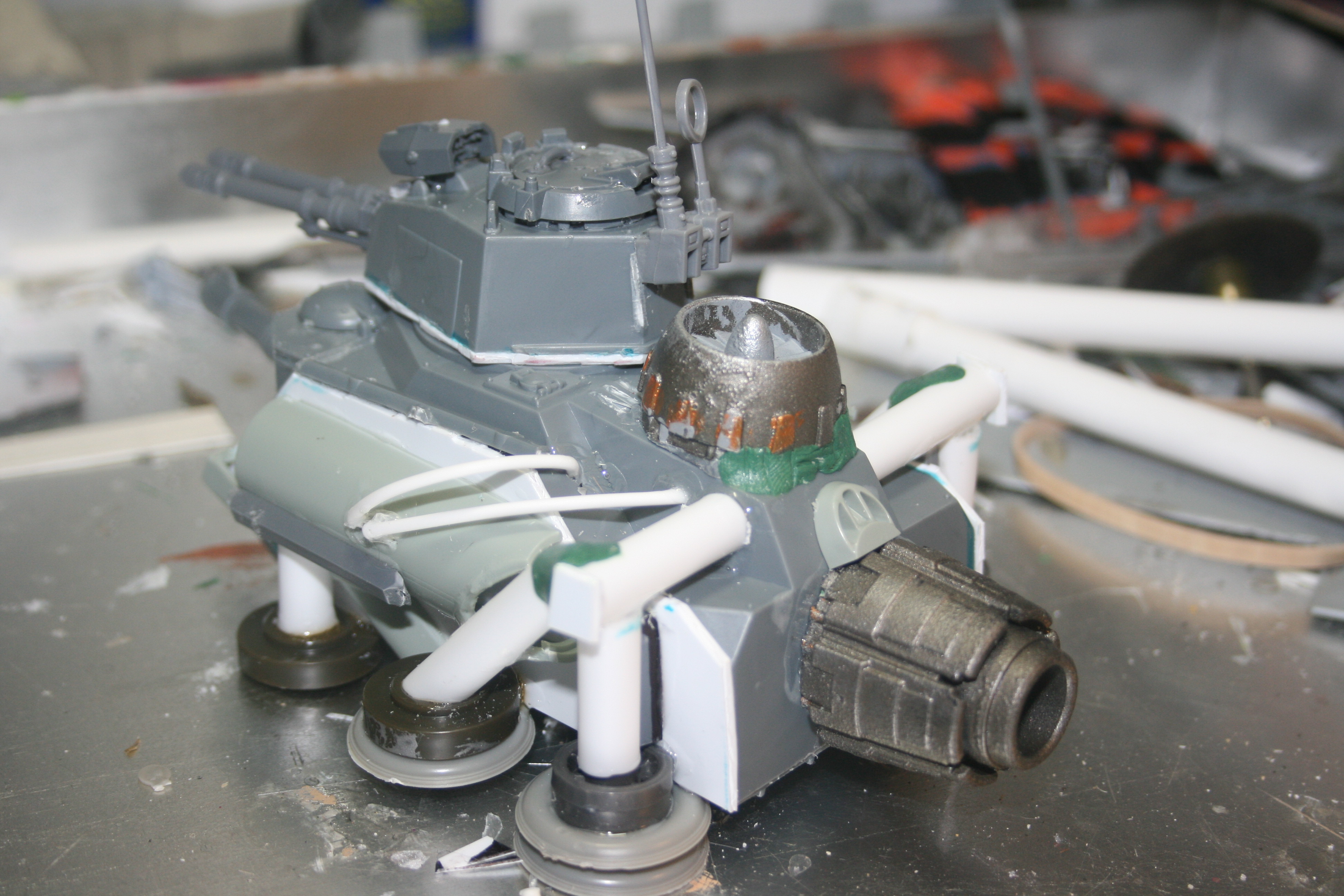 The Grav Russ is coming along. It now only needs some heavy bolter sponsons akin to a predator (suspended machine guns as opposed to traditional sponsons), and the base needs to be applied to give it the hovering quality, (either that or i go and find a small clear base like other hover tanks)