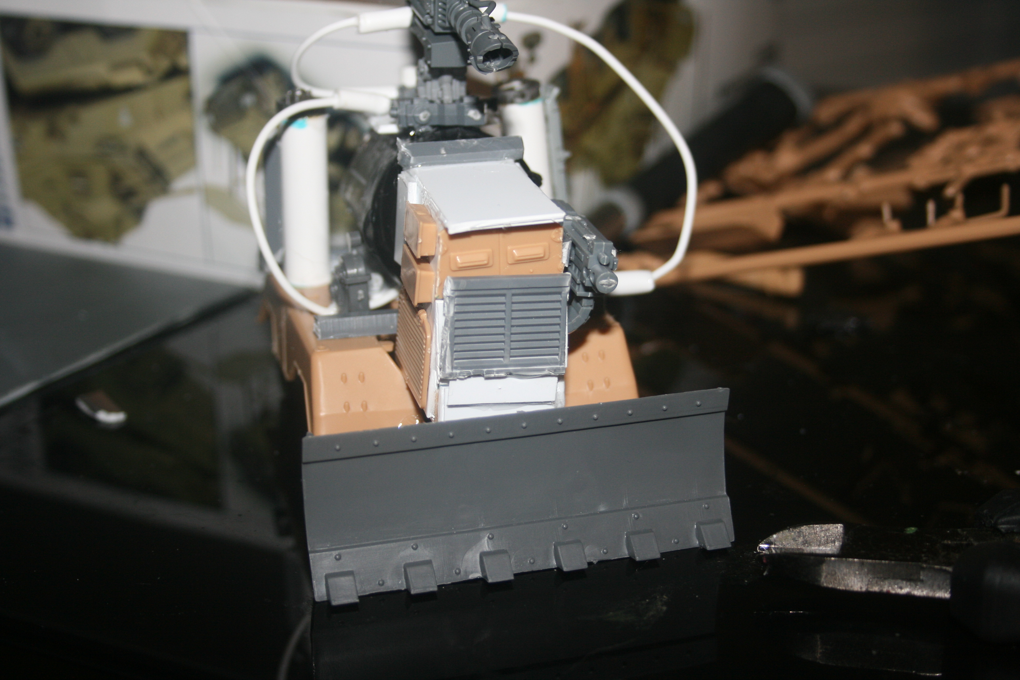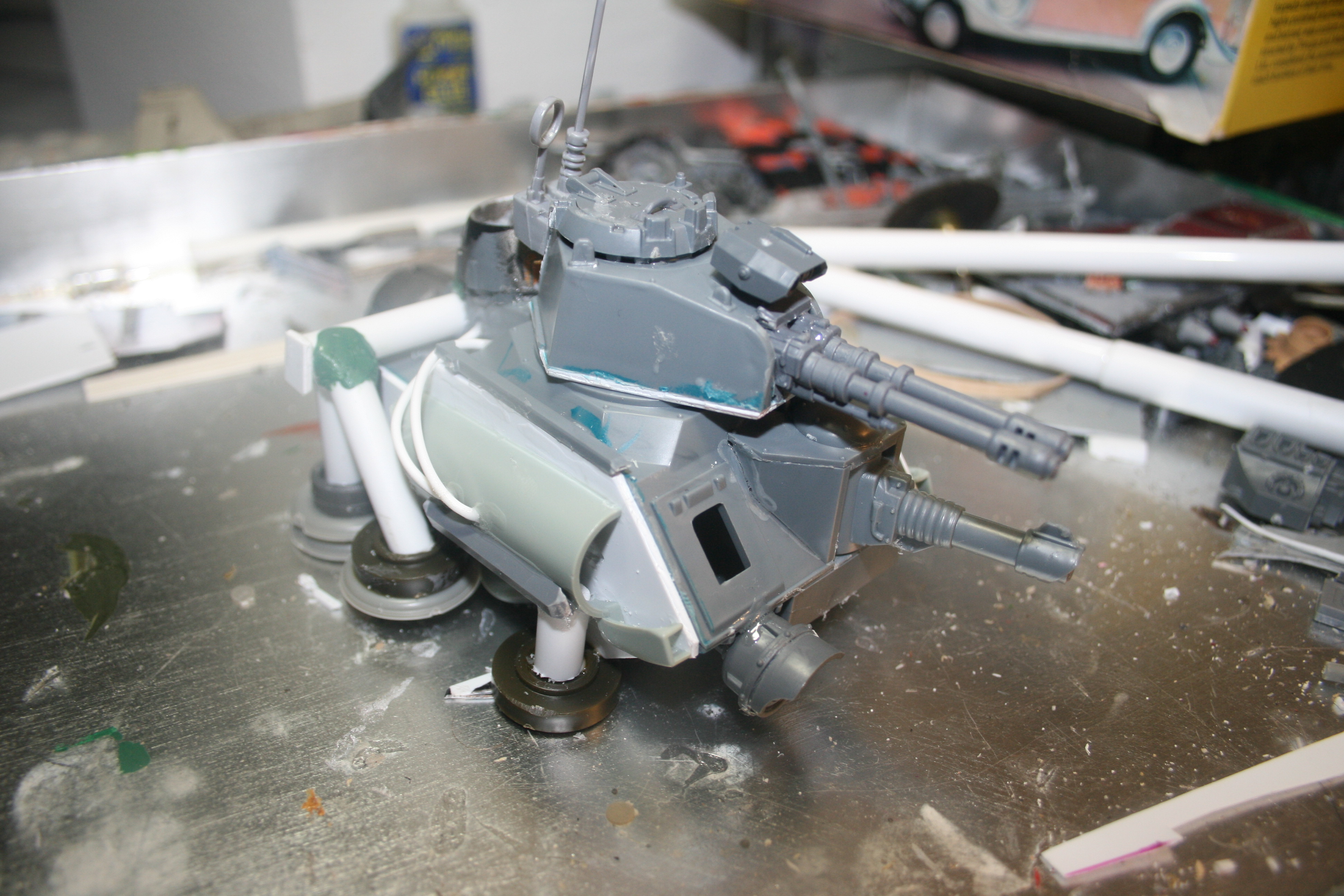 Disasemble a Rhino (or a Chimera if i could get one) and give it hover abilitys and on the rear a huge quad pair of large energy cannons. on the rear of the cannons could be large battery like objects (the charges to fire the guns which would be like the 4 shot limit of a Manticore)