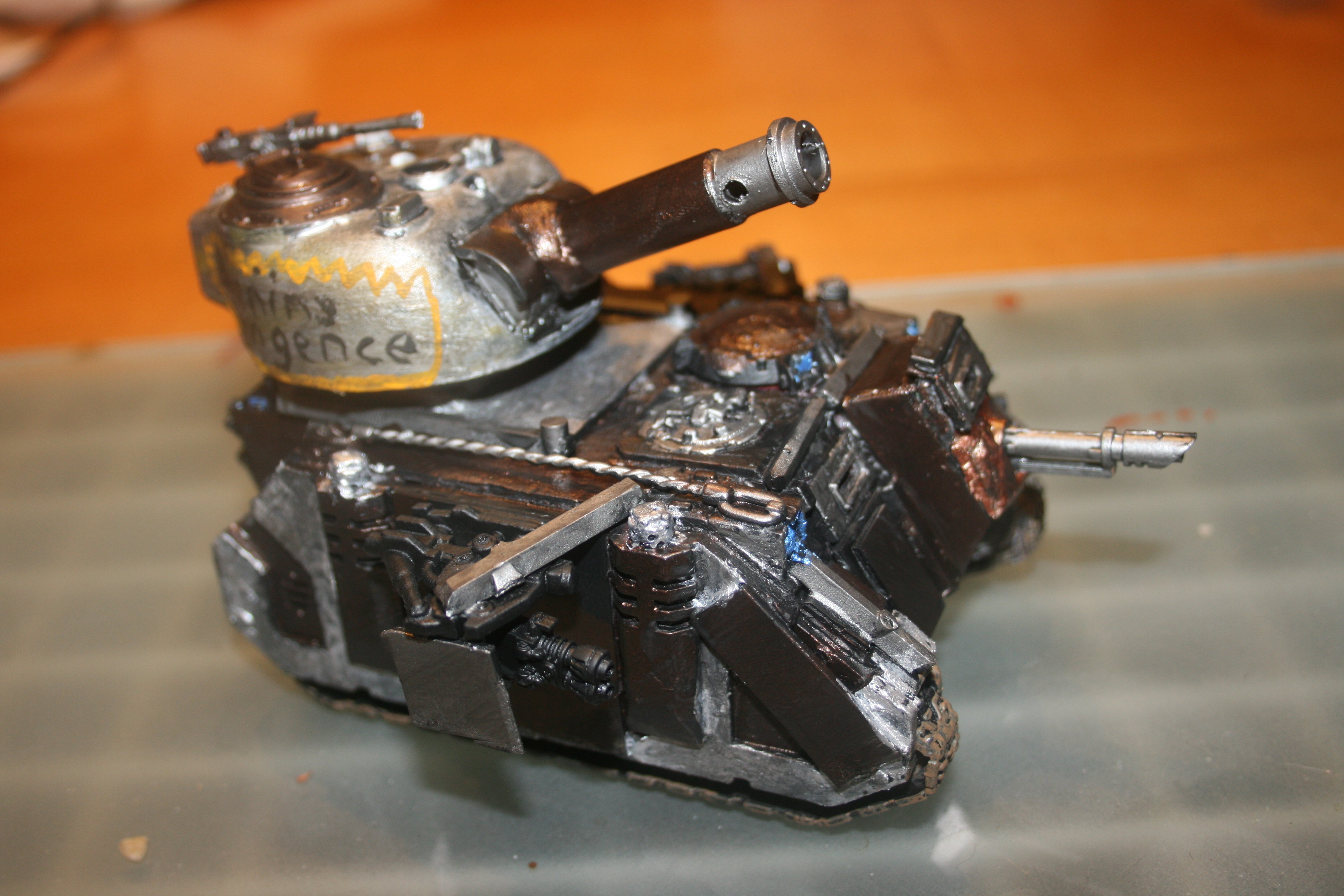 Rhino-Russ Demolisher: The Rhino turned Leman Russ Demolisher was captured during a battle against renegade Vostroyians in the Terraxus Campaign. initially it was in extreamly poor shape. Its turret could not turn and the front las cannon was simply wedged into a hole cut into the hull. the 91st riped the Rhino apart and promptly rebuilt the tank. The result was a Leman Russ Demolisher in every way beyond the chassis it used (the Rhino). frontal armor plates were added to deflect the heaviest fire and a equally thick turret (that could actulyl spin) mounting a Demolisher Cannon and more modifications turned a Traitors desprate attempt at making a Siege Tank into a full fledged war machine with the name of "Burning Vengence" that fights for the Emporer.