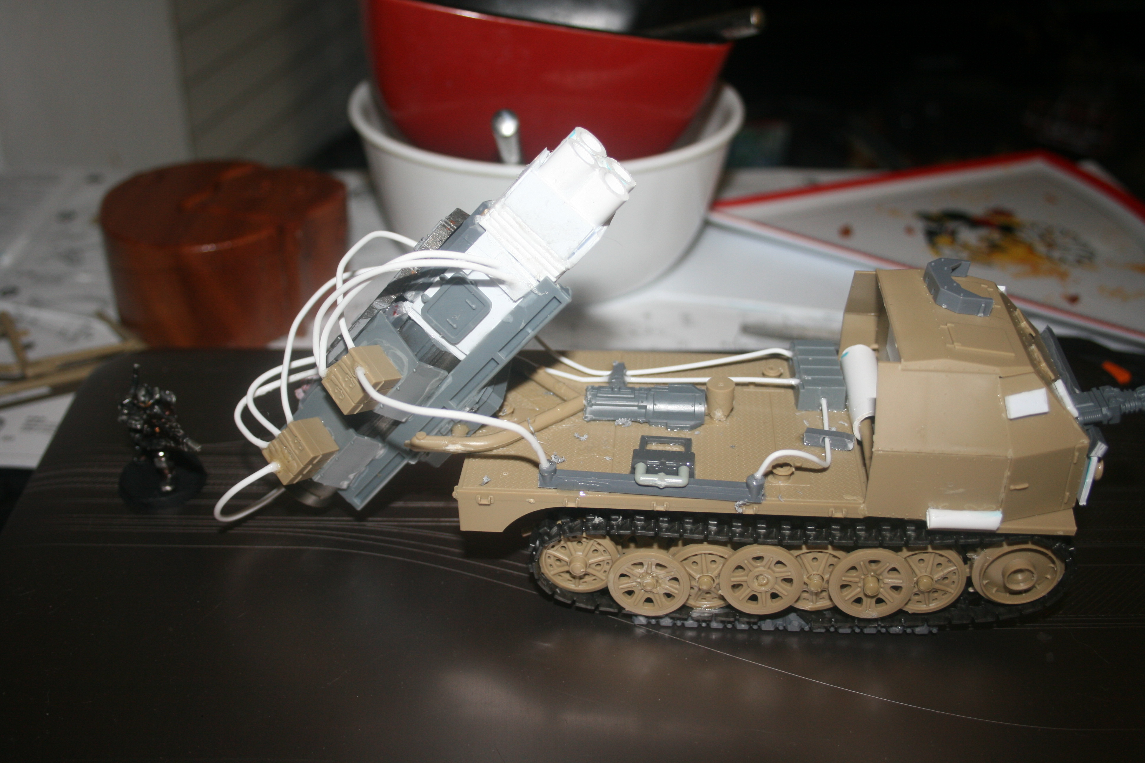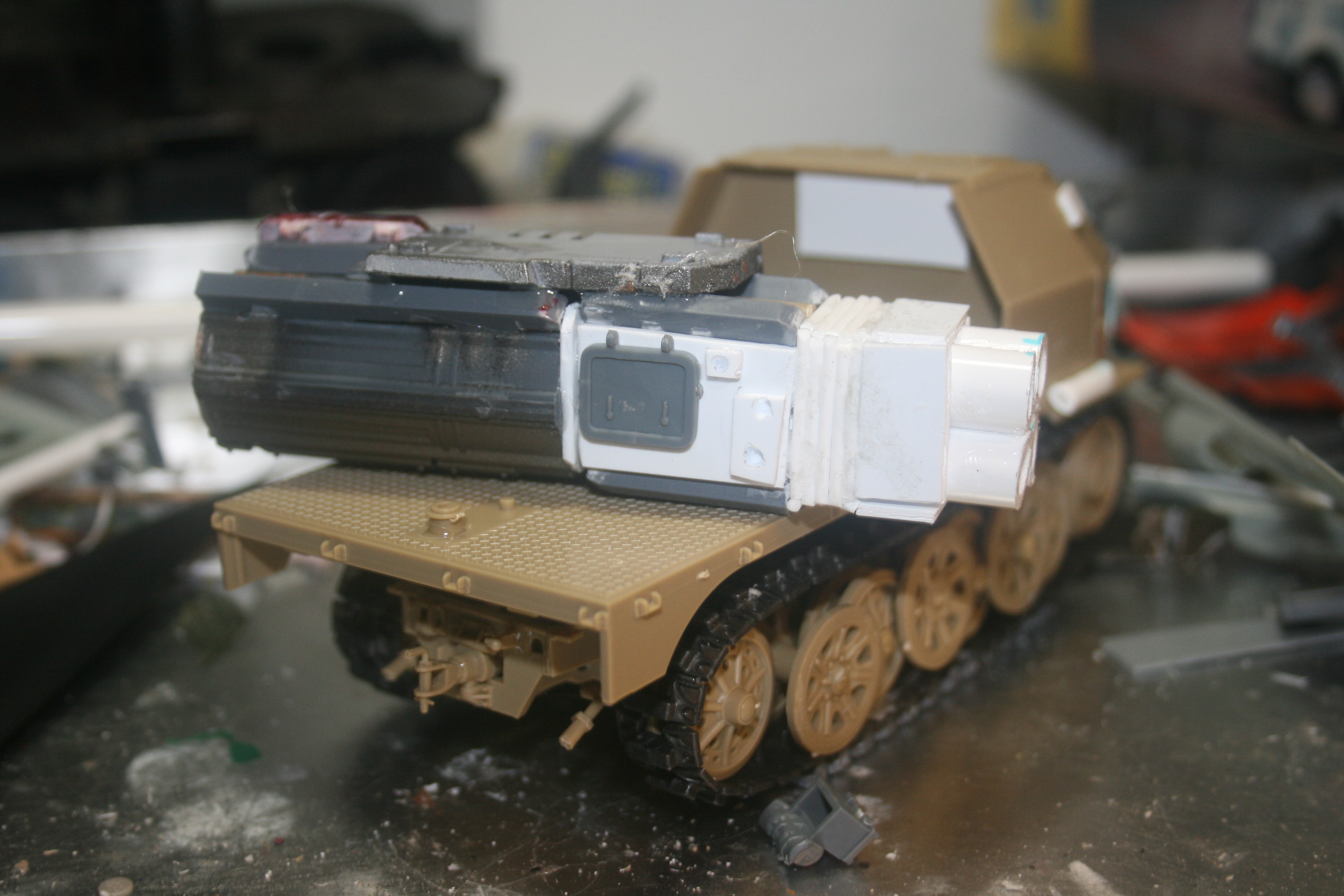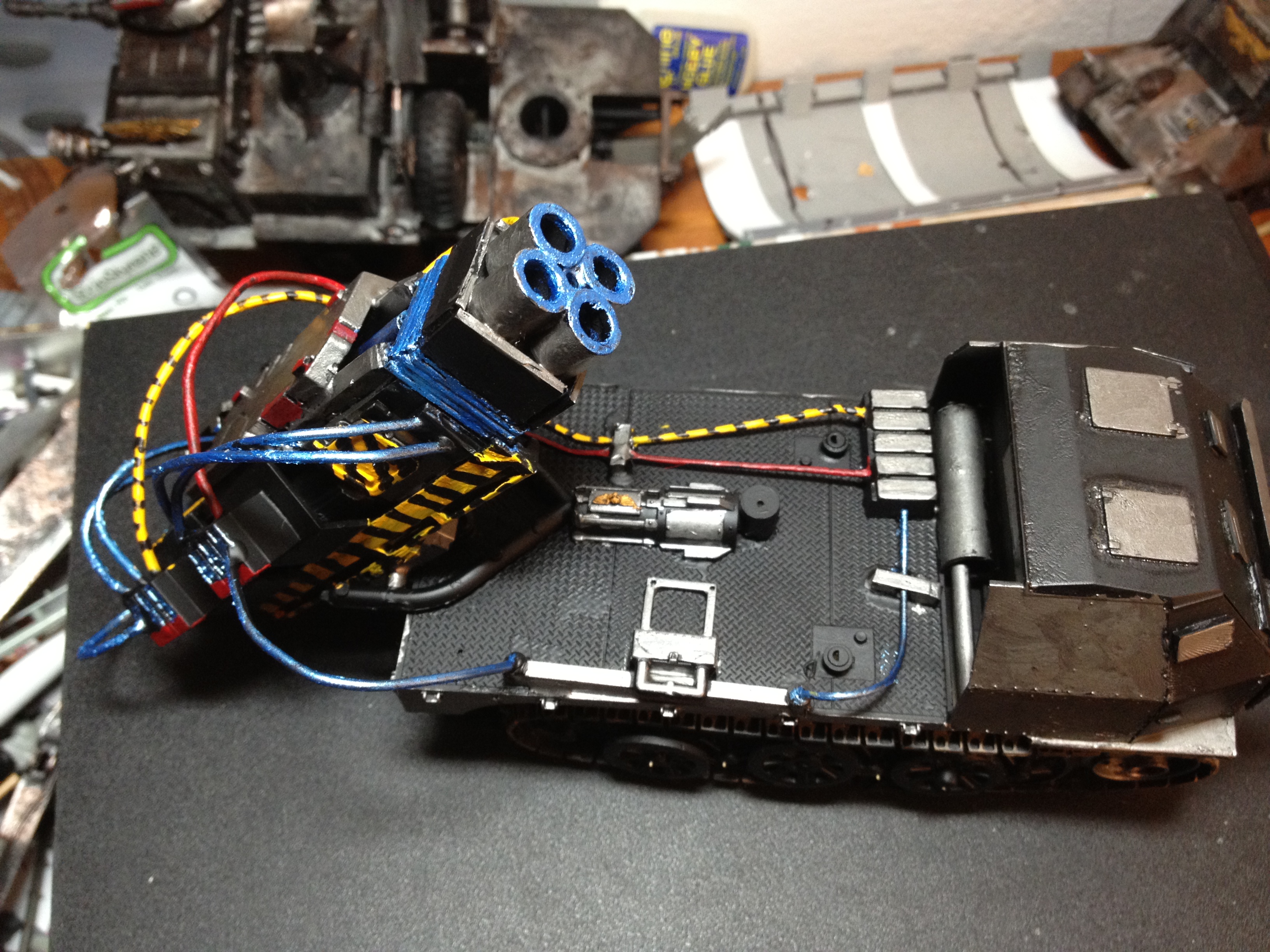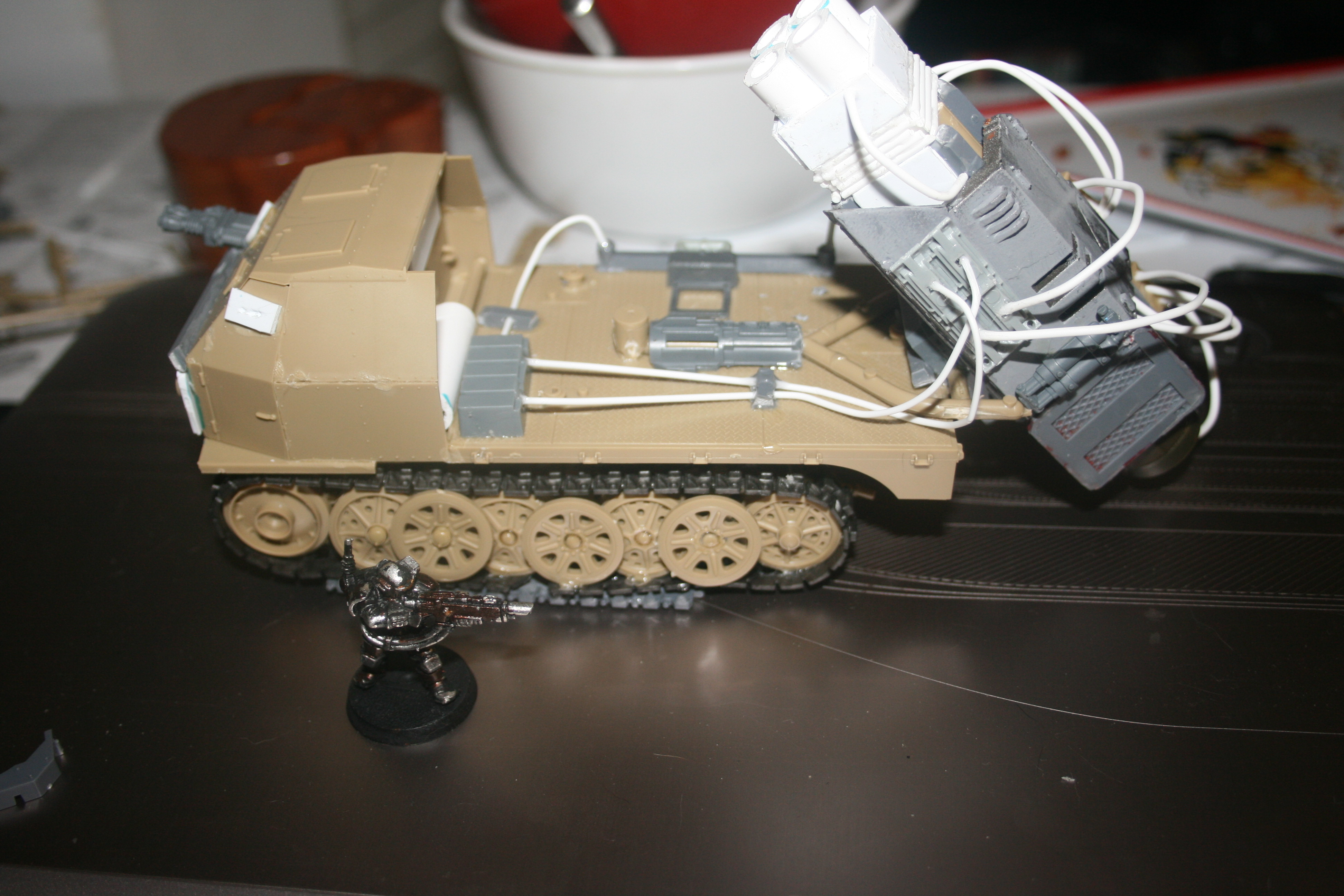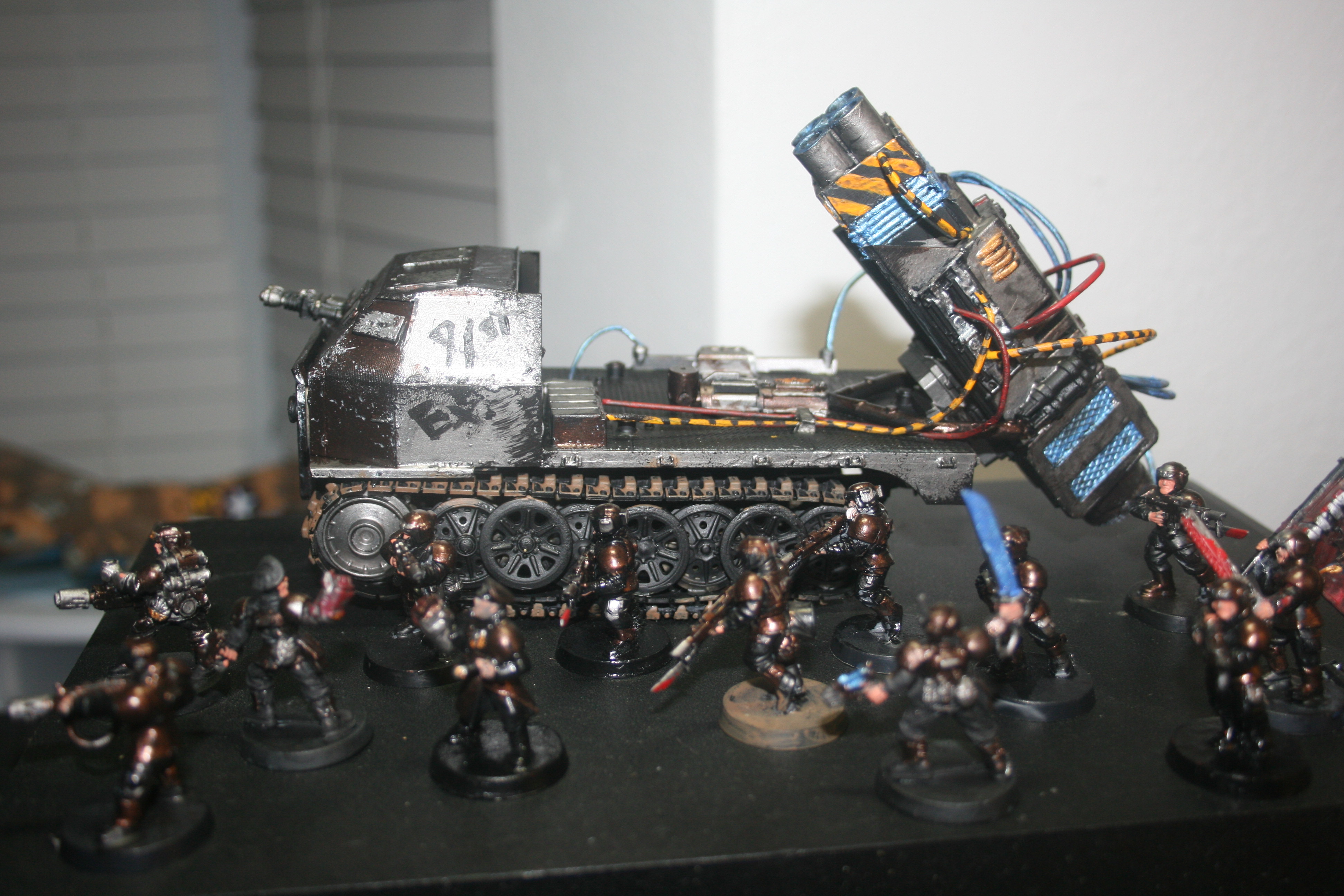 not sure whats next. Probly an ork Trukk beaten into a Manticore with 4 large tubes on its rear for the Launcher. with the crew compartment made "clean" and square with a heavy bolter.