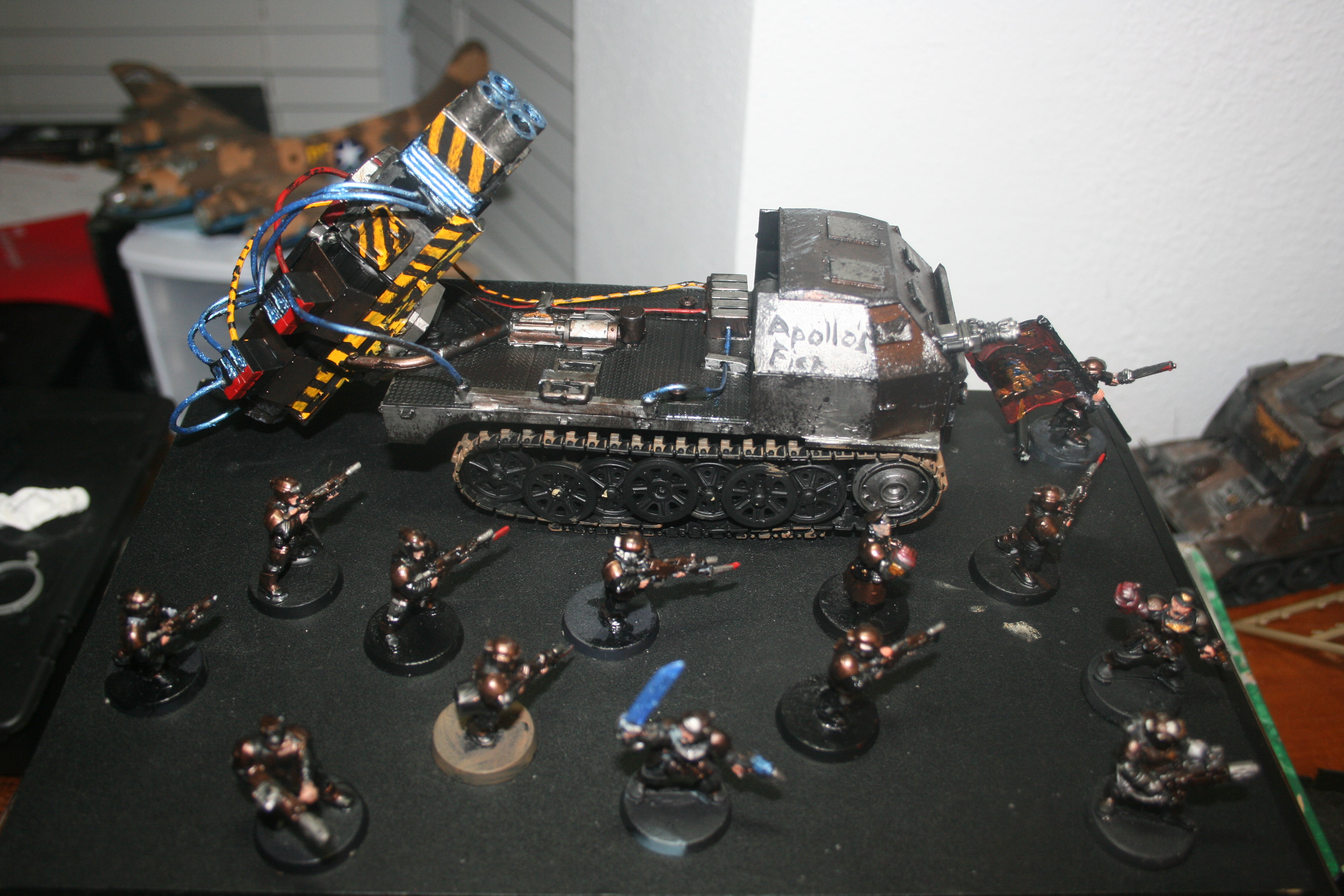 The "Plasma Flare Manticore" is still getting worked on. used a cheap Half-track chassis then cut off the front end (the truck hood) to make it all tracked and covered up the hole it left with a Rhino door acting as the radiator and plasicard as front armor. Heavy flamer on the front as well.