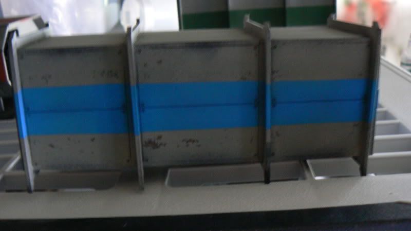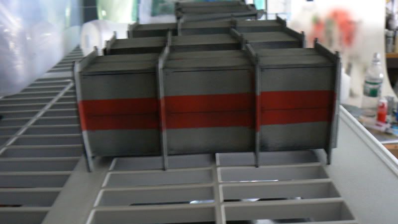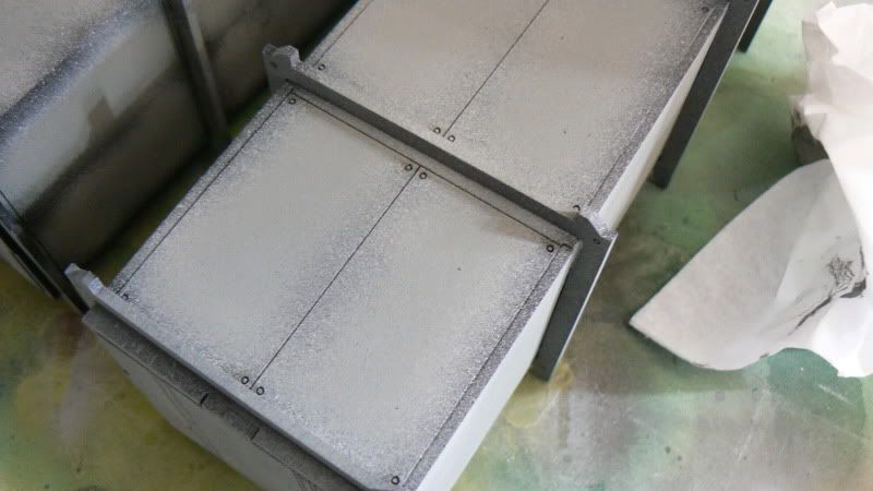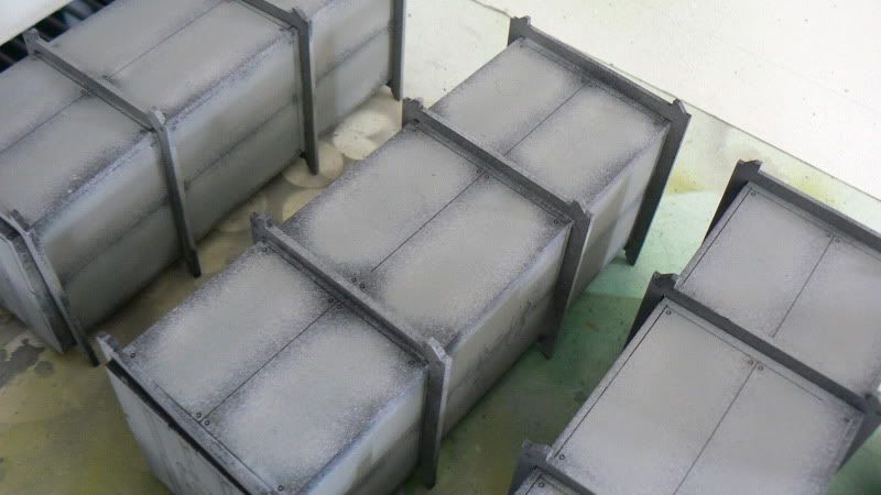 I've started on base graying the next lot of structures. 2 "bus shelters" four silos, and a large silo.