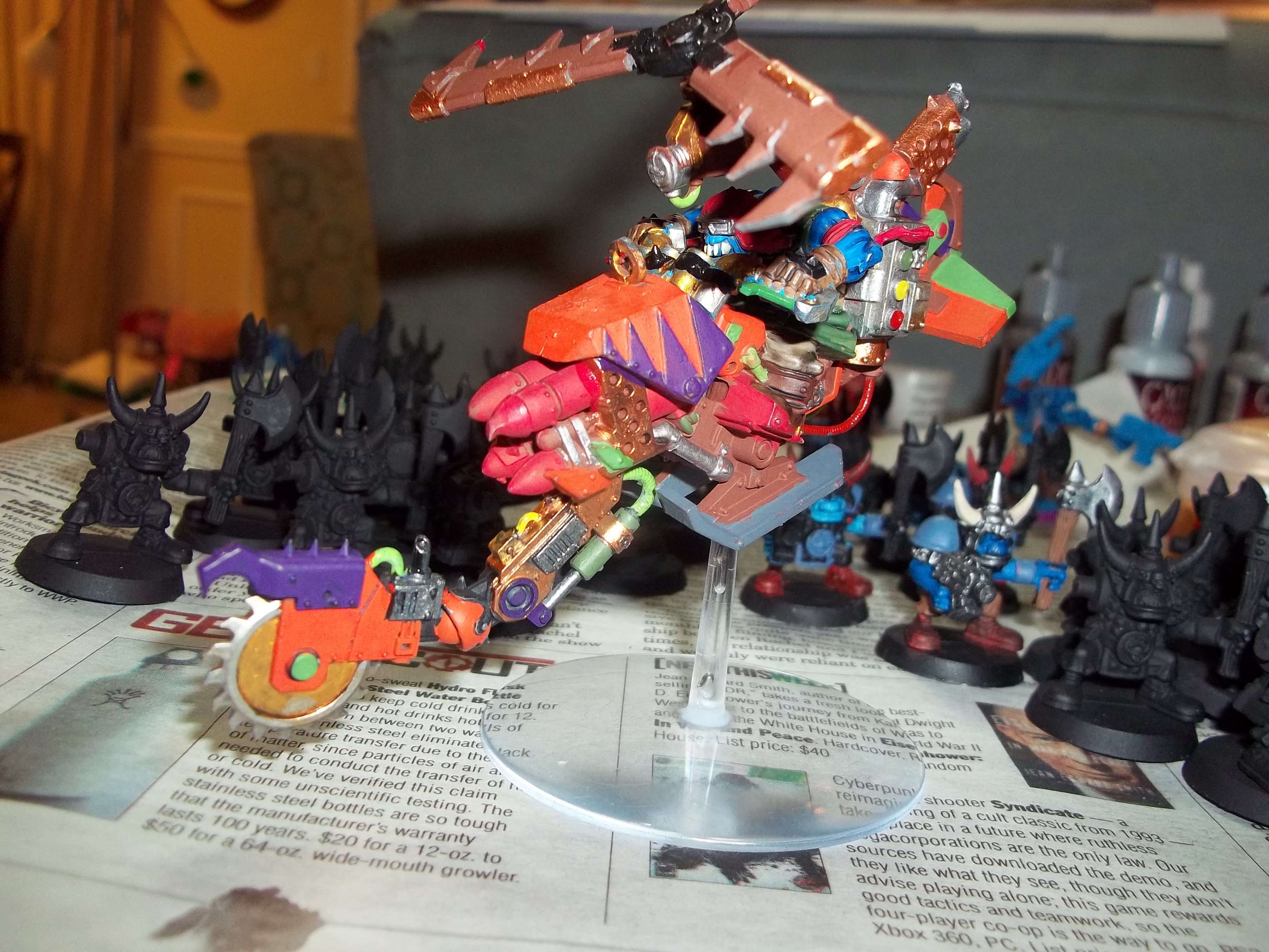 Been a while since I have posted any progress. Well, the army is almost complete, just a few boys to paint up, Kommandos that we made from the boyz box and a bunch of extra stick bombs laying around in the bits drawer. Needless to say, daughter saw the new ork flyer, and, I liked it to. So, here are the pics of the work in progress. Battle wagon there for comparison of what the other vehicle in the army looks like.