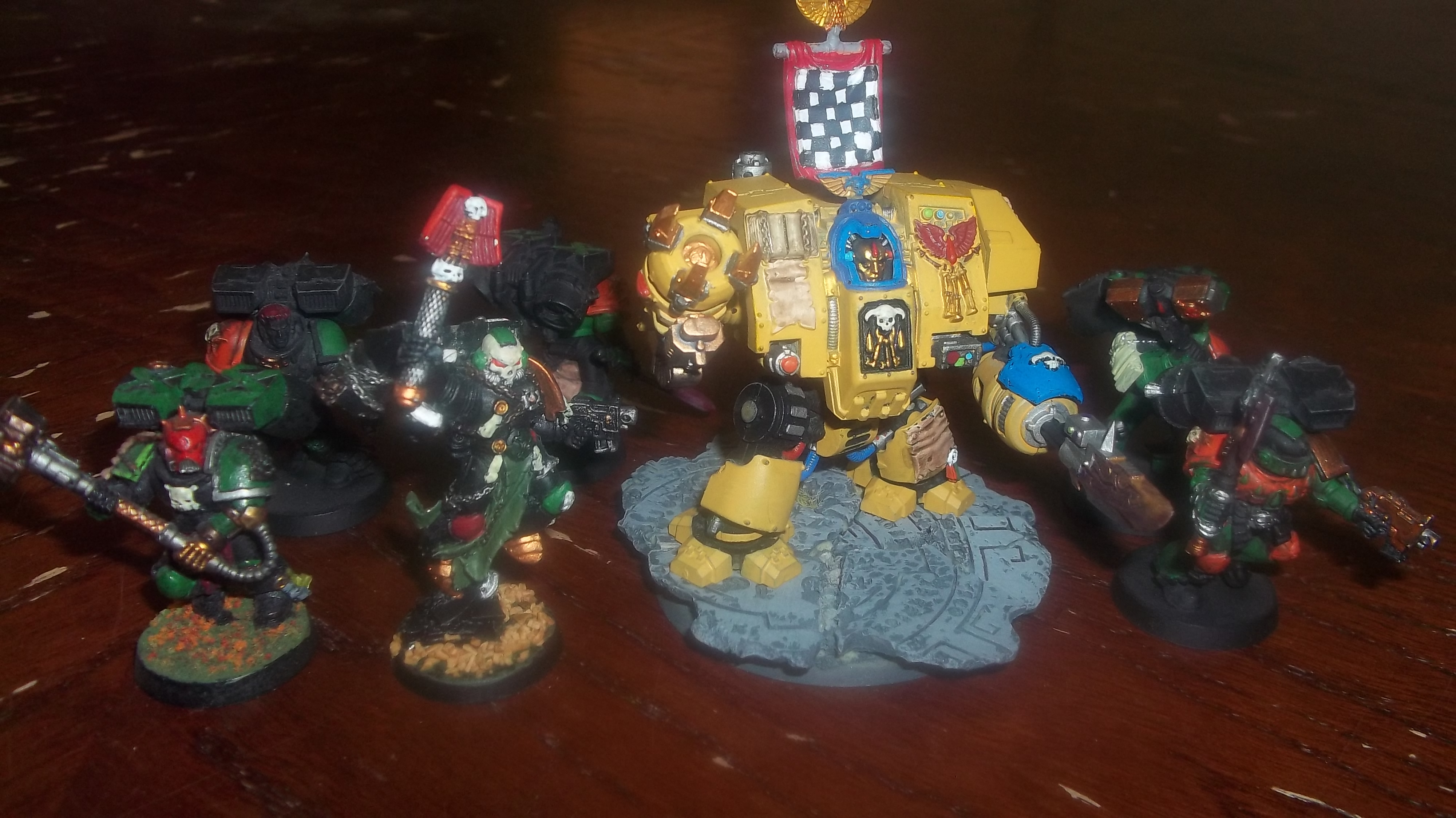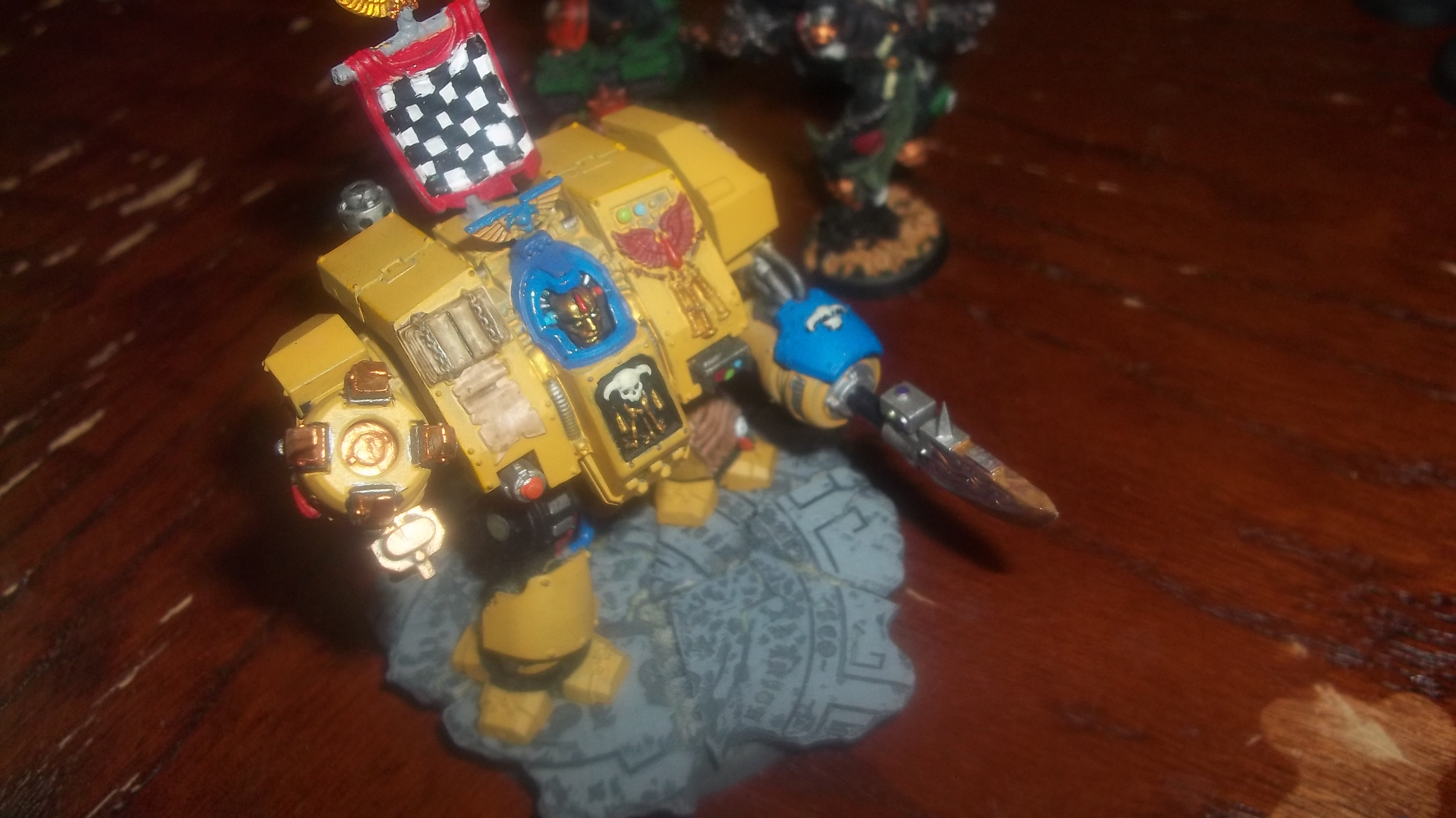 I wanted to build and use a furioso librarian dread, I just thing the model looks good. However, didn't realy want it to be blood angels, see too much of that here. So, started looking at the successor chapters. They all look too alike except for the Lamenters, so, went with that. Yellow is difficult to paint, glad that kit comes with extra parts to practice on. The checkerboard was the first time even trying that. Didn't want to do the checkerboard on the arms/shoulders, so, the banner worked great for that. Those are my salamander veteran vanguard and chaplain with him. Sort of a Death Watch style army I might make up, for kill team games and such.