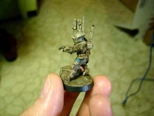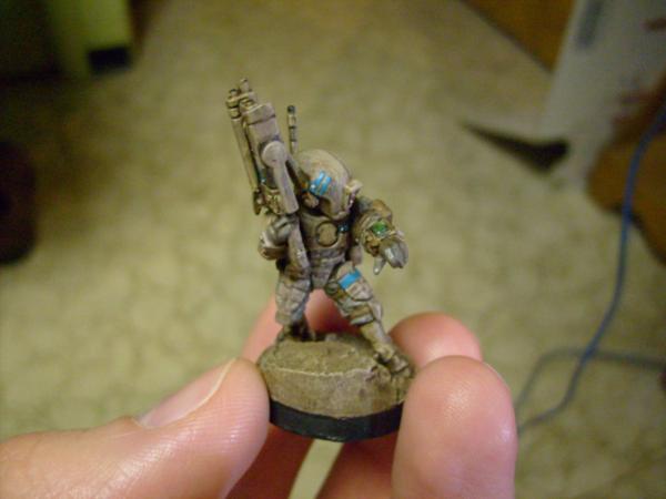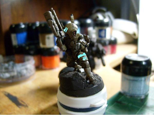 After reading all the comments I went to work on test paint Pathfinder when I got home from work. So I added more color and a few squad/army/rank markings. The color I decided on is the P3 Meredius Blue which is very close to GW Hawk Turquoise. There is five markings and four of them are squad rank markings. There are two on the helmet, one on the chest and the last on the outside of the carbine. Finally I colored in a segment of his left thigh armor for the army color which will go through out the army.