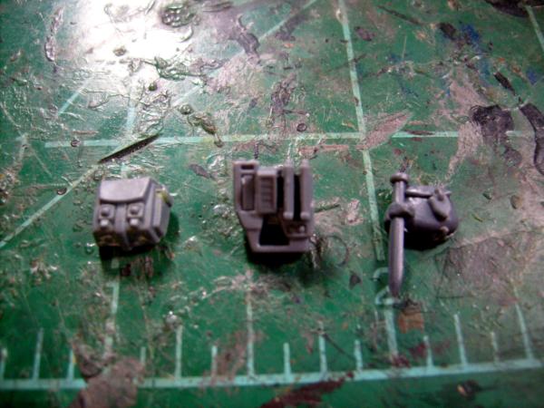 A quick update for tonight. I have started painting my XV-8 Suicide Crisis Battlesuit's base. Most likely won't get it done tonight since I started pretty late. However, as I was getting some fresh water in my paint cup I had an idea about my Fire Warriors that I need to build. The Pathfinders and the Fire Warriors both have 4+ saves but the Pathfinders are running around without those power pack looking back packs. Why? The Pathfinders have heavy equipment, carbines with grenade launchers and still have the same save as a Fire Warrior with a power pack. Do Pulse Rifles use that much more energy that they need a Ghostbuster's proton pack. Most likely not. It was most likely someone at GW thought a smaller model would look like a scout so they scrapped the power pack. My thinking is why should the Fire Warriors have equipment that honestly doesn't make sense when all they do is fly around in their heavy purple heart boxes, jump out to shoot and then clamber back in just to repeat it all over again. And on the off chance that they have to squat on an objective or most likely, knock out of their fish shouldn't they have some basic field equipment. So along those lines I hit my bitz box for stowage equipment for the Fire Warriors. So here is a picture of my idea of replacing the power packs: (Sorry for the blur) Ok, the center is the power pack that is on the normal Fire Warrior. The one on the right is the equipment bag/back pack I am using for my Pathfinders. The one on the left is my idea for the replacement of the Fire Warriors power pack. It is roughly the same size of the Pathfinders back pack and it covers all the same space as the Fire Warrior power pack. So, what do you think? Fire Warrior Power pack or the Replacement Backpack? Thanks for reading and C&C is always welcome. Your ideas are what make this project better.