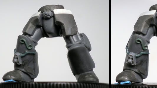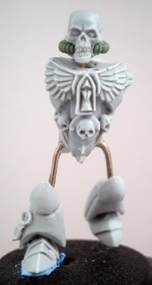 I didn't want the head to be leaned over like that, and removing it was something of a PITA. Luckily, with my new tube making tool, I was able to replace the badly cast tubes on the sides of his face. The feet were removed from the lower legs and repositioned, and I decided to do way with the thighs because they were also badly pockmarked. I'm not sure what I'm going to do about the arms yet, but the general idea I have for this Chaplain is something reminiscent of the Grim Reaper. He'll have a hooded robe, maybe tattered and blowing in the wind.