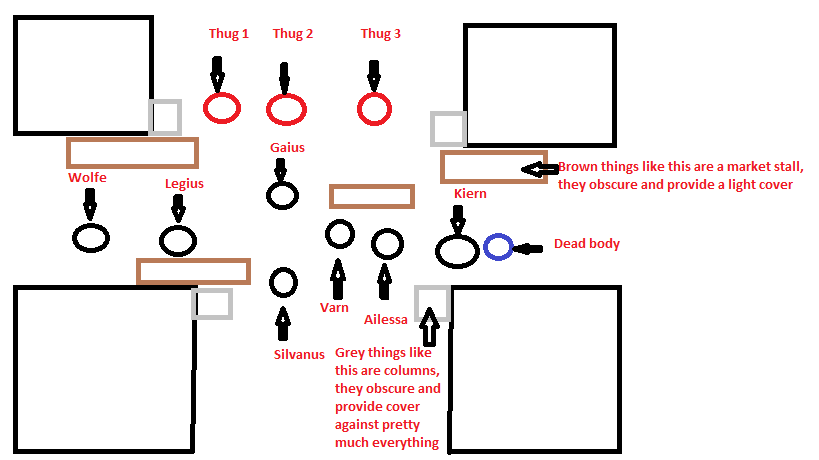[ GM's note; Initiative Order for the coming scuffle Kiern - 13 Gaius - 11 Thug 1 - 10 Legius - 9 Wolfe - 7 Silvanus - 7 Varn - 6 Thug 2 - 5 Ailessa - 4 Thug 3 - 3 Lets not break the posting order until its over. Good luck] The crazed man remains in a ball on the ground, unmoving and bleeding heavily. The three thugs are 20 metres away, the crowd having dispersed almost completely. They are approaching the group spaced about 5 metres apart, stub revolvers drawn and pointed at the party. Kiern was leading the party through the crowd, and is therefore about 30m from the thugs. The rest of the group is relatively bunched up, Silvanus on the far side of the group from the thugs watching that flank, Gaius on the close side to the thugs (so he's 20m away) and Wolfe, unable to shake the habits of his time in the military, was ass end arnold and is about 30m from the thugs.