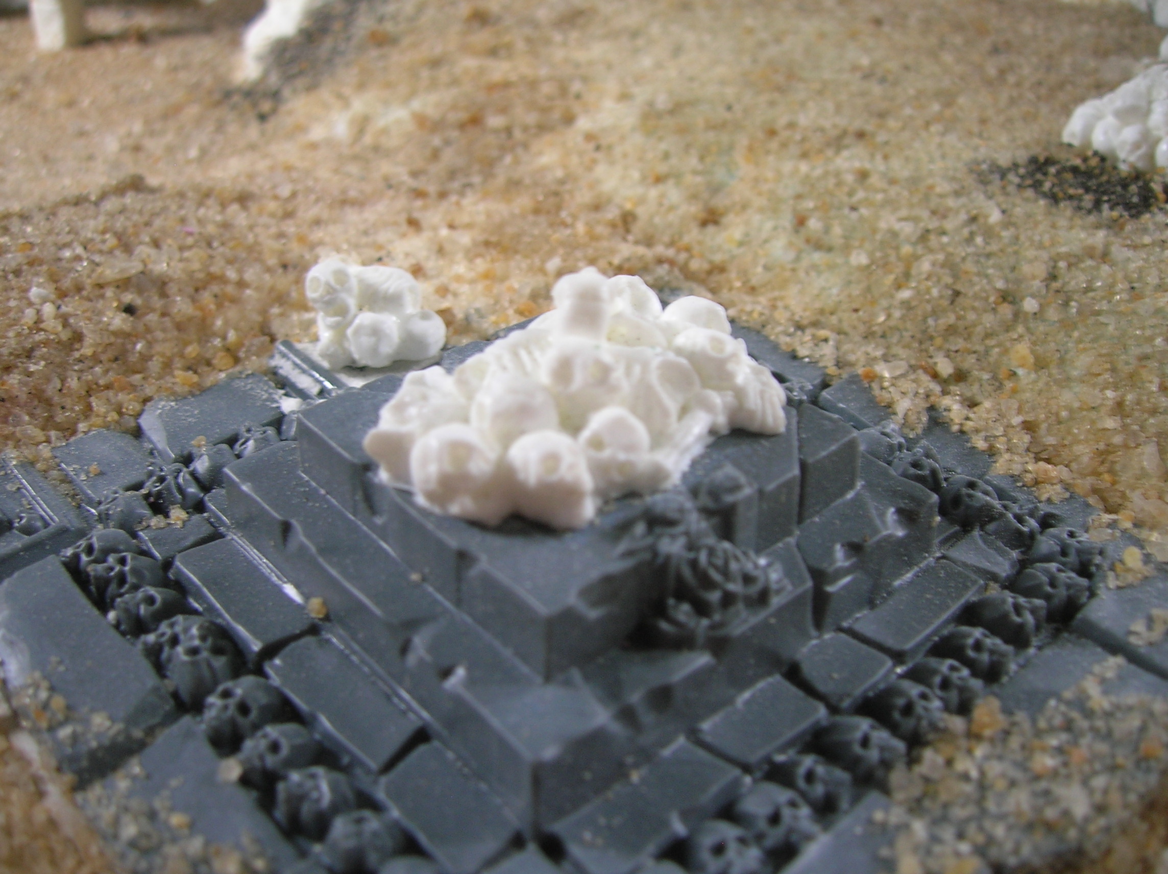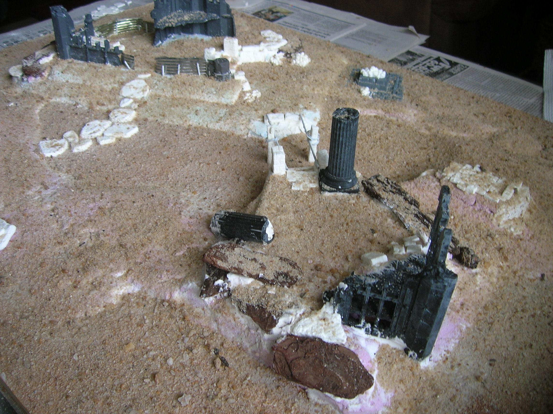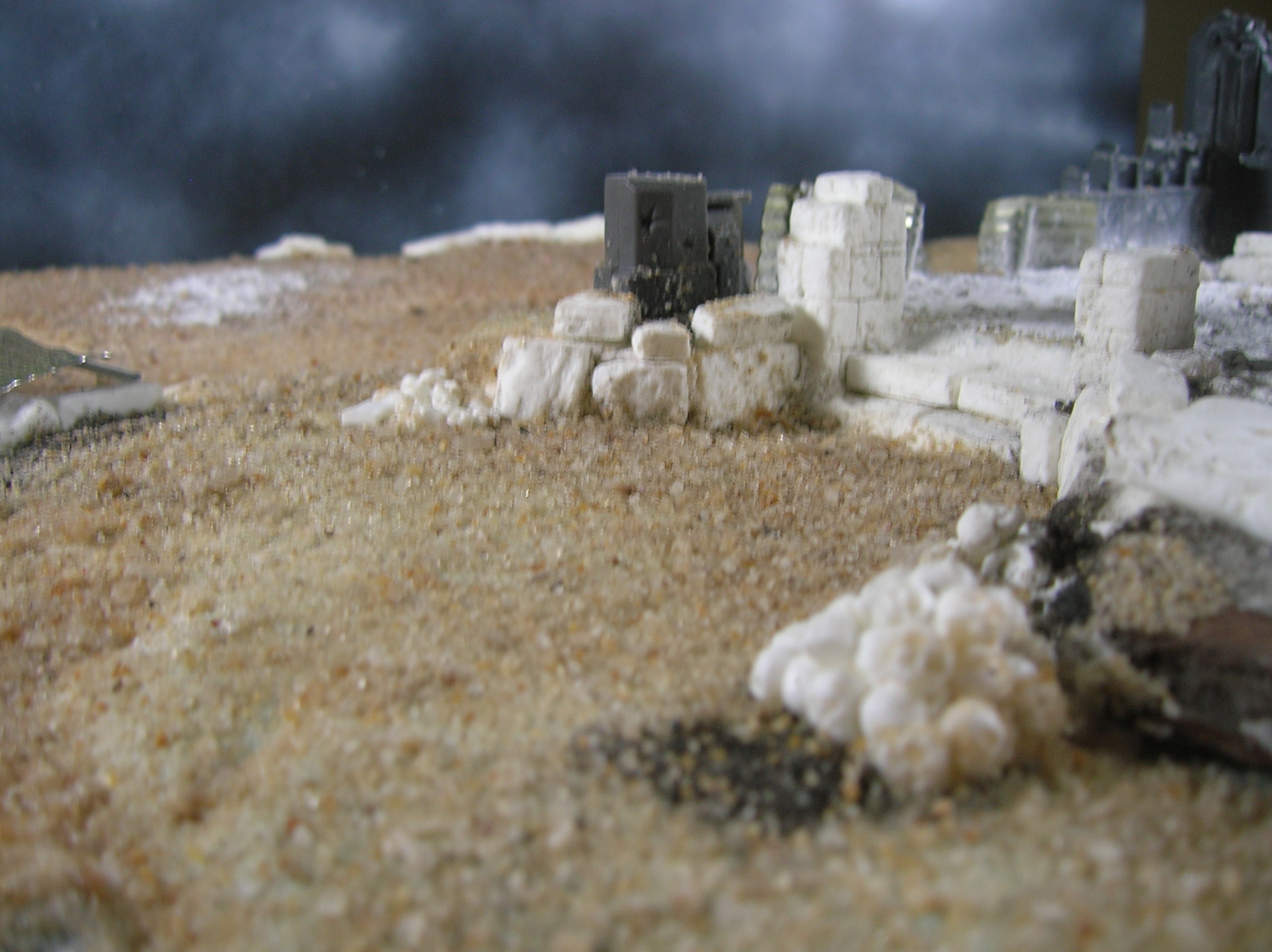 Holy Shnutz gluing down that sand was a lot of work. Here are some pics of the first 3x2 board section almost done. All thats left is to add some details and top it with a another coat of watered down PVA before it gets some paint. I think there are enough skulls already so I'm just going to add some piles of trash here and there. I would have been done awhile ago but I recently discovered that netflix has all 7 seasons of Trailer Park Boys. I'm ready to get some paint on this! EDIT: looking at these pictures makes me see all the things that still need work! That pink foam freaking peeks out everywhere. Also I wanted to note that the white stuff is talcom powder that I am using for the really ground down dust.