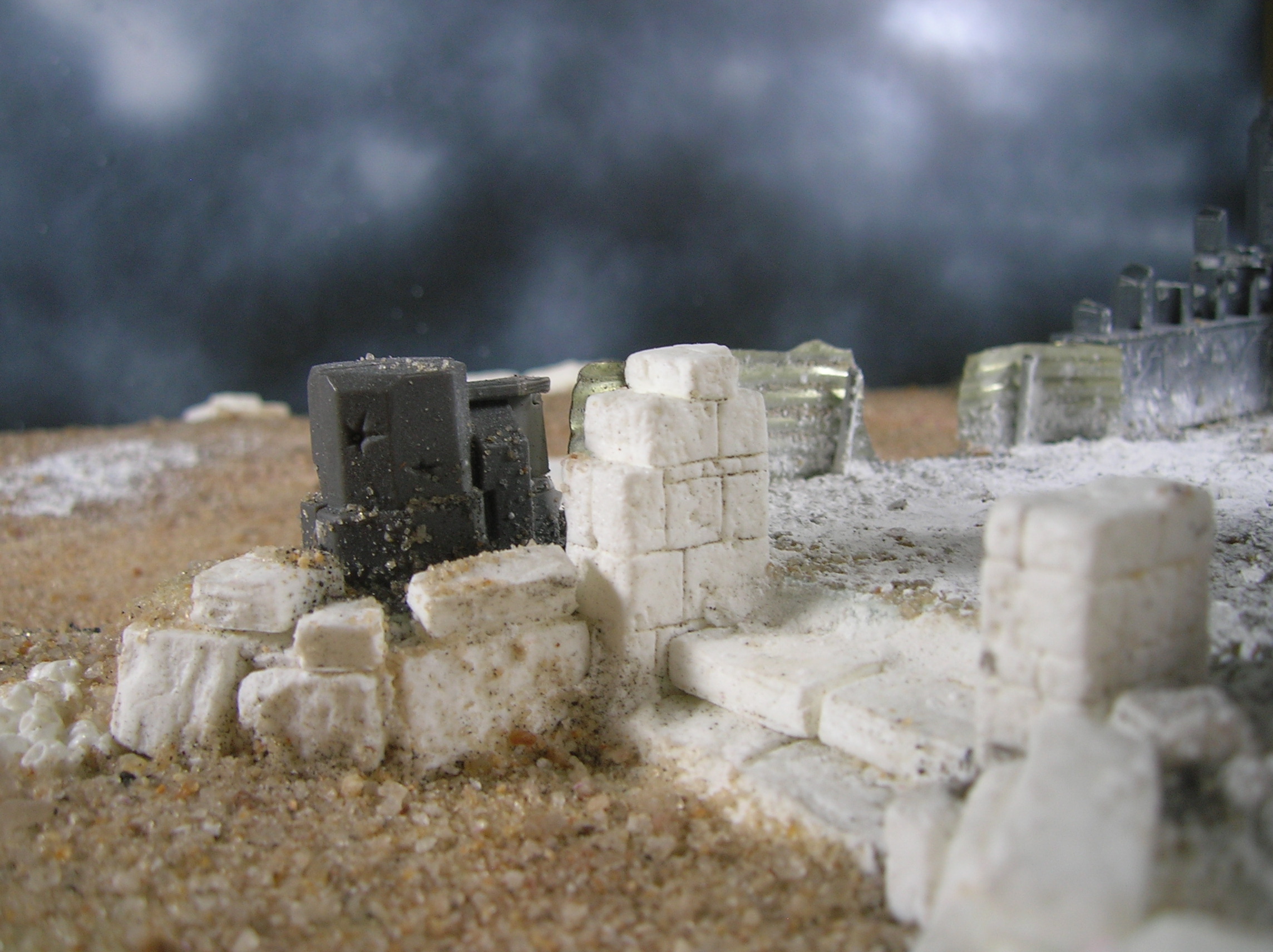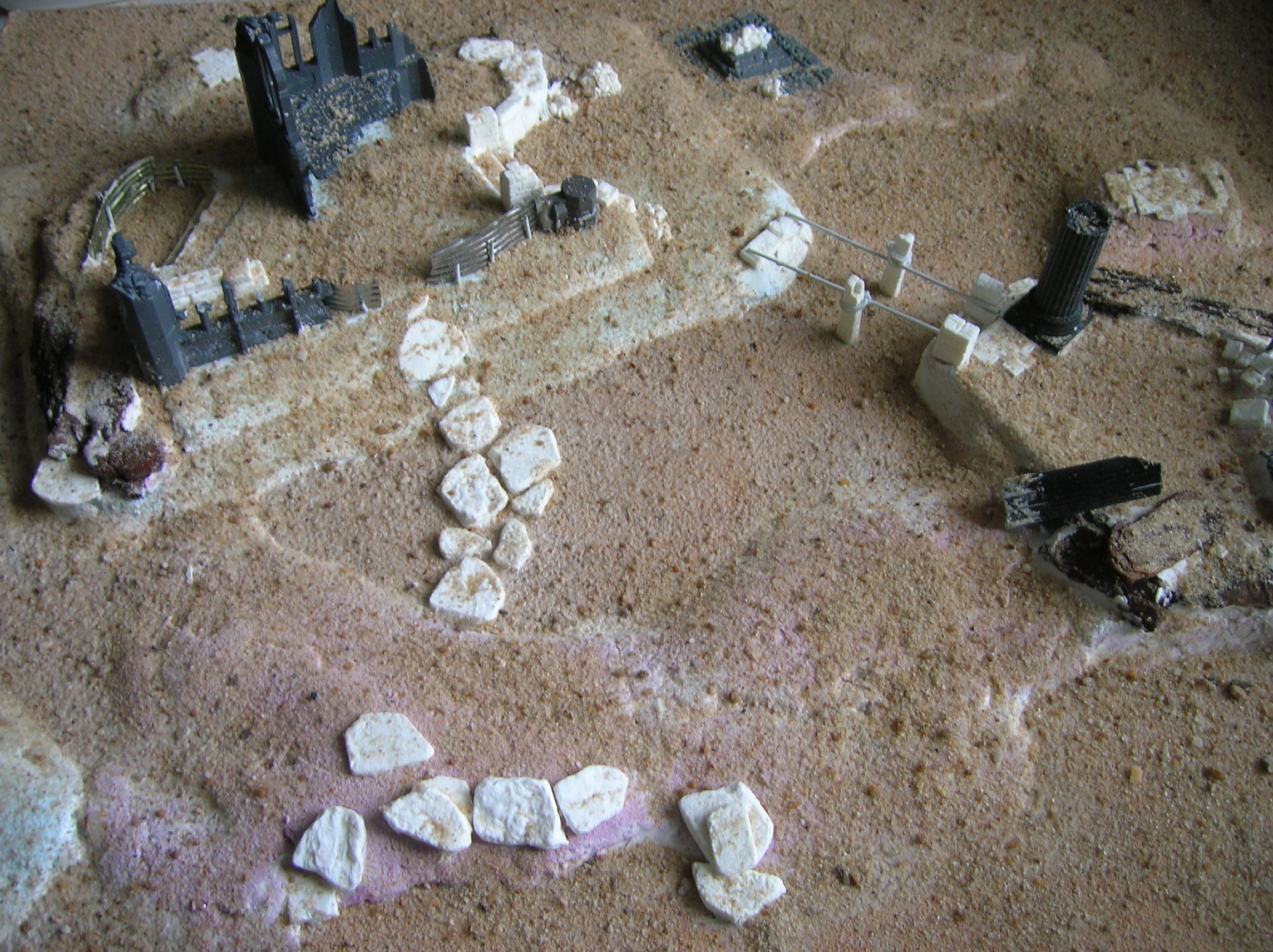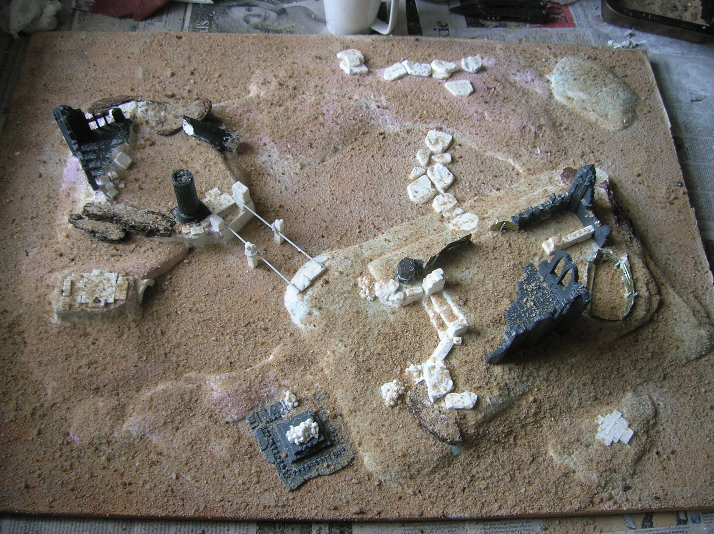 Holy Shnutz gluing down that sand was a lot of work. Here are some pics of the first 3x2 board section almost done. All thats left is to add some details and top it with a another coat of watered down PVA before it gets some paint. I think there are enough skulls already so I'm just going to add some piles of trash here and there. I would have been done awhile ago but I recently discovered that netflix has all 7 seasons of Trailer Park Boys. I'm ready to get some paint on this! EDIT: looking at these pictures makes me see all the things that still need work! That pink foam freaking peeks out everywhere. Also I wanted to note that the white stuff is talcom powder that I am using for the really ground down dust.