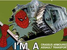 purplefood wrote: Oh, you think CRASSUS ARMOURED ASSAULT TRANSPORT is your ally...but you merely adopted the dark CRASSUS ARMOURED ASSAULT TRANSPORT: I was born in it; molded by it. I didn’t see other tanks until I was already a man; by then, it was nothing to me but weakness.