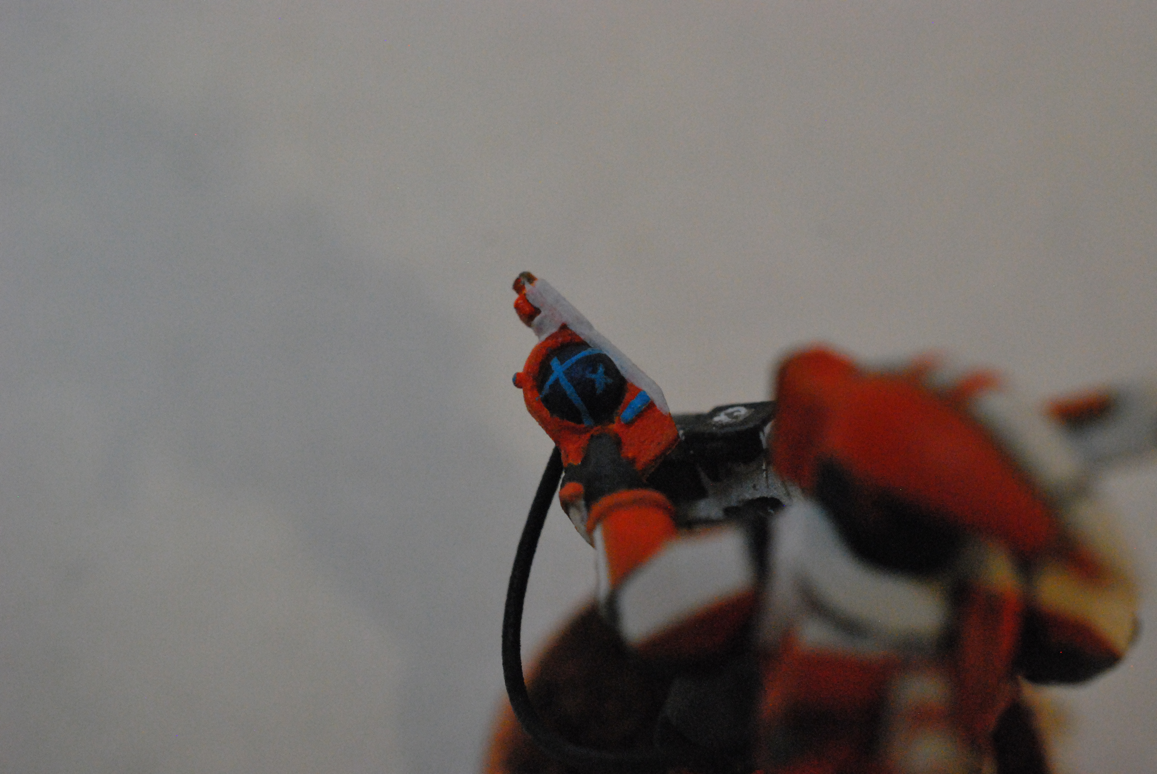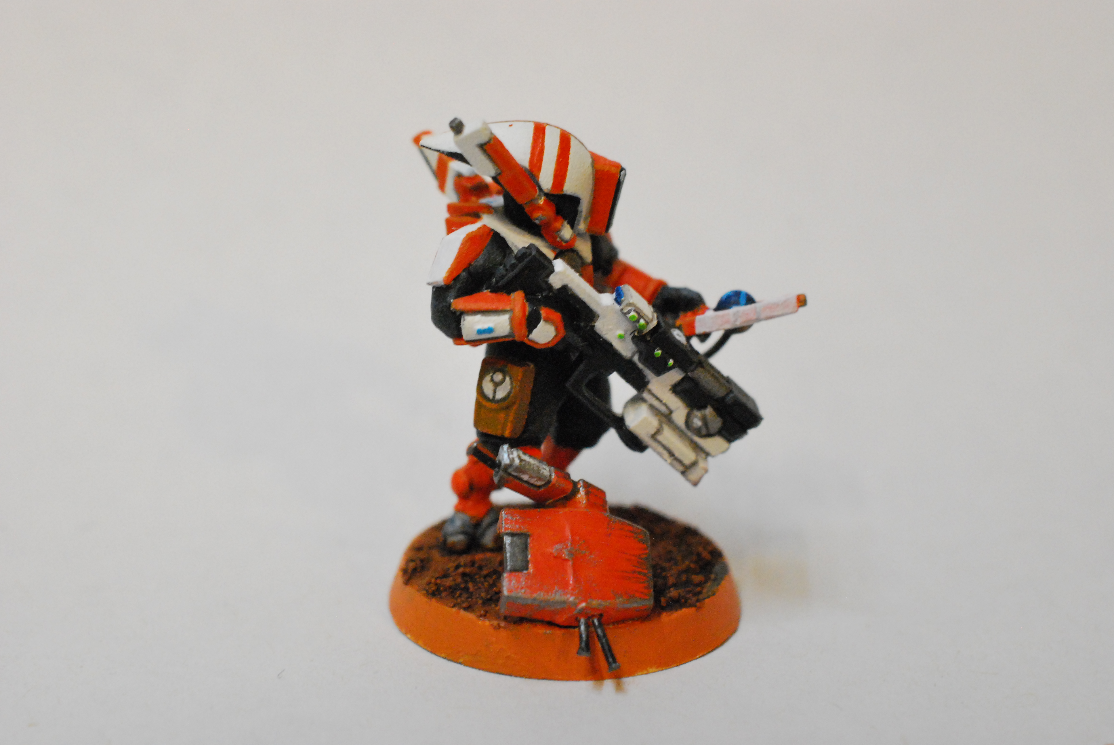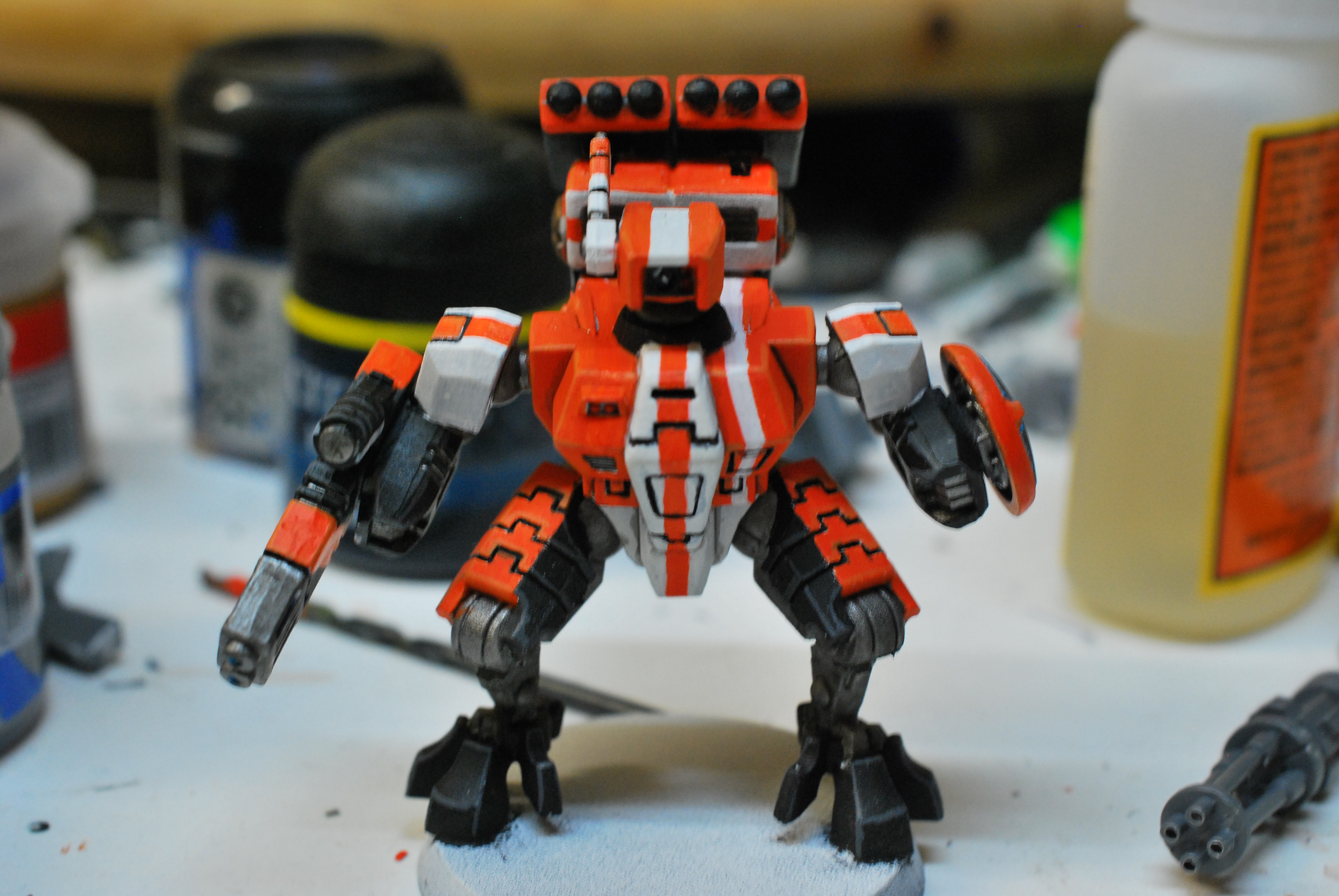 I finished the paint job on the last battlesuit and I decided to adjust the paint. I took off one of the white stripes to make more asymmetrical and look less like an orange circus tent.