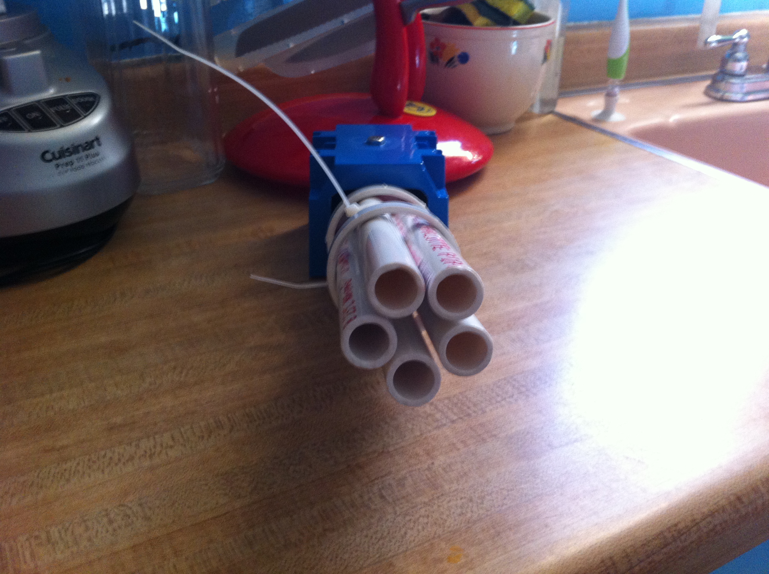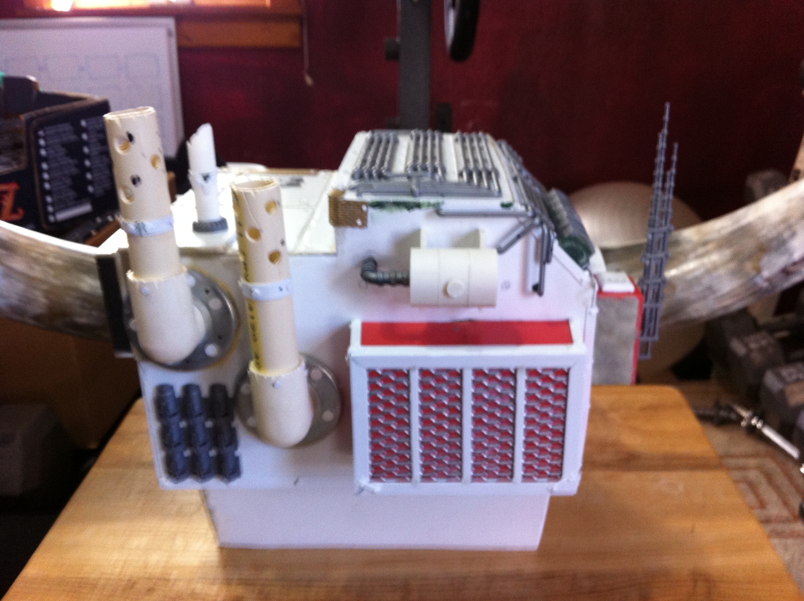 Well, our new member Dave brought in a mock-up of one shoulder gun. He made one a gatling gun and the other was a rack of missles. Ted took the head home and added the details. We hade model pipes and a fuel drum from a model train store. He also used a filter-some parts from the Pegasus kits, and bits of plasticard.