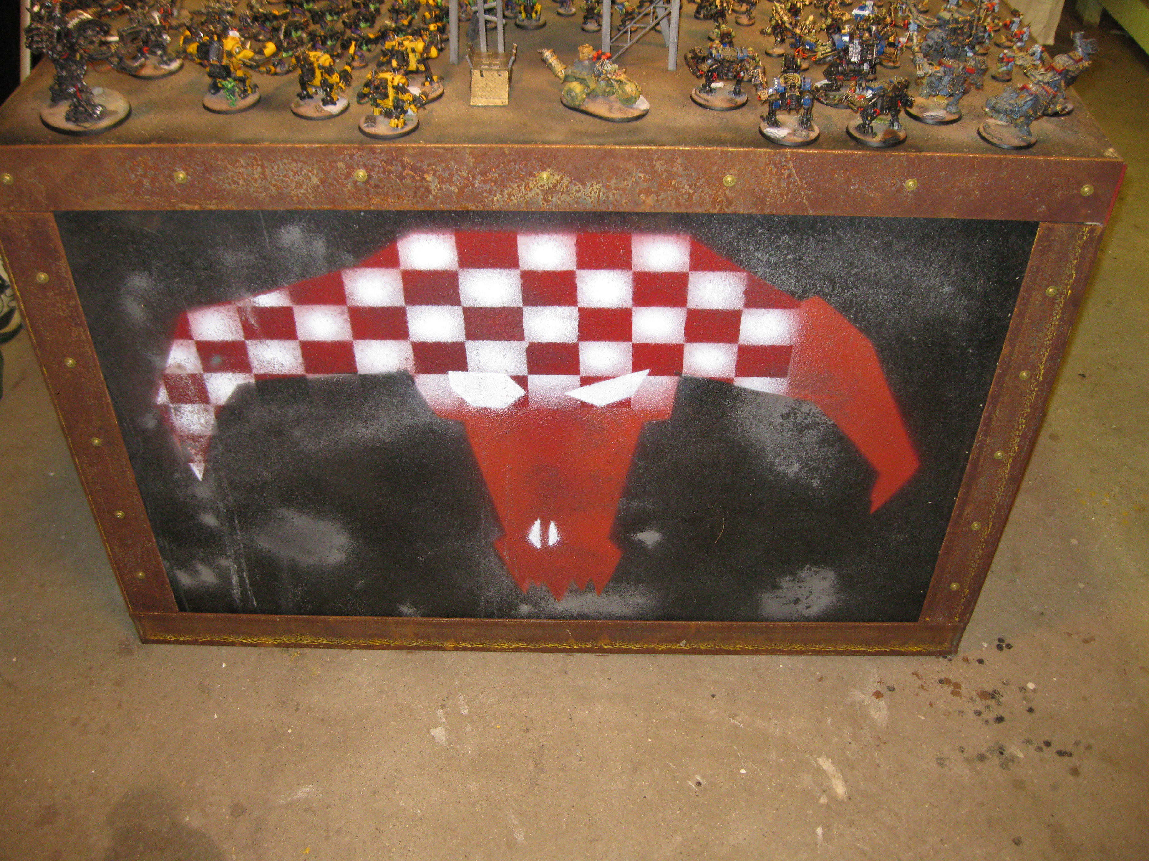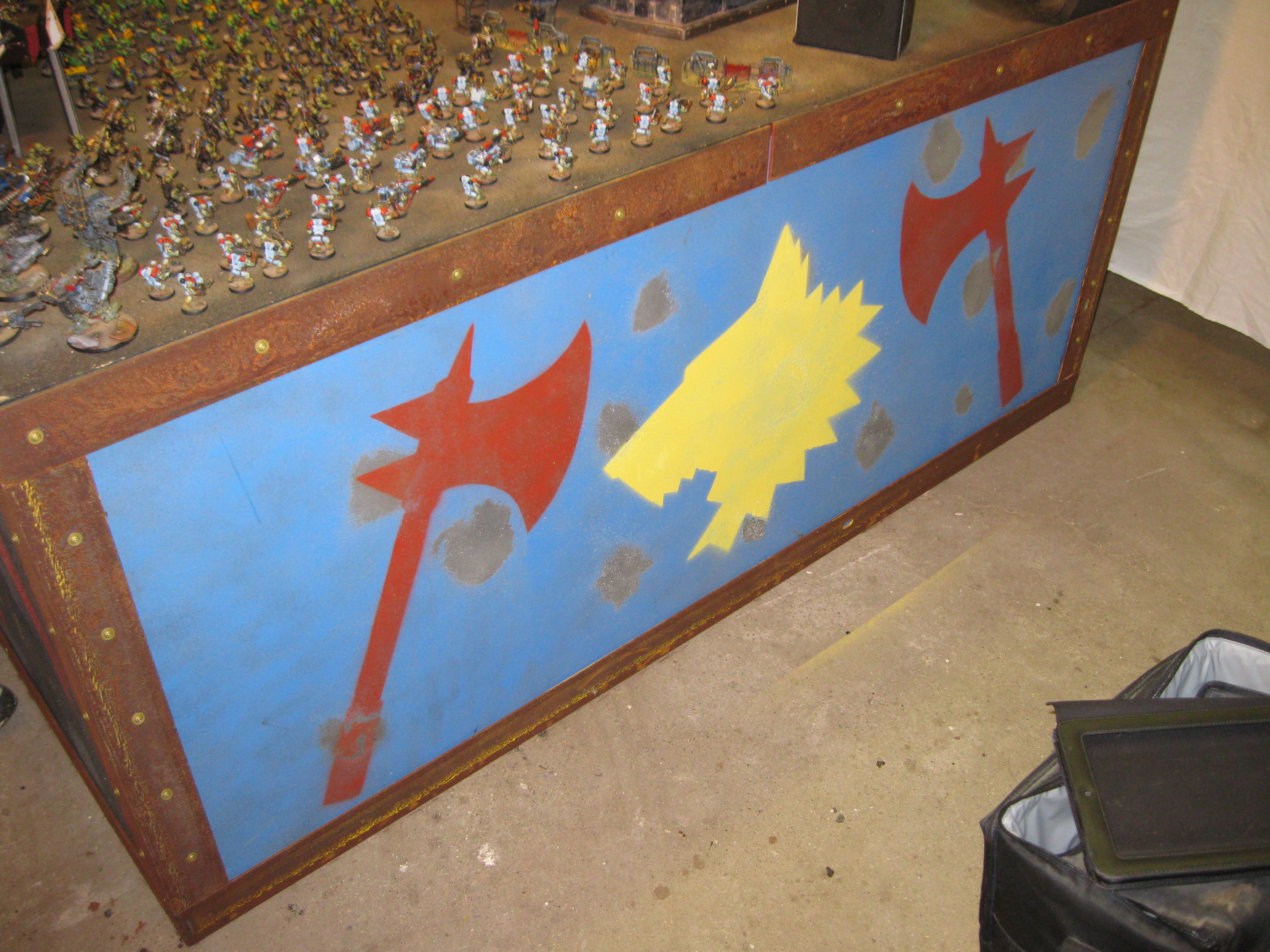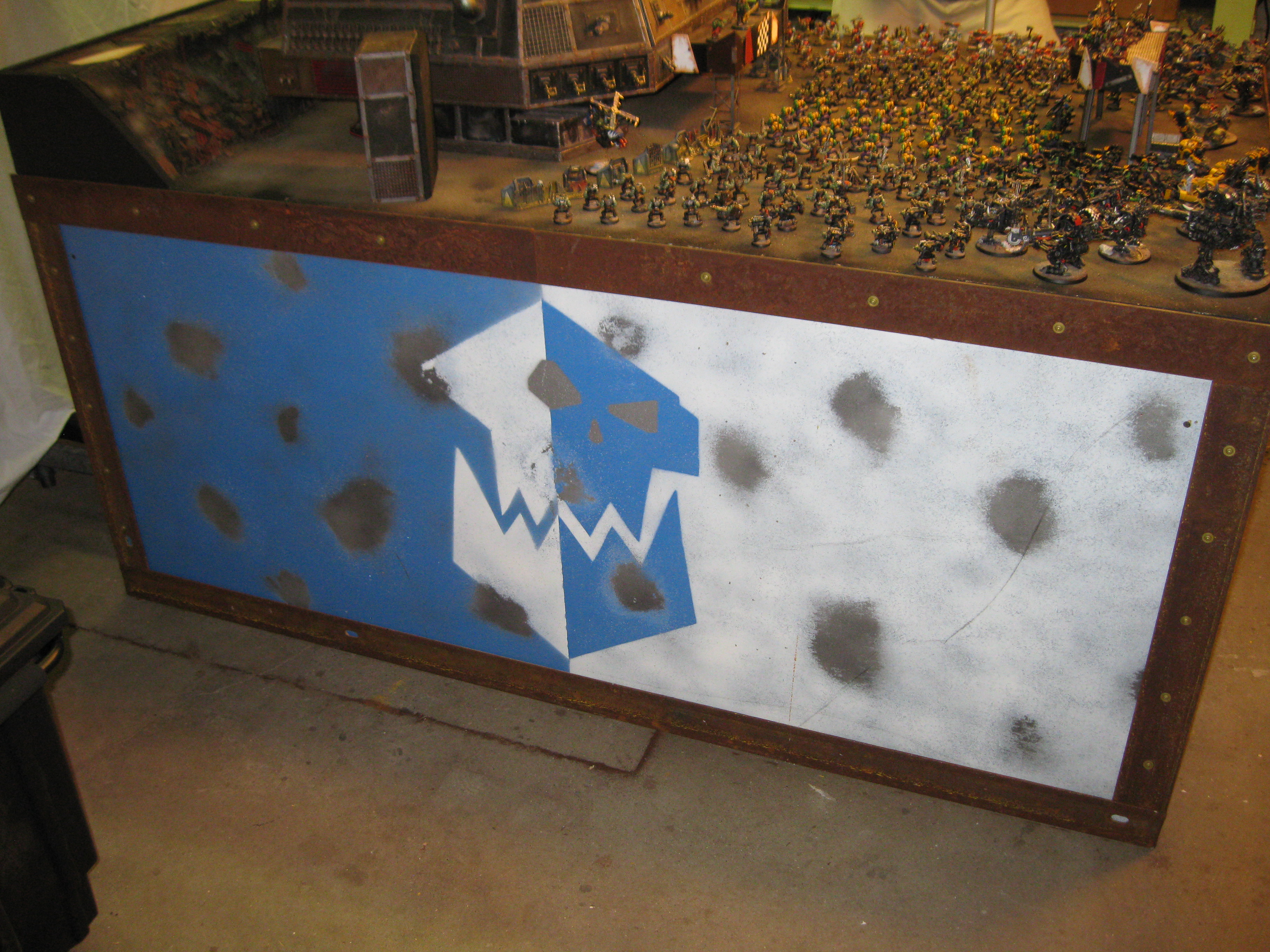 for the most part, that is how we made a Great Gargant. The next thing was to make a table. I took some 3/4" pressboard and made a box 4' X 6' ( what do you know, I have yet another game table!). Then I rimmed the whole thing in steel that I rusted with salt water. We built a pile of garbage at the back to look like the leftovers from building Orkgasmatron. Lastly, I painted the Glyphs for our armies on the sides. And here he is all done, and set up at Adepticon.