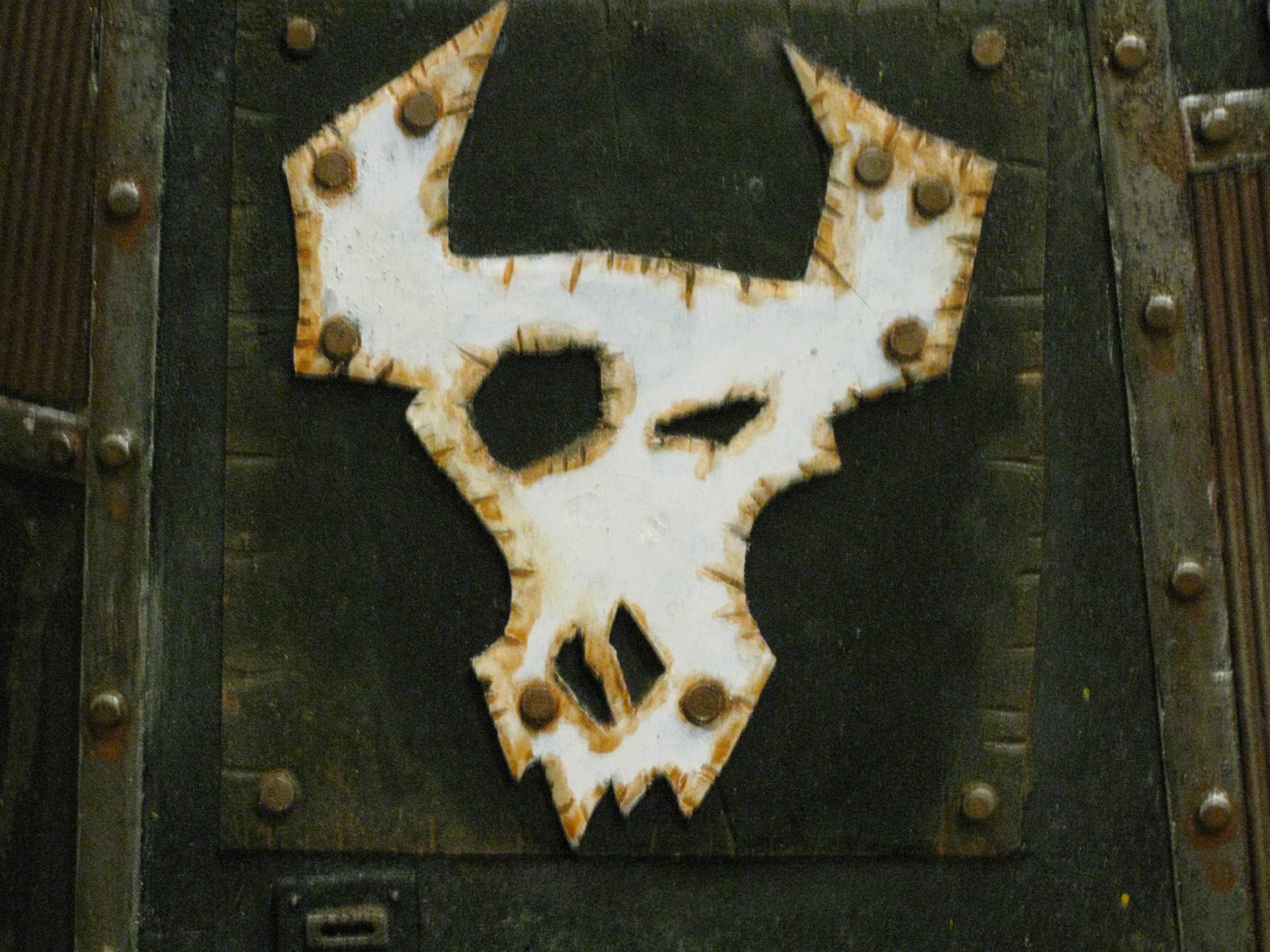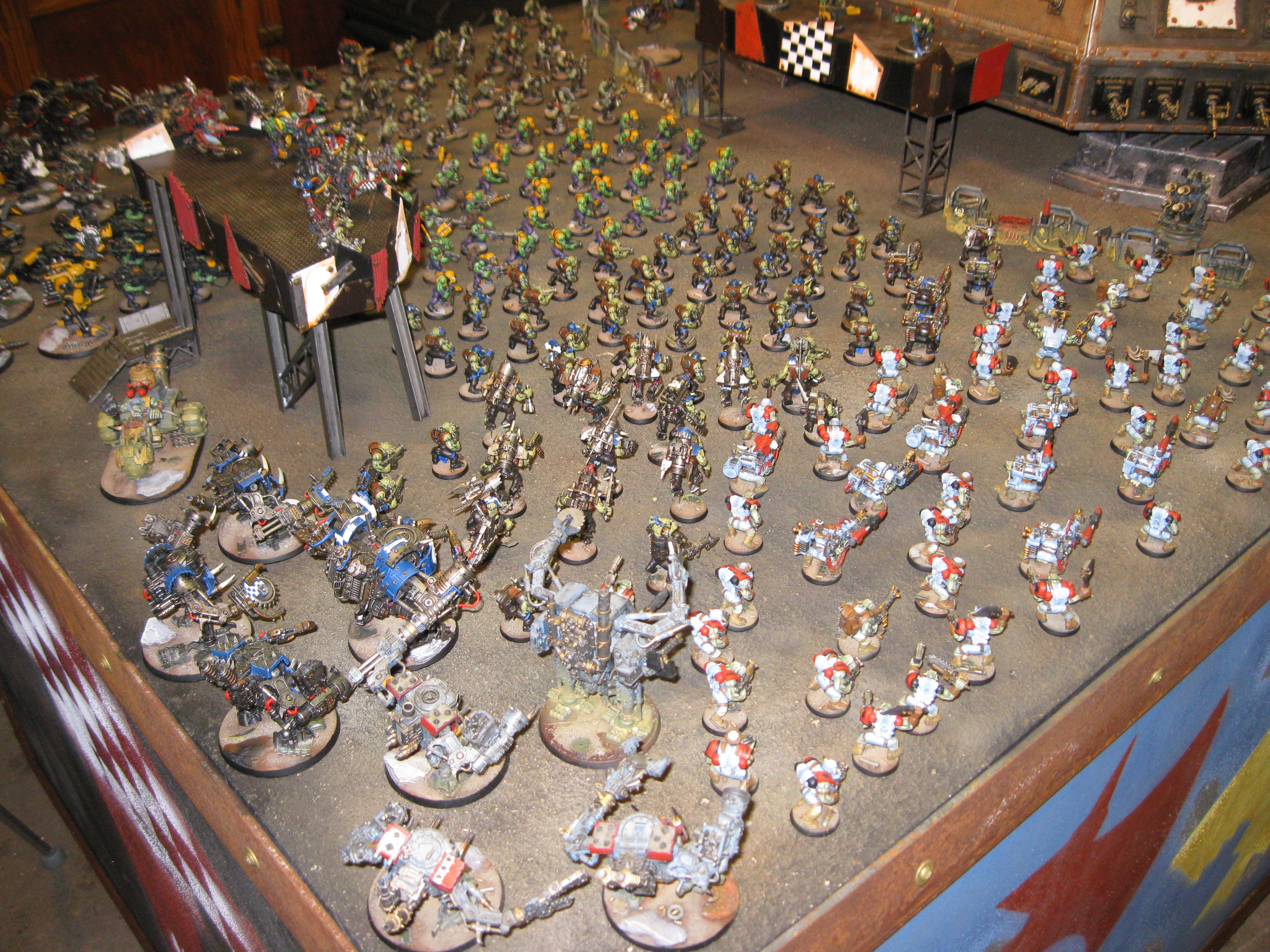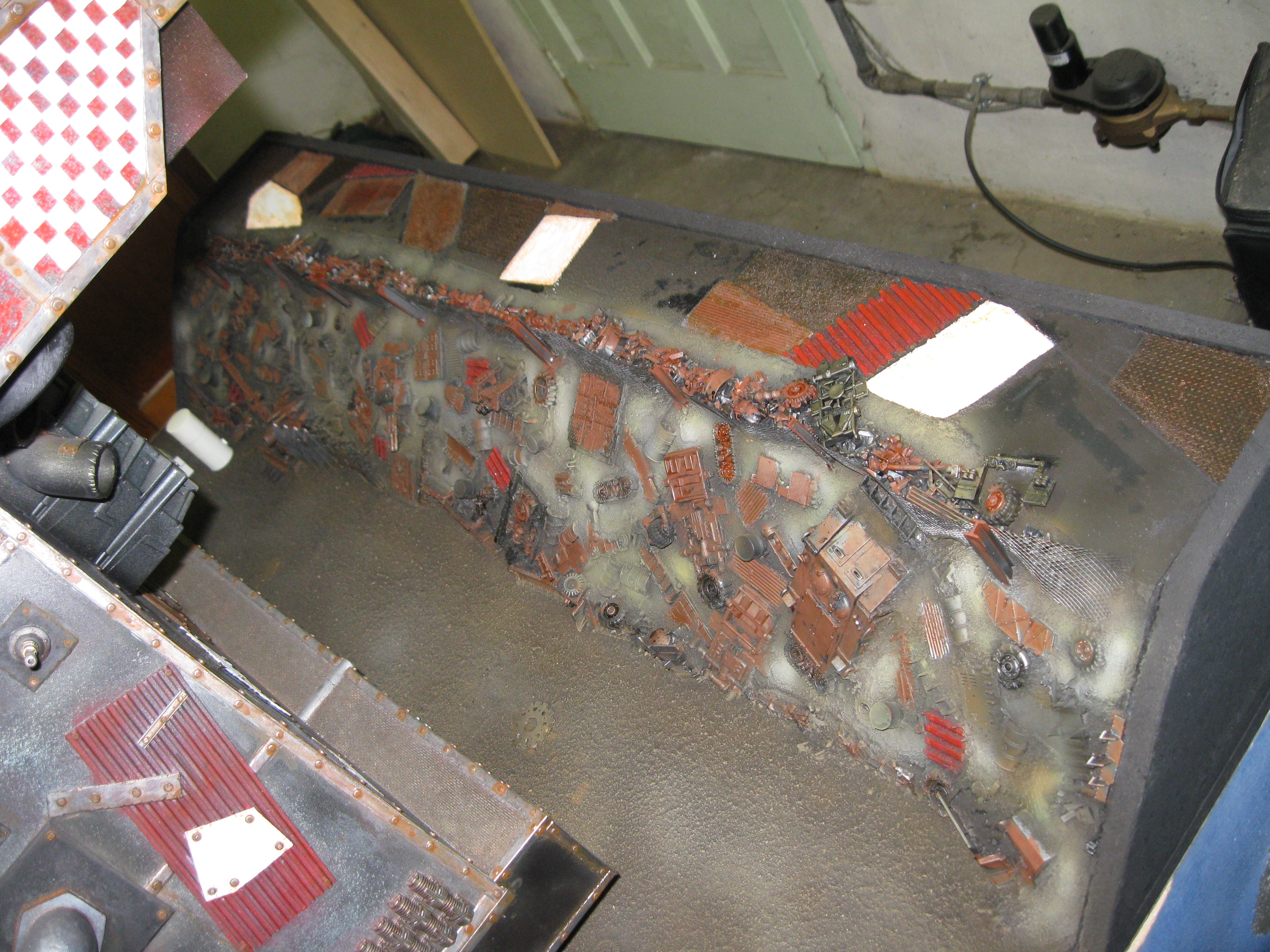 for the most part, that is how we made a Great Gargant. The next thing was to make a table. I took some 3/4" pressboard and made a box 4' X 6' ( what do you know, I have yet another game table!). Then I rimmed the whole thing in steel that I rusted with salt water. We built a pile of garbage at the back to look like the leftovers from building Orkgasmatron. Lastly, I painted the Glyphs for our armies on the sides. And here he is all done, and set up at Adepticon.