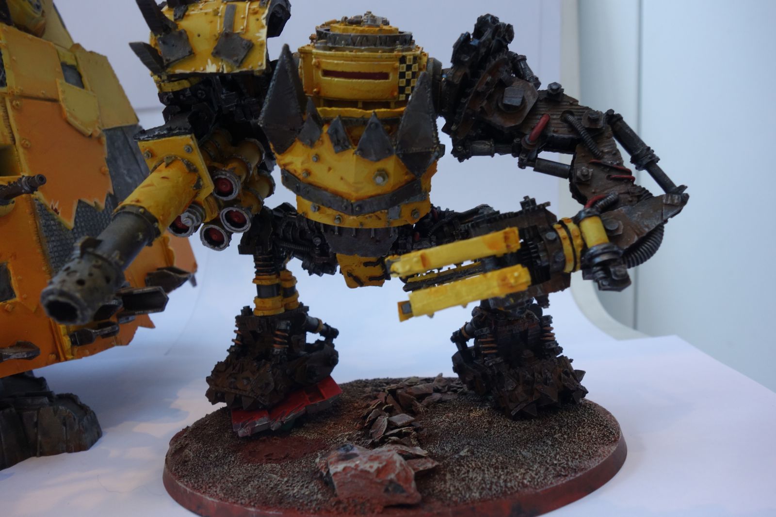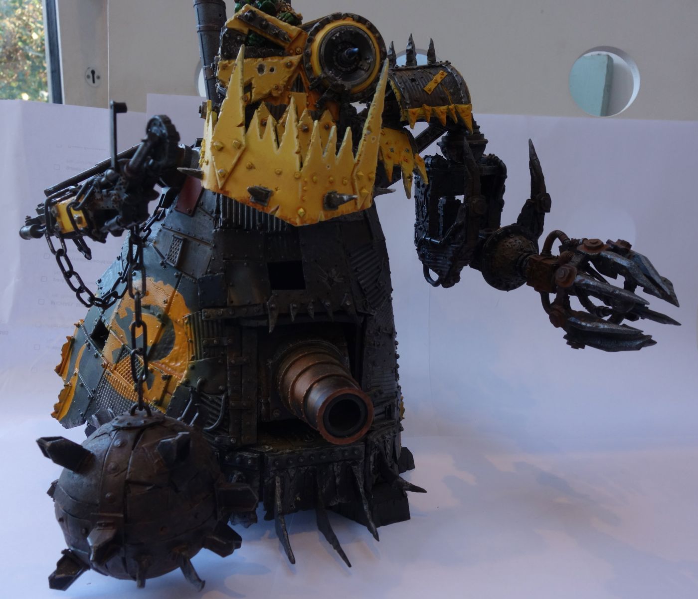The MegaDredd has only been used in Apocalype games so far. Likewise the custom Stompa with Wrecking Ball. Ball is polystyrene covered with green stuff, held on with plug chain. The mechanism broke and needs repair, in standard Ork fashion. For speed, I painted this Stompa body black, drybrushed gunmetal, then applied rust washes. Some of the hardware was primed in AP gunmetal, two black washed, then the rust washes. Yellow bits for the head etc were painted separately .