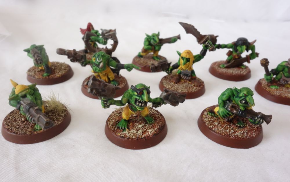 What can I say about these? They are grots. Mere, malevolent grots. Speed-painted using moredakka's guide, linked above. These are perhaps near the end point of the troops, around 120 and counting...