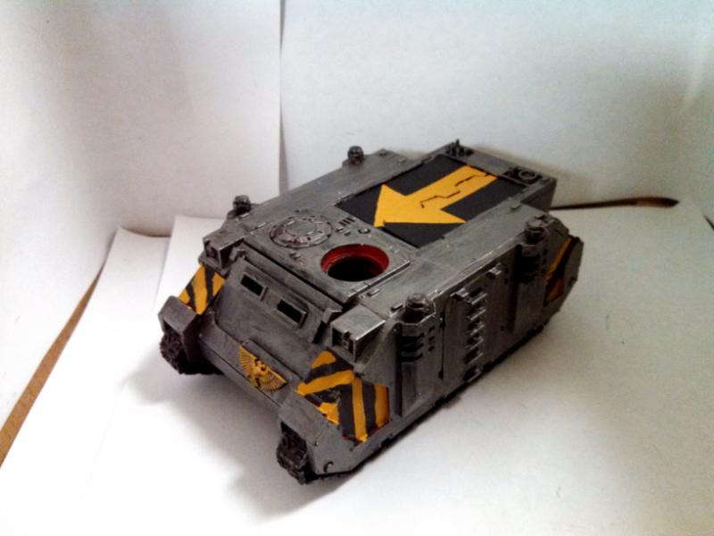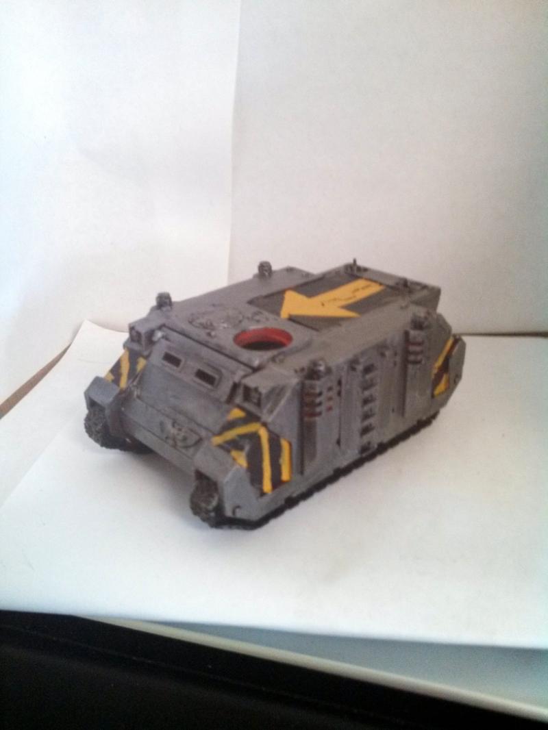 Alright, back to Space Marines. First off, that rhino from earlier. Needs touch up on the caution stripes, but is otherwise done.  Rhino 6 Then, the biker Chaplain. For now, his bike is made of solid gold. As such, he is a pimp. I probably will paint it like a normal bike later, but I was bored.  Pimp Chaplain on Bike If you like the bike, let me know and he'll get a truly gold bike rather than yellow. _e