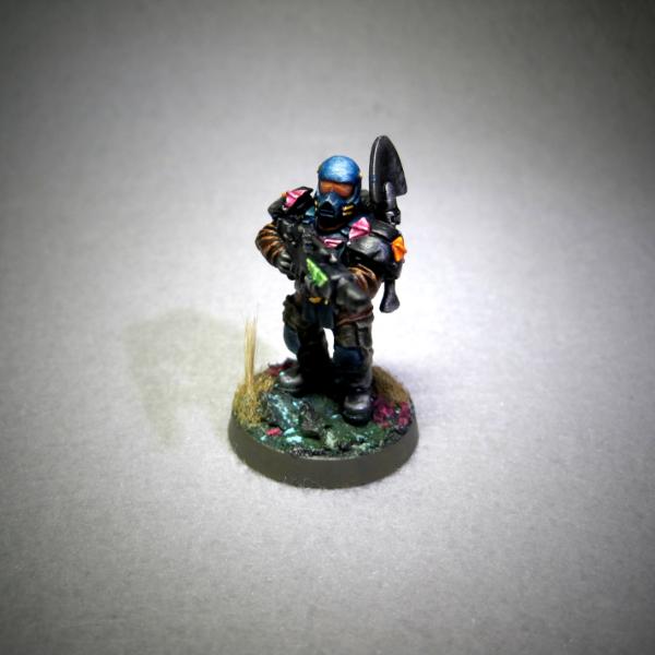 Engineer One is complete. Tried a few different colors. Used Reaper Master Series Translucent blue mixed with translucent white on his visor/blast mask. Also experimented with dark blue for armor pieces. It's a bit meh, but good enough for now. The shovel is layers of silver/gunmetal and black washes.