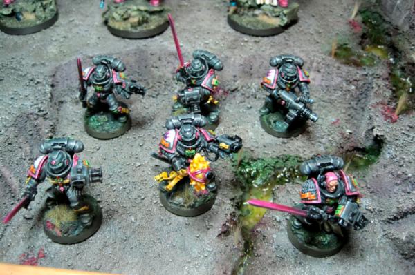 The biggest obstacle was painting all that white power armor. So i used these guys to test a few methods, techniques, etc. I finally found a method that I like and can do fairly quickly. It involves pre-shading and covering the entire model with a wash made of VW Pale Grey, Black wash, and water (3:1:3). I have a greater plague demon and seven terminators to finish before going back to the Space Rangers.