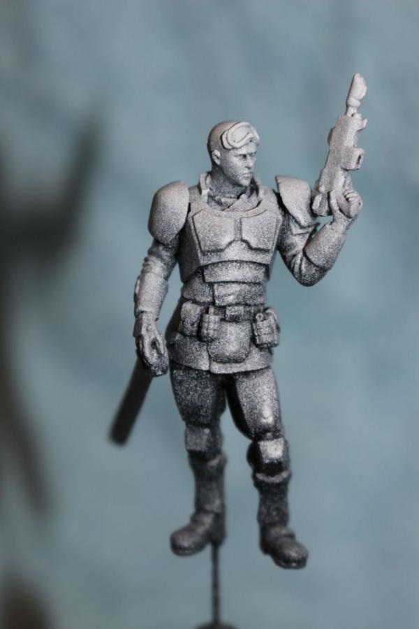 Now, however, I have gone Vallejo all the way. I bought black, grey, and white and a cheap suction feed external mix spraygun for about £16. I now start at the bottom of my models and spray upwards with the black, change to the grey - generally with a few drops of the black in as my bottle of grey seems rather light - and spray that whilst the black is still wet from the side so that the grey colout fades into the black around the knees of the figure. Then I add a thin coat of white (NOT a coat of thinned white) sprayed downwards to cover the head and shoulders.
