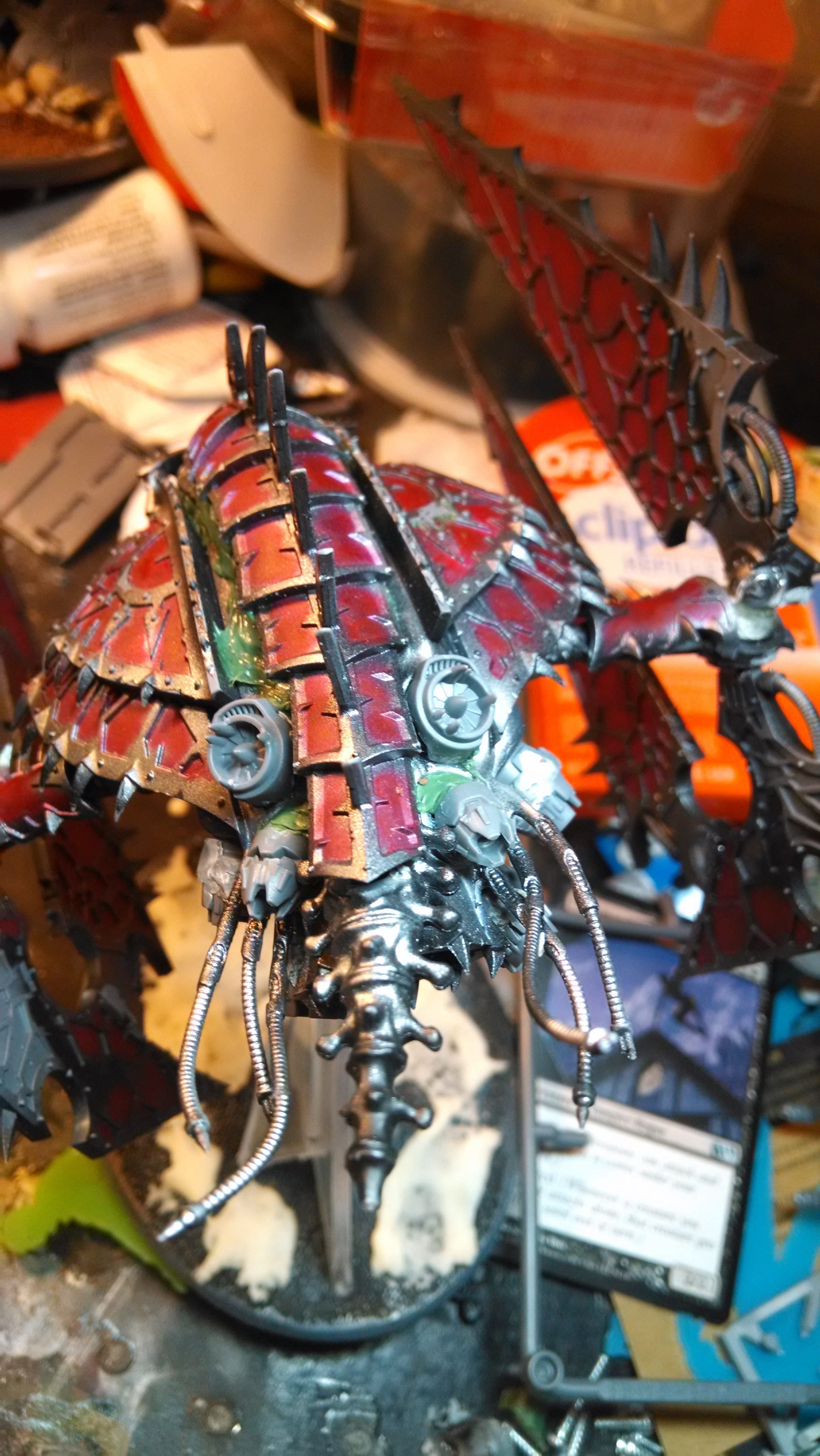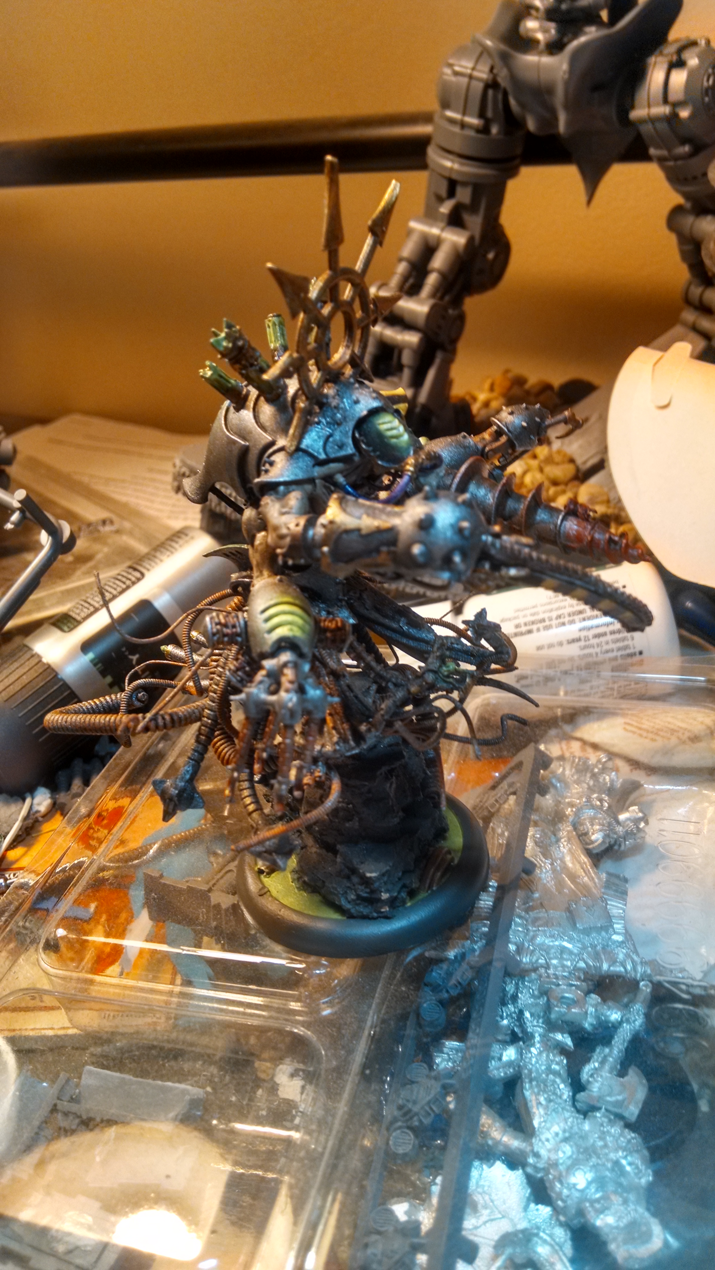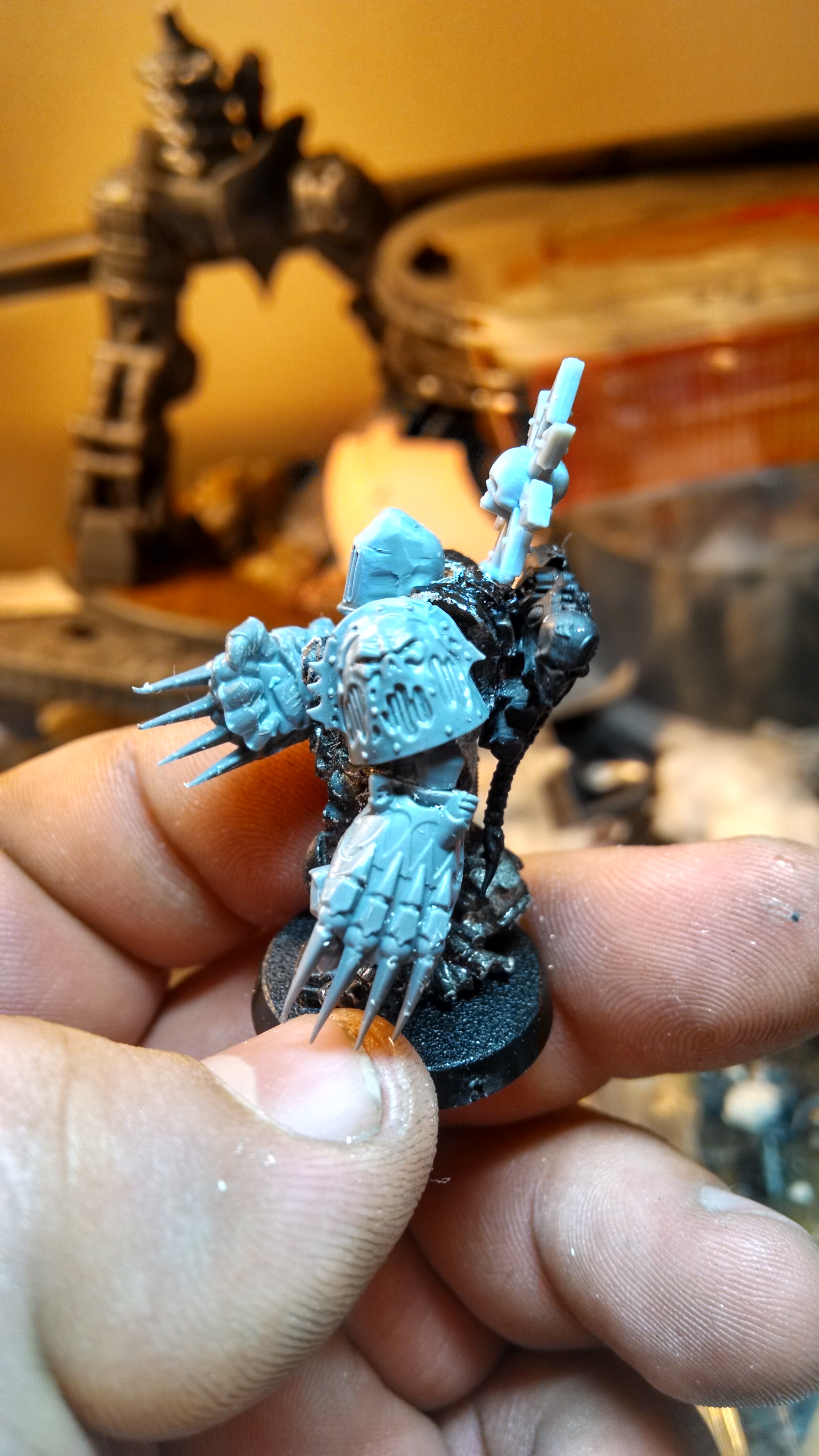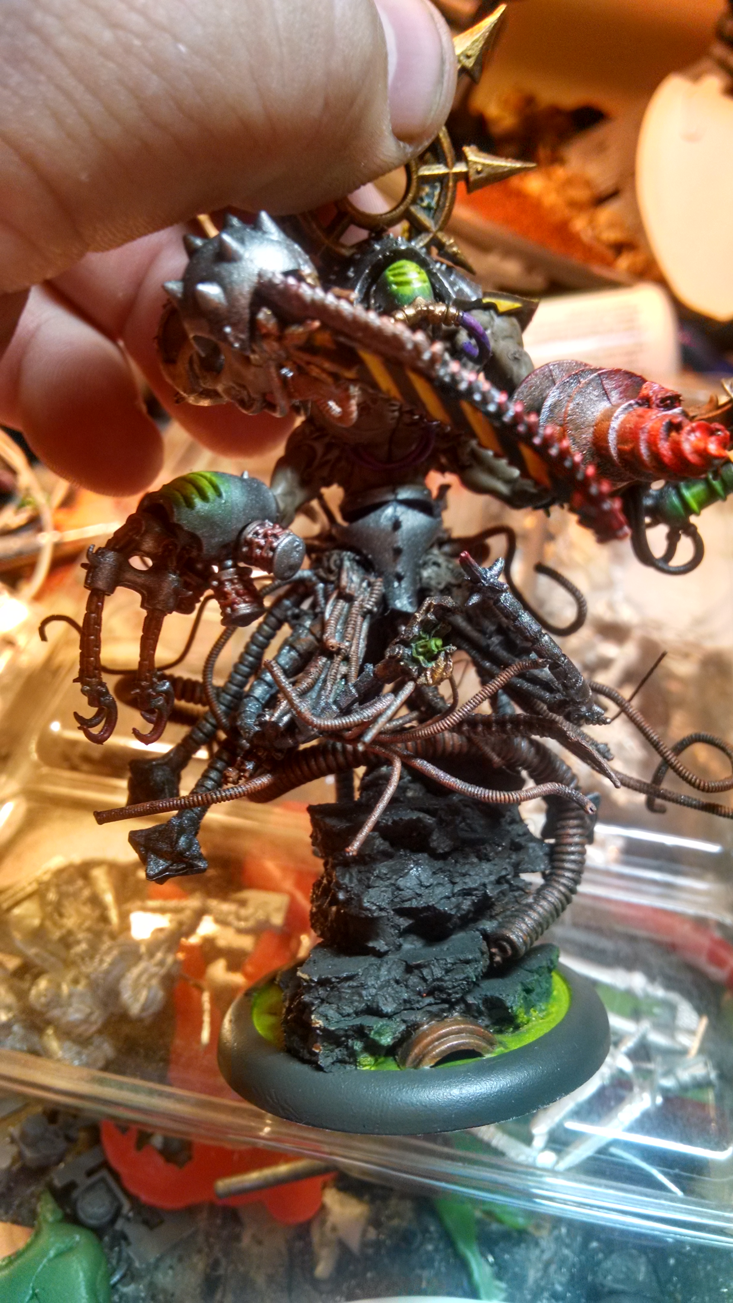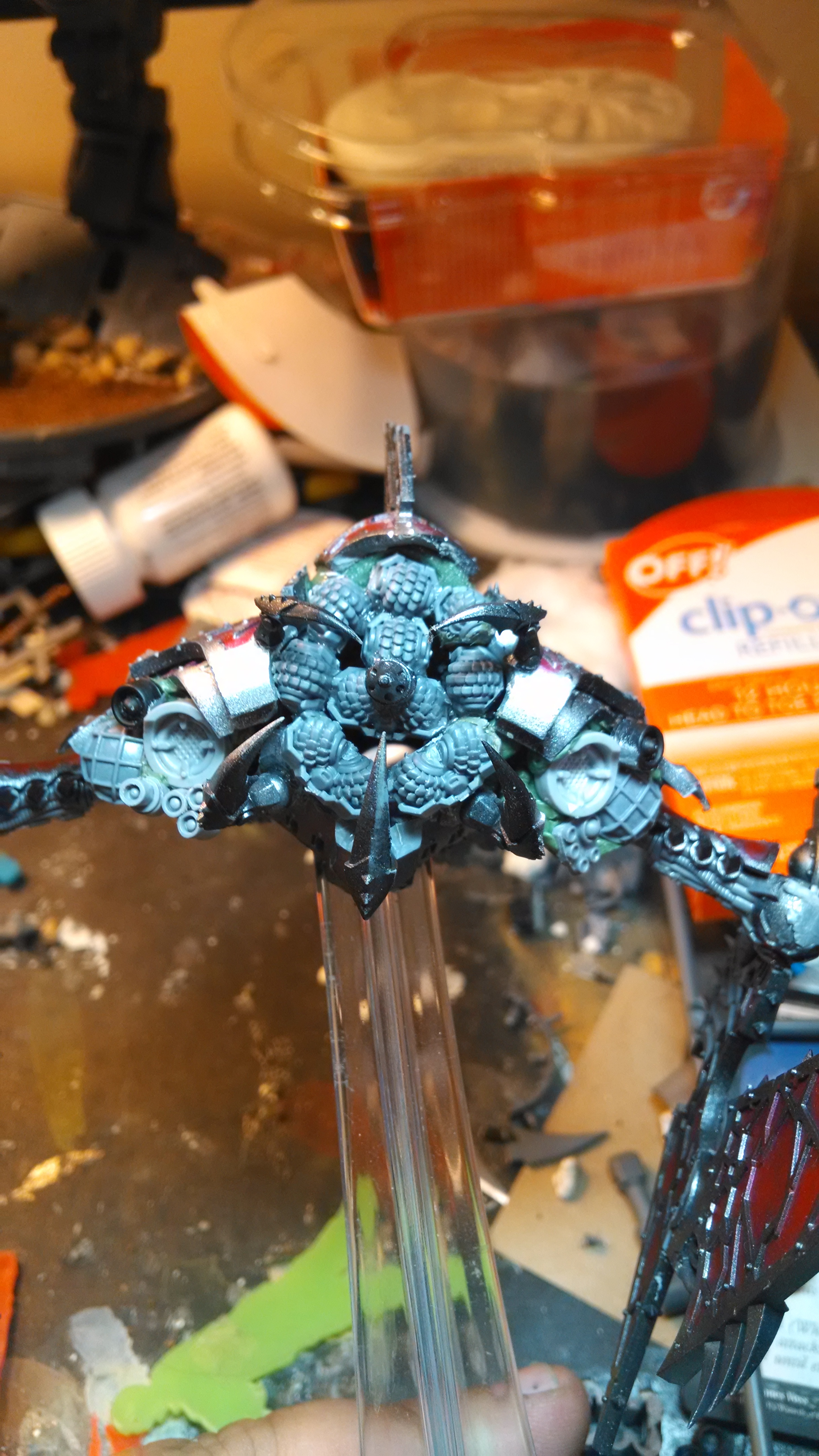 My daemon prince. Made from a Talos and a lot of guitar and piano wire. The scythe was crazy hard to build. I had to cut the teeth off of a buncha chainswords and glued them to the edges of a scything talon. Pretty much the only completed model.