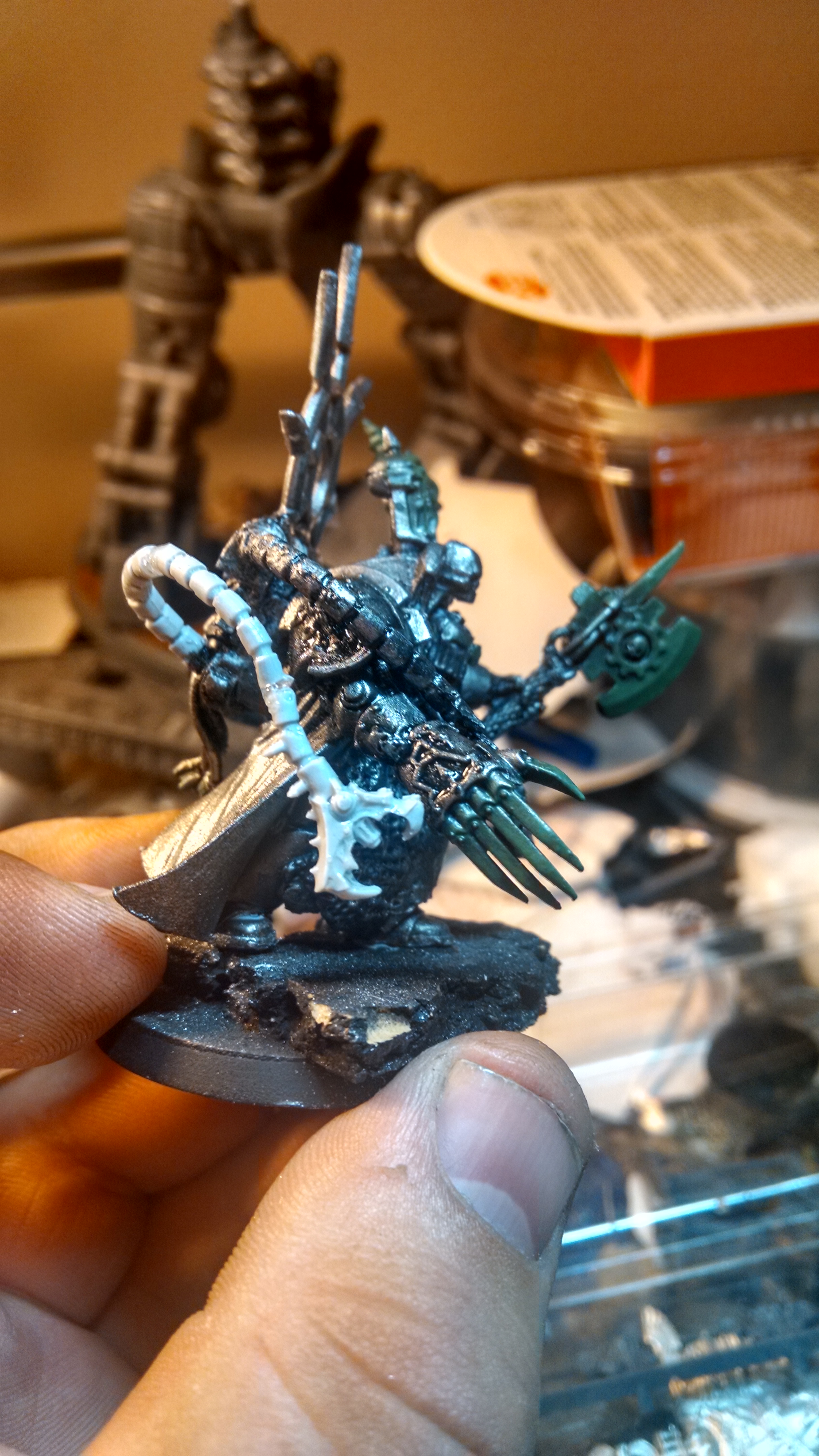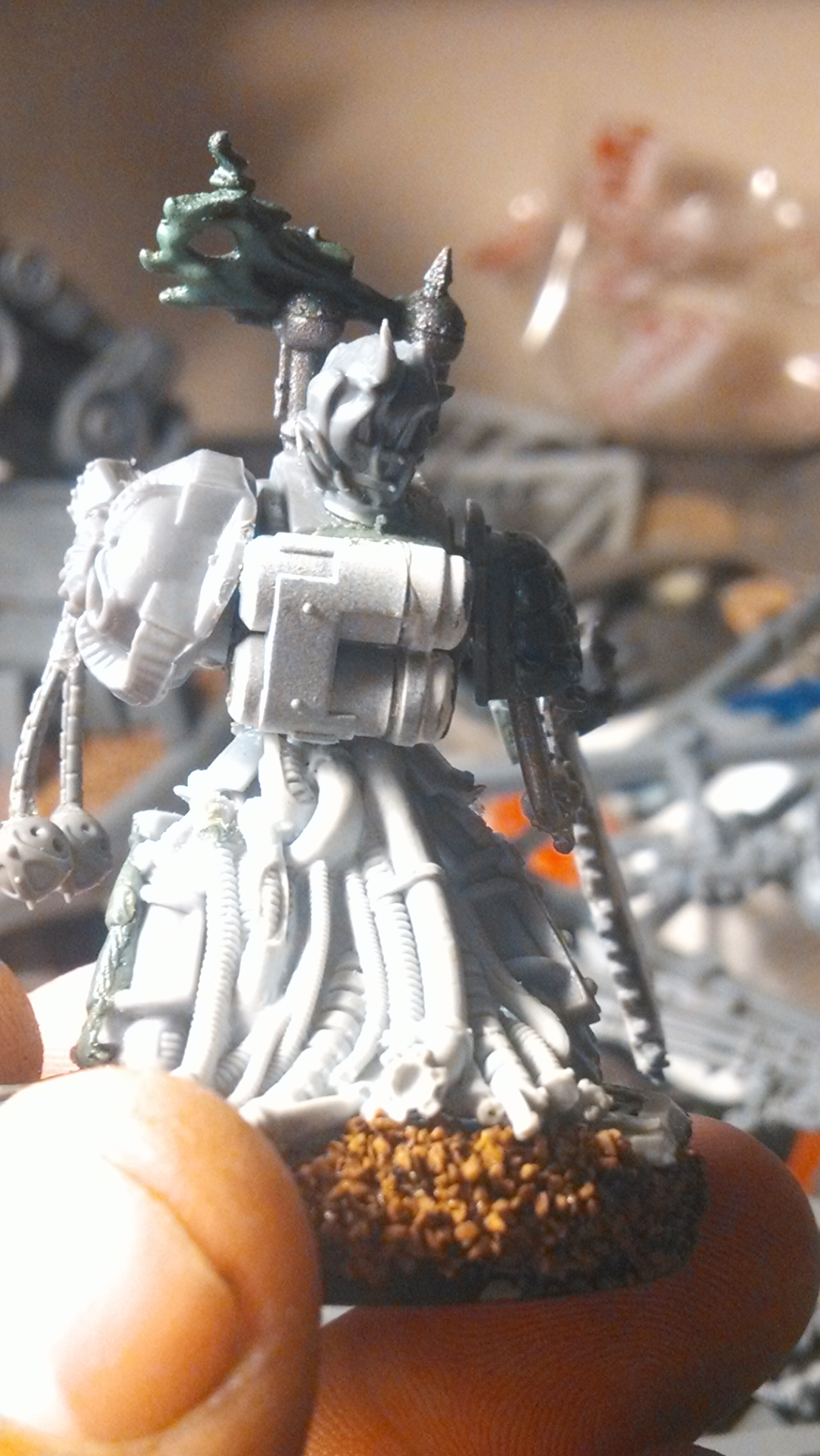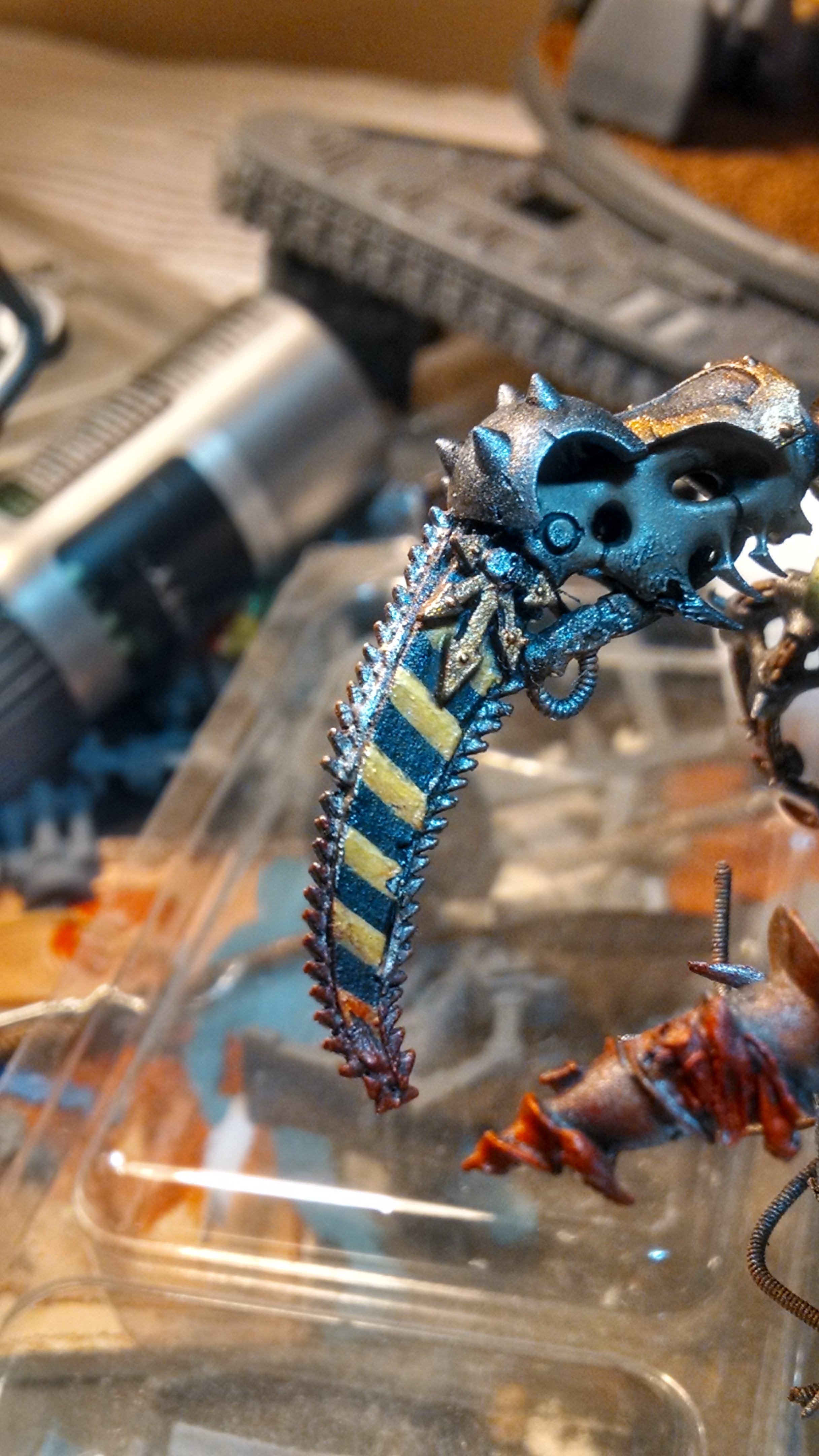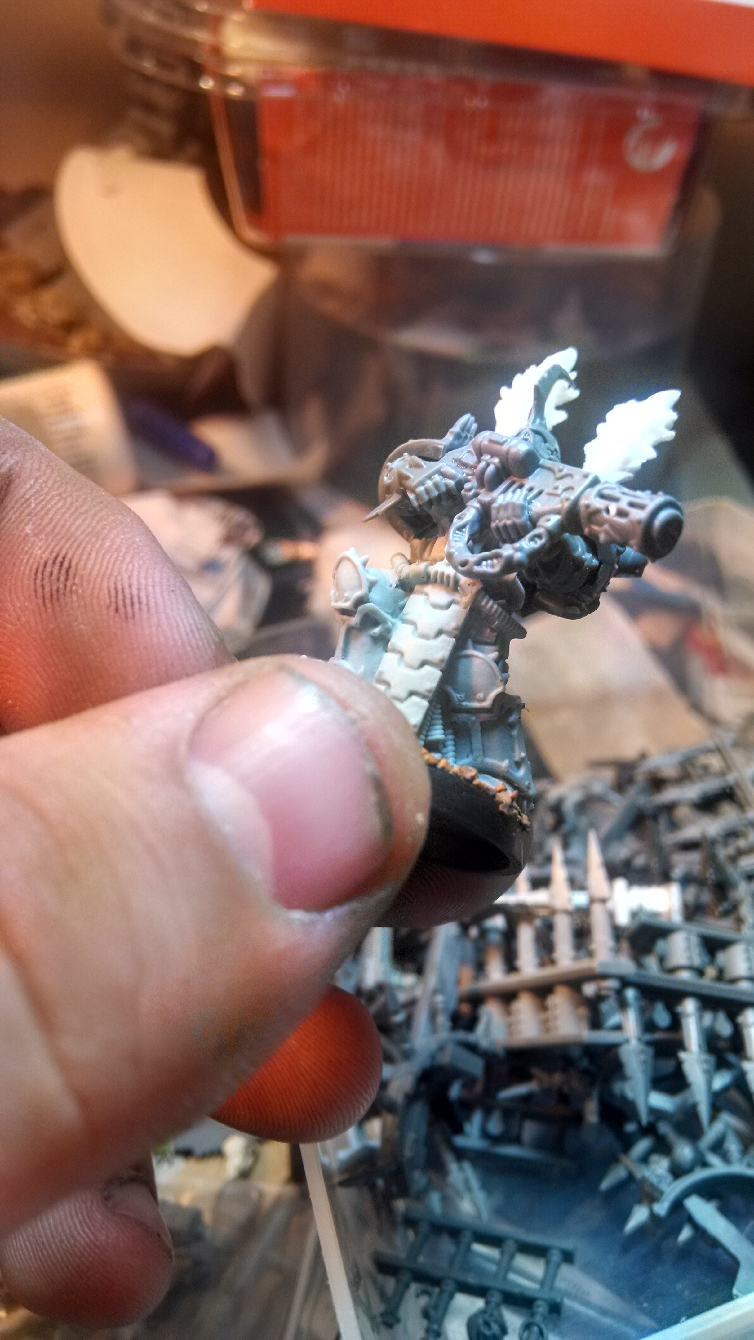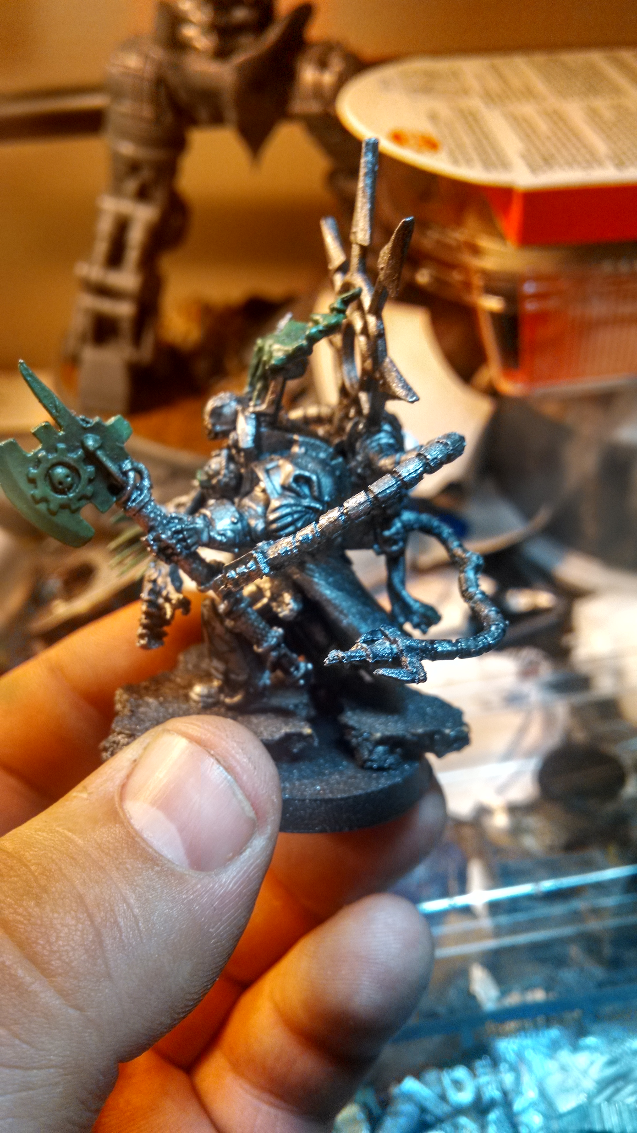 My daemon prince. Made from a Talos and a lot of guitar and piano wire. The scythe was crazy hard to build. I had to cut the teeth off of a buncha chainswords and glued them to the edges of a scything talon. Pretty much the only completed model.