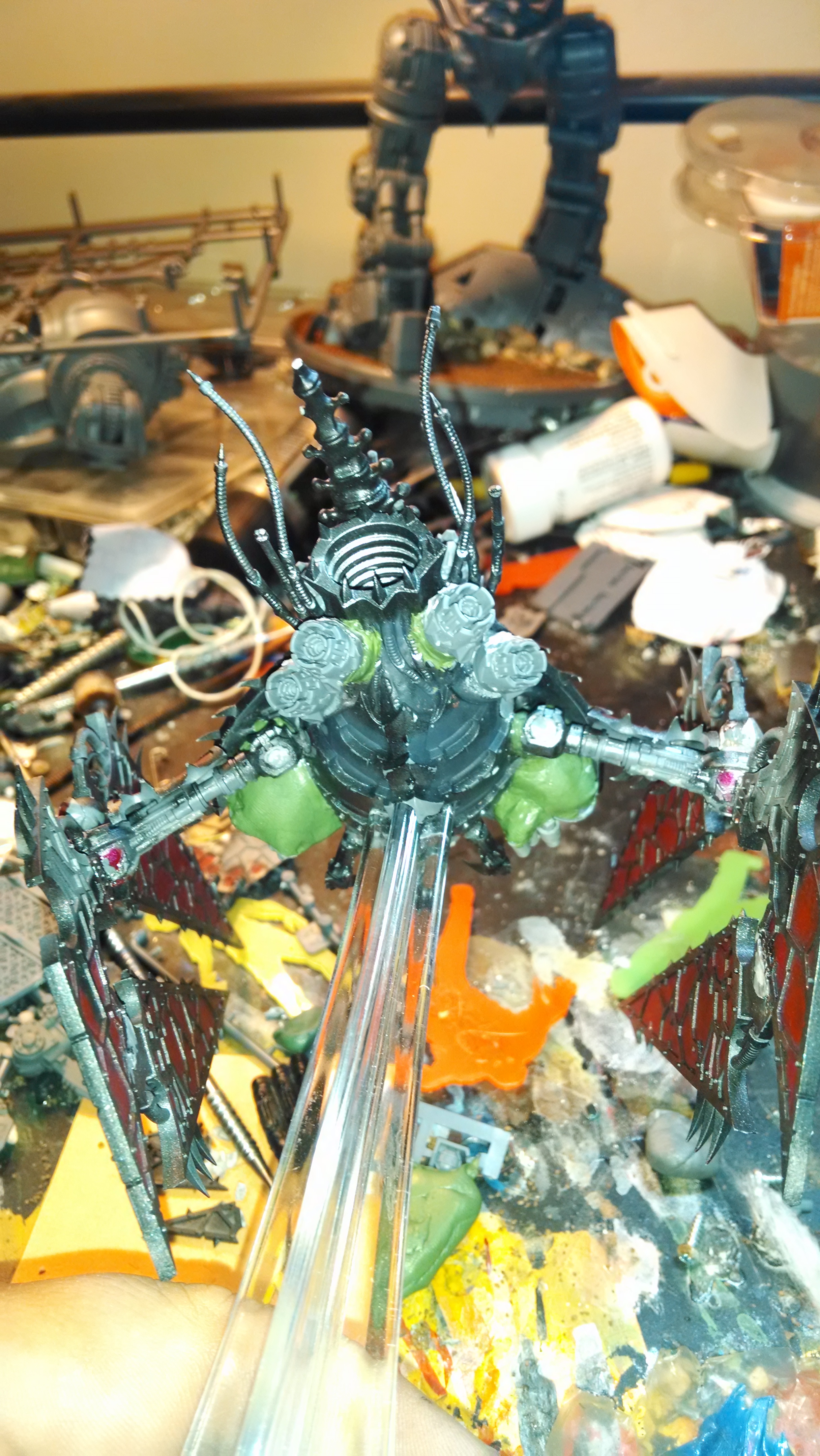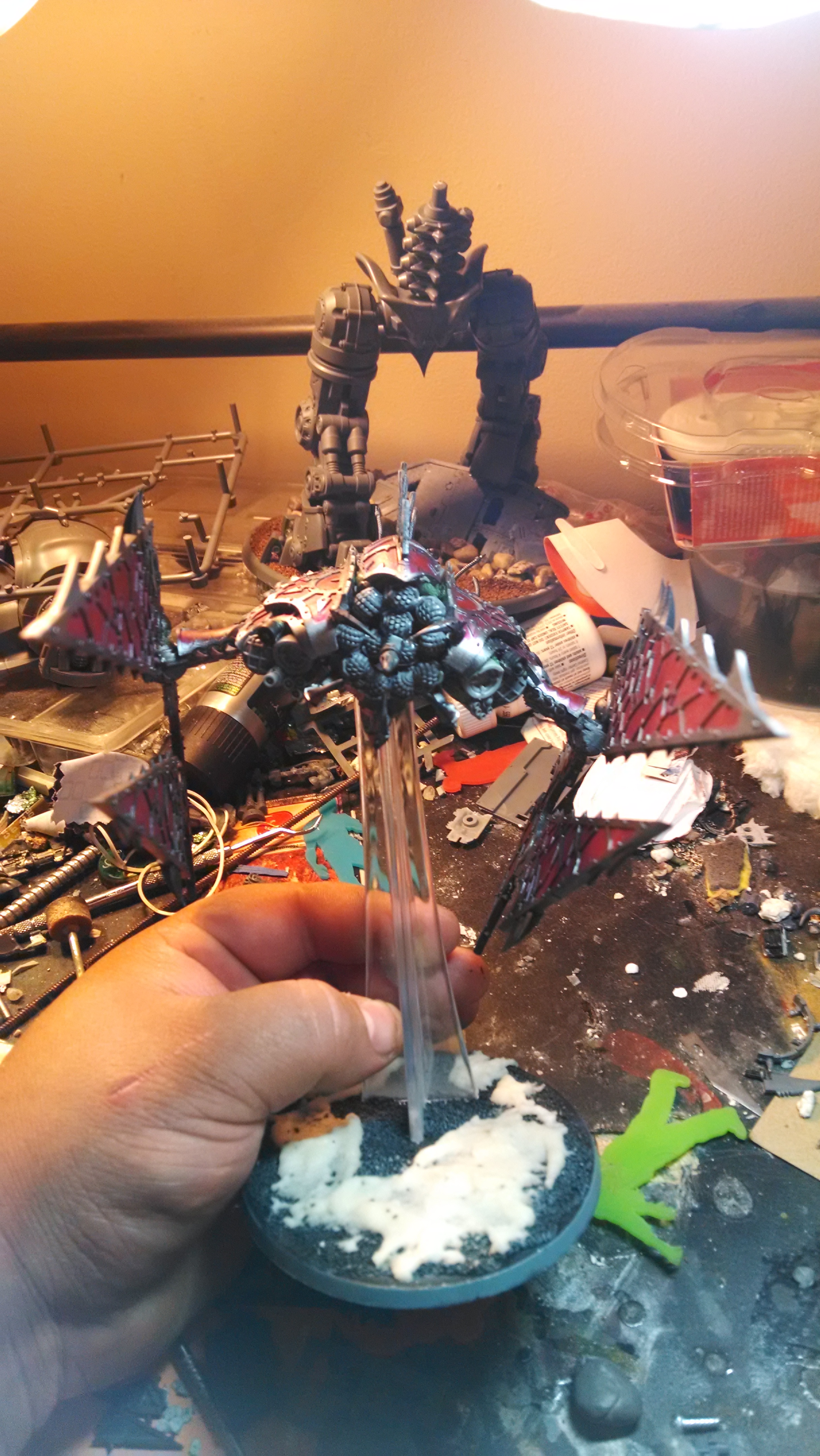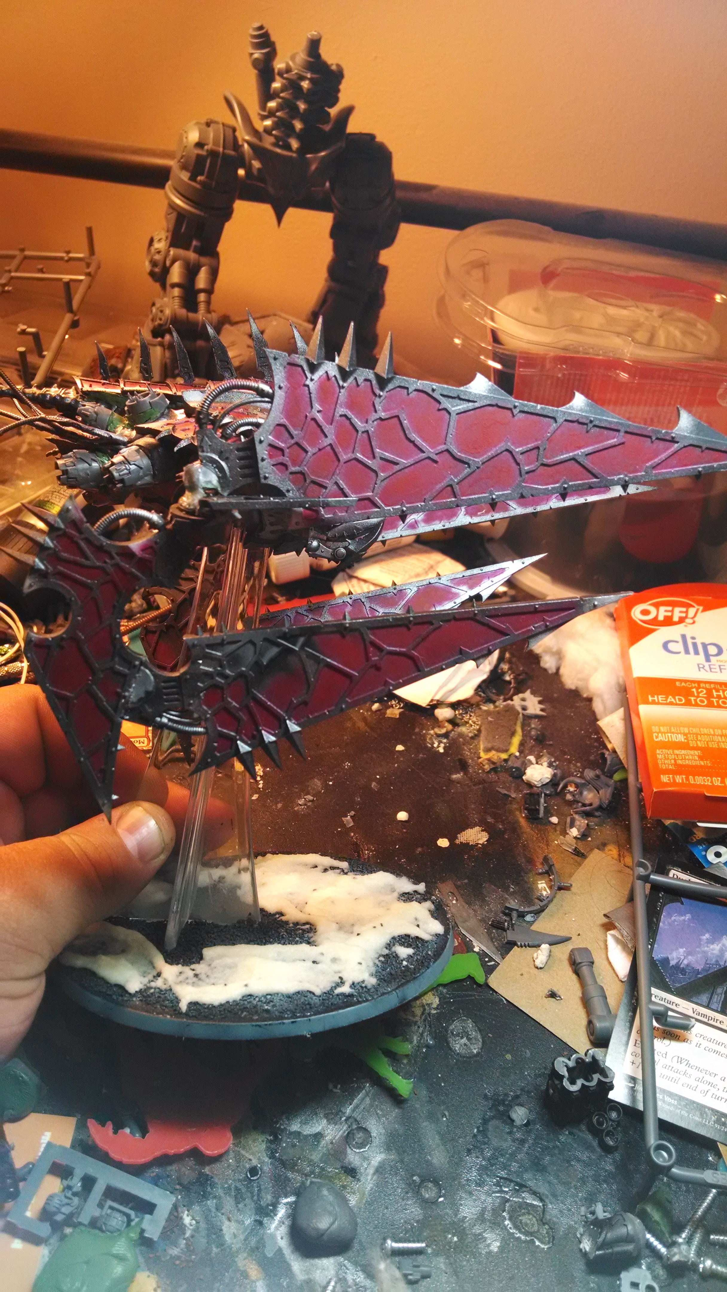 Here's the helldrake. I really didn't like the way a normal helldrake looks and also felt like it didn't fit the look and feel of my army. I wanted a demonic tie fighter from hell! The "mouth" is made up of a buncha the centurions grinder fist things. I wanted a big maw that snatched anything up and finds it to itty bits. I think I need to straighten out the wings pose a bit but I'm tired right now. Especially since I have about a combined 8 hours in on this stupid thing. It's painted red because it's a used model I got on the cheap.