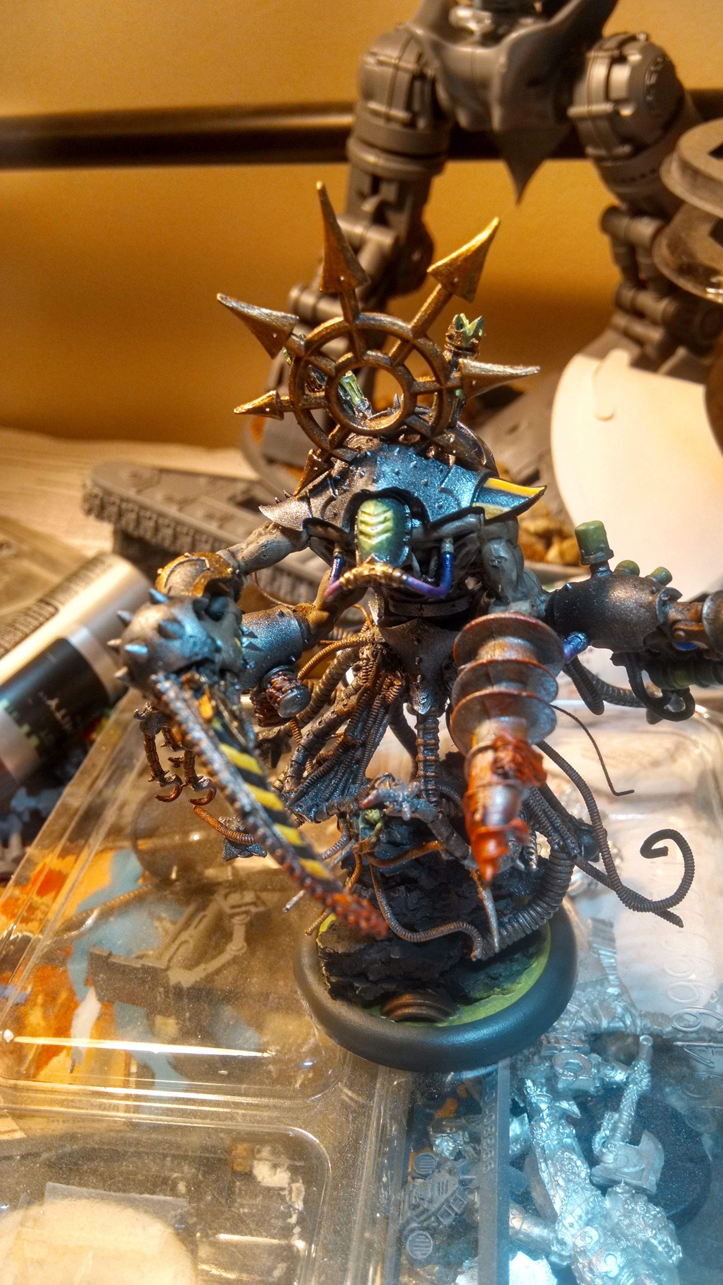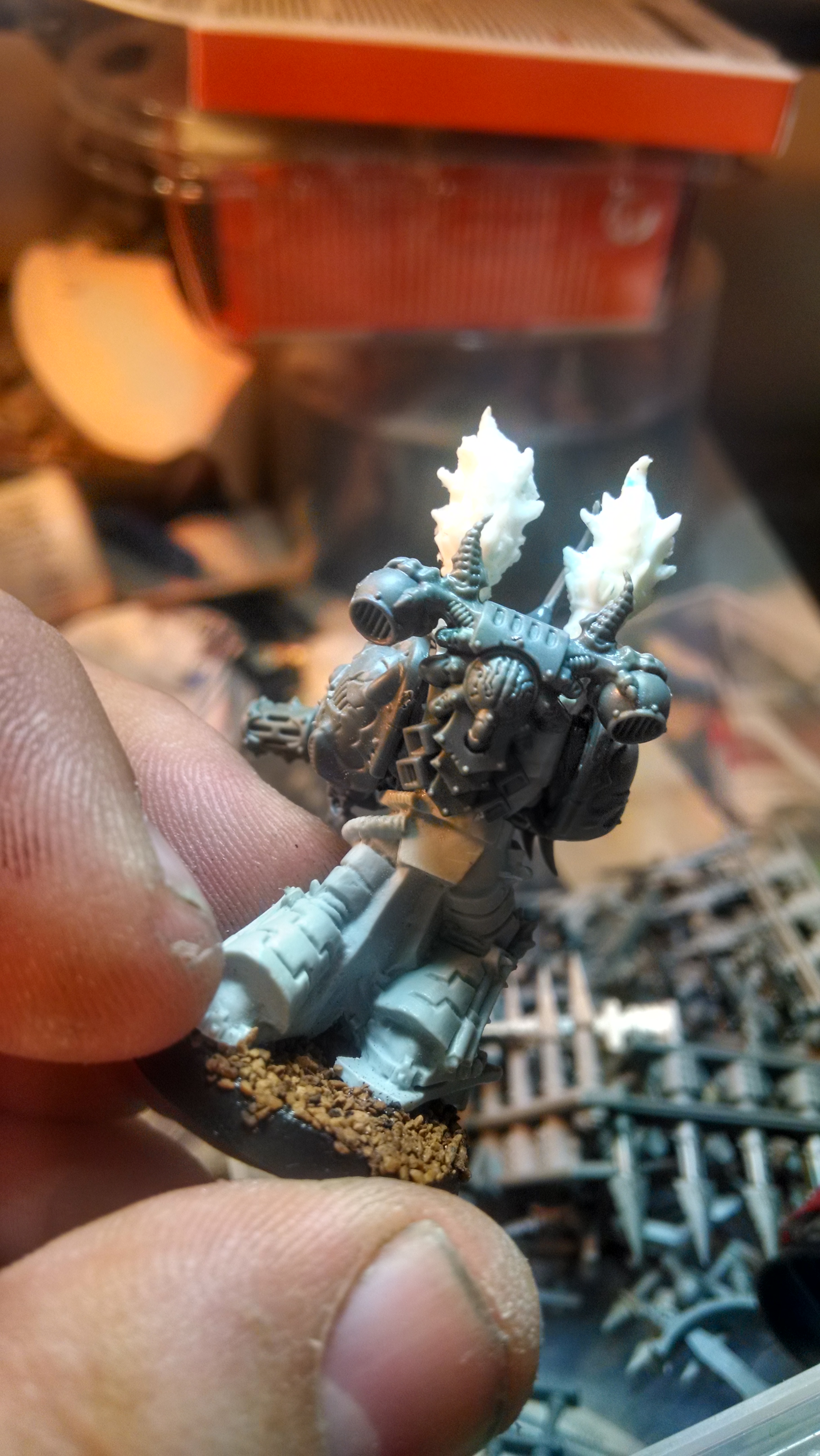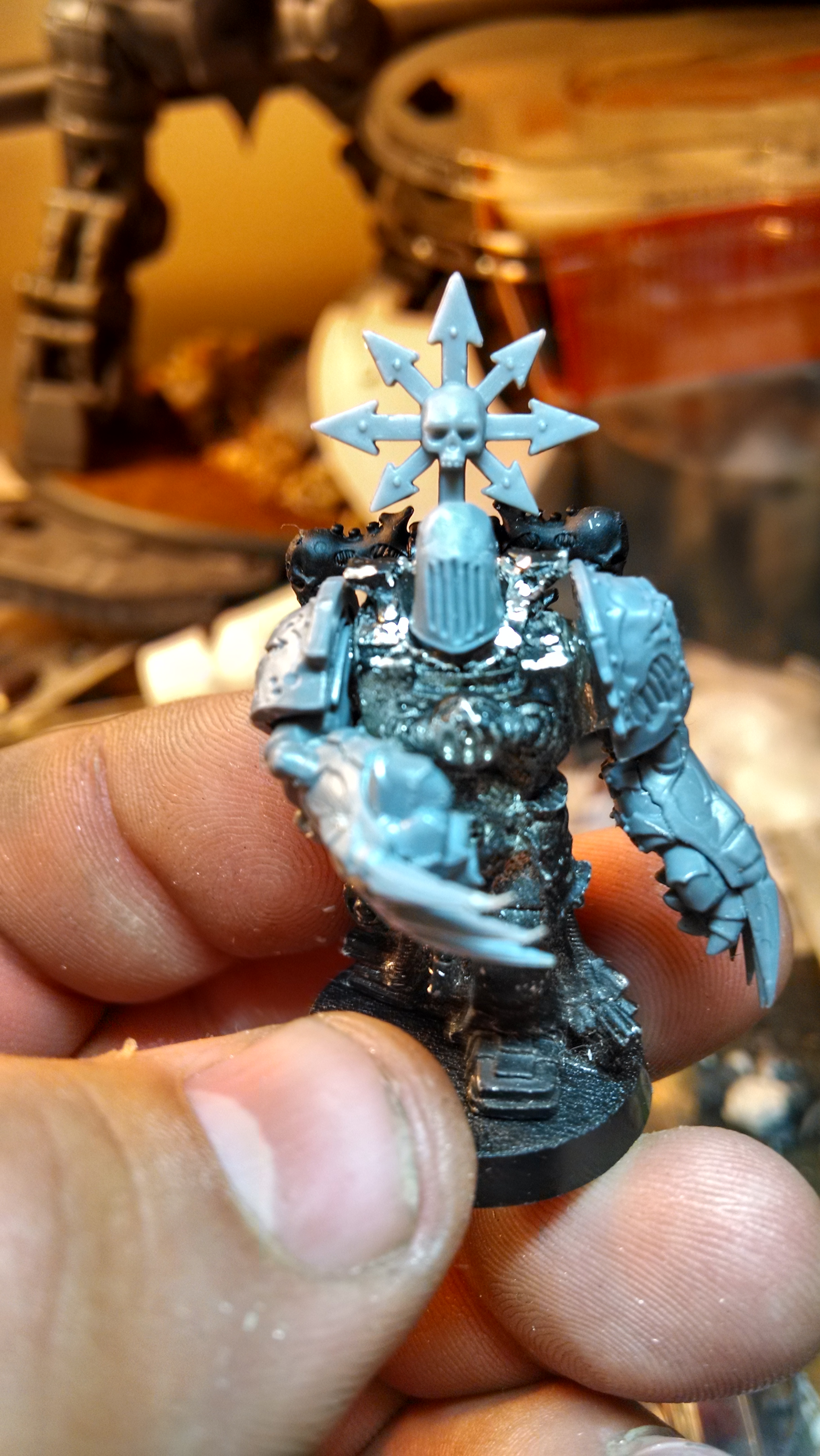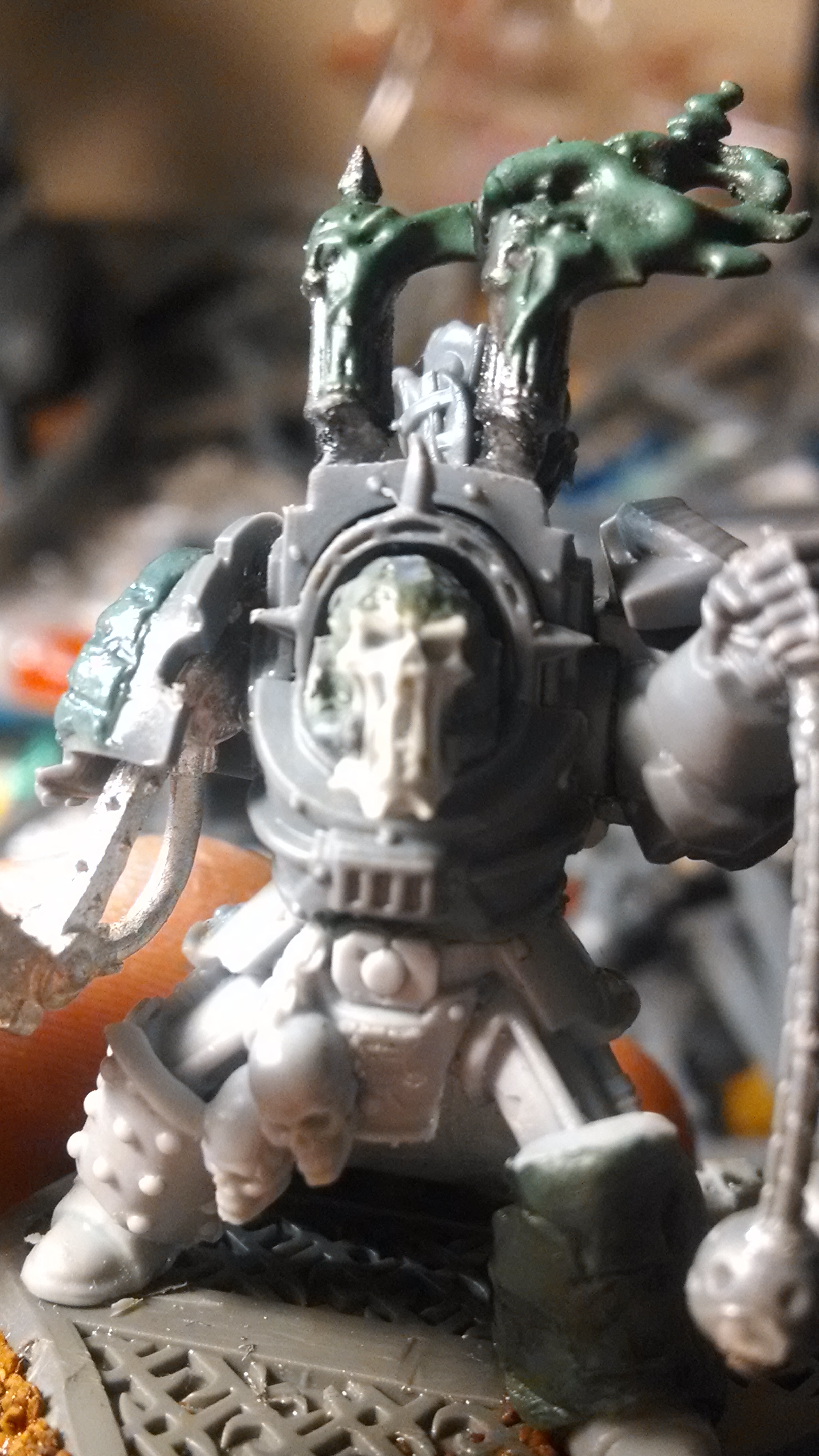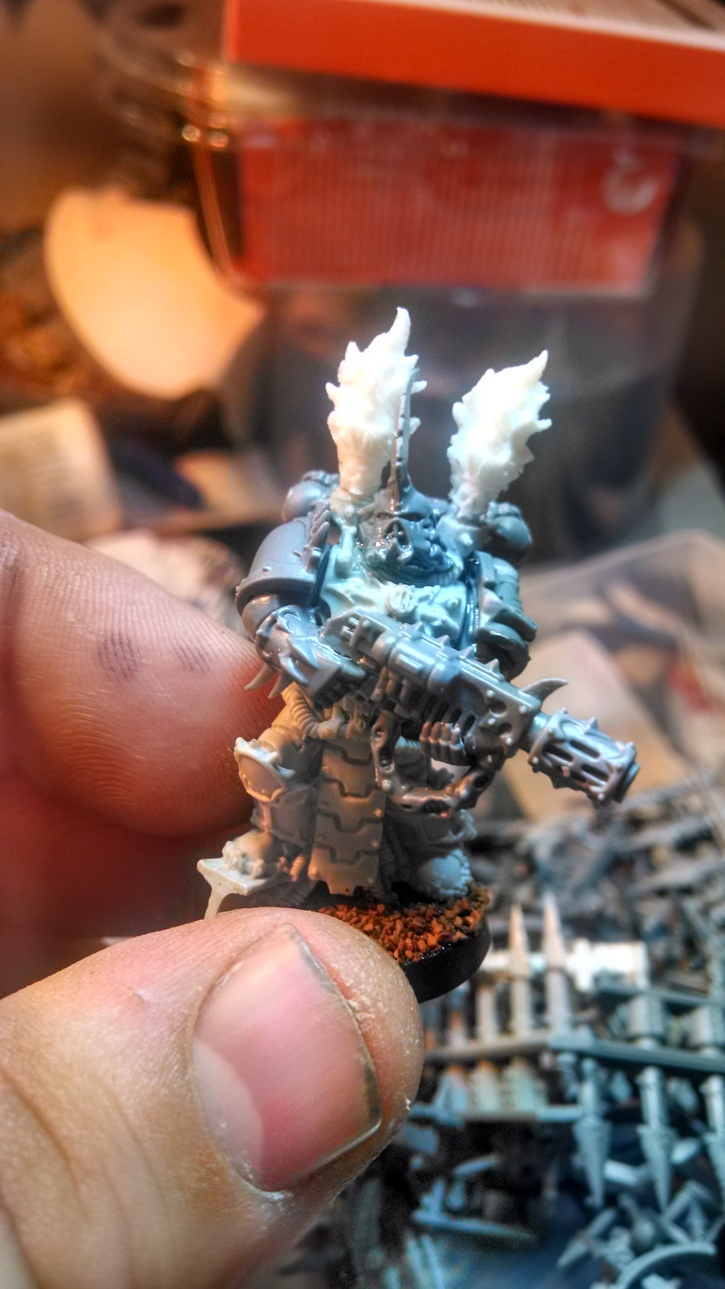 OK I think I have the typhus counts as finished. Had to take the head off of a chosen because it felt too cool not to use for an HQ. Also the smoke stacks Of the other lord (who I decided counts as abbadon) because they just felt right on this guy. Still have to do a little clean up on his shoulder pad but I'm quite happy.