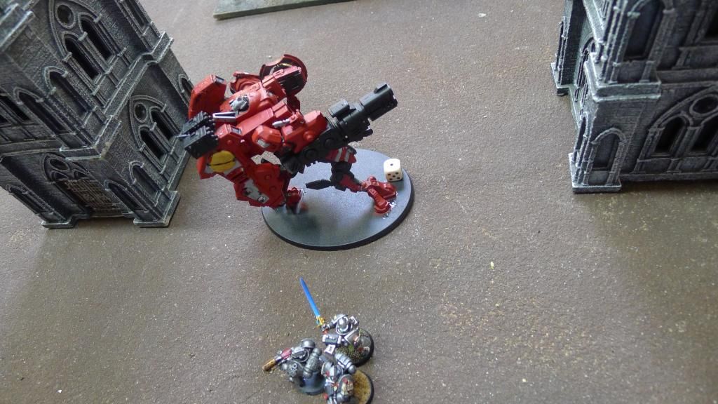 We used Grey Knight proxies in this game. The terminators represent the crisis suits. The Grey Knight strikers represent the stealth suits. Stealths drop in first. Then crisis suits land off of the stealth's homing beacons without scattering.