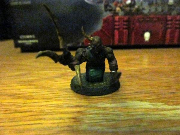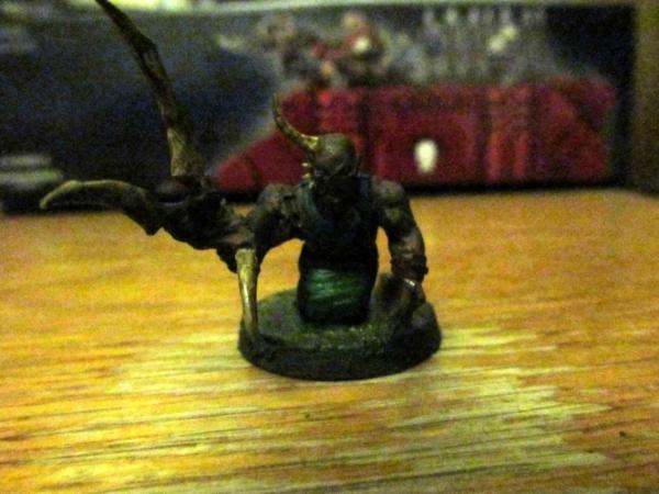 His eyes are a Nurgle style green (which in photo it has being shadowed by position and my camera acted up ^^') But will take a better face picture if possible tomorrow  will work to getting another Nurgle Cultist started after Halloween as got my custom squad to paint and finish