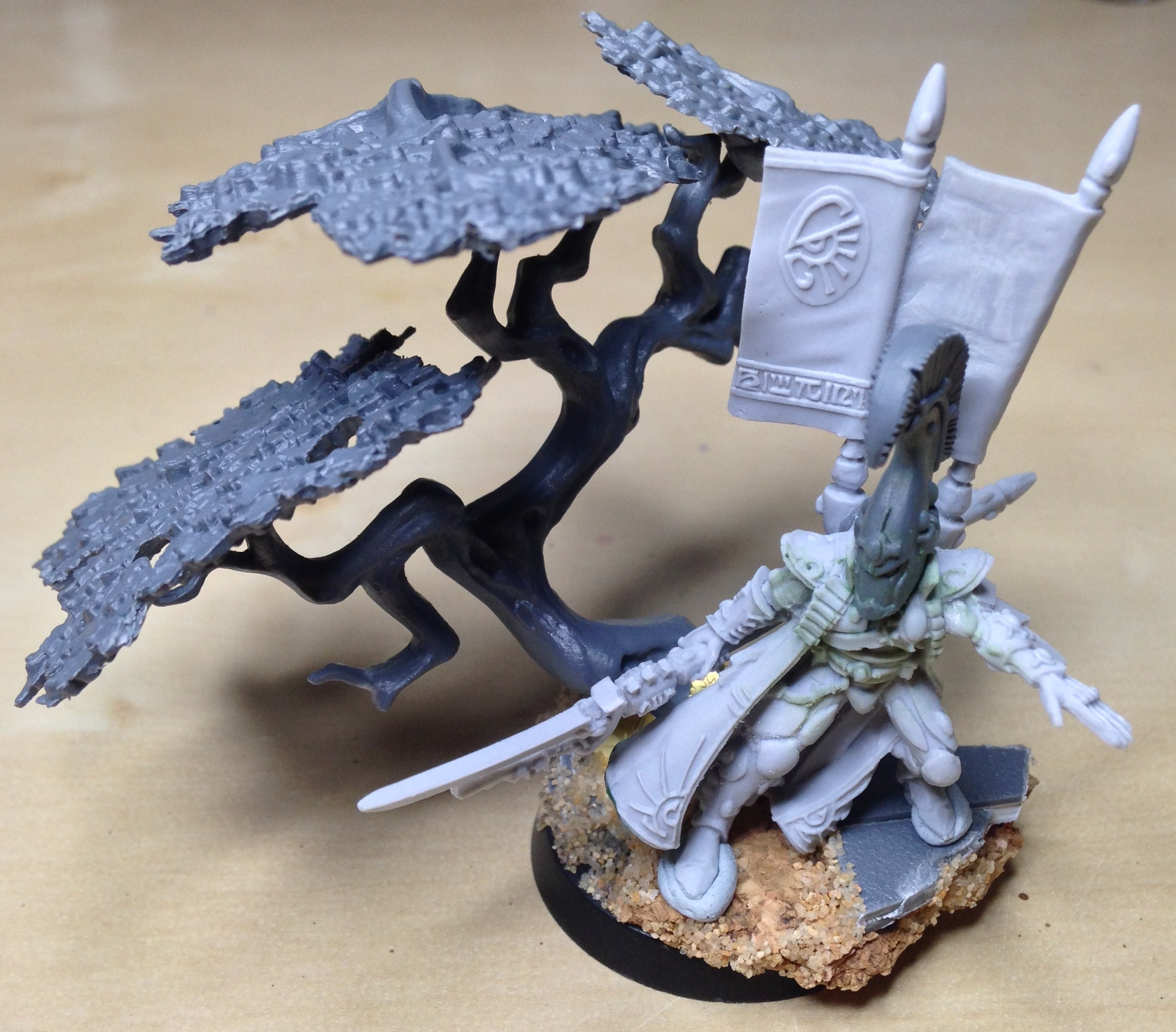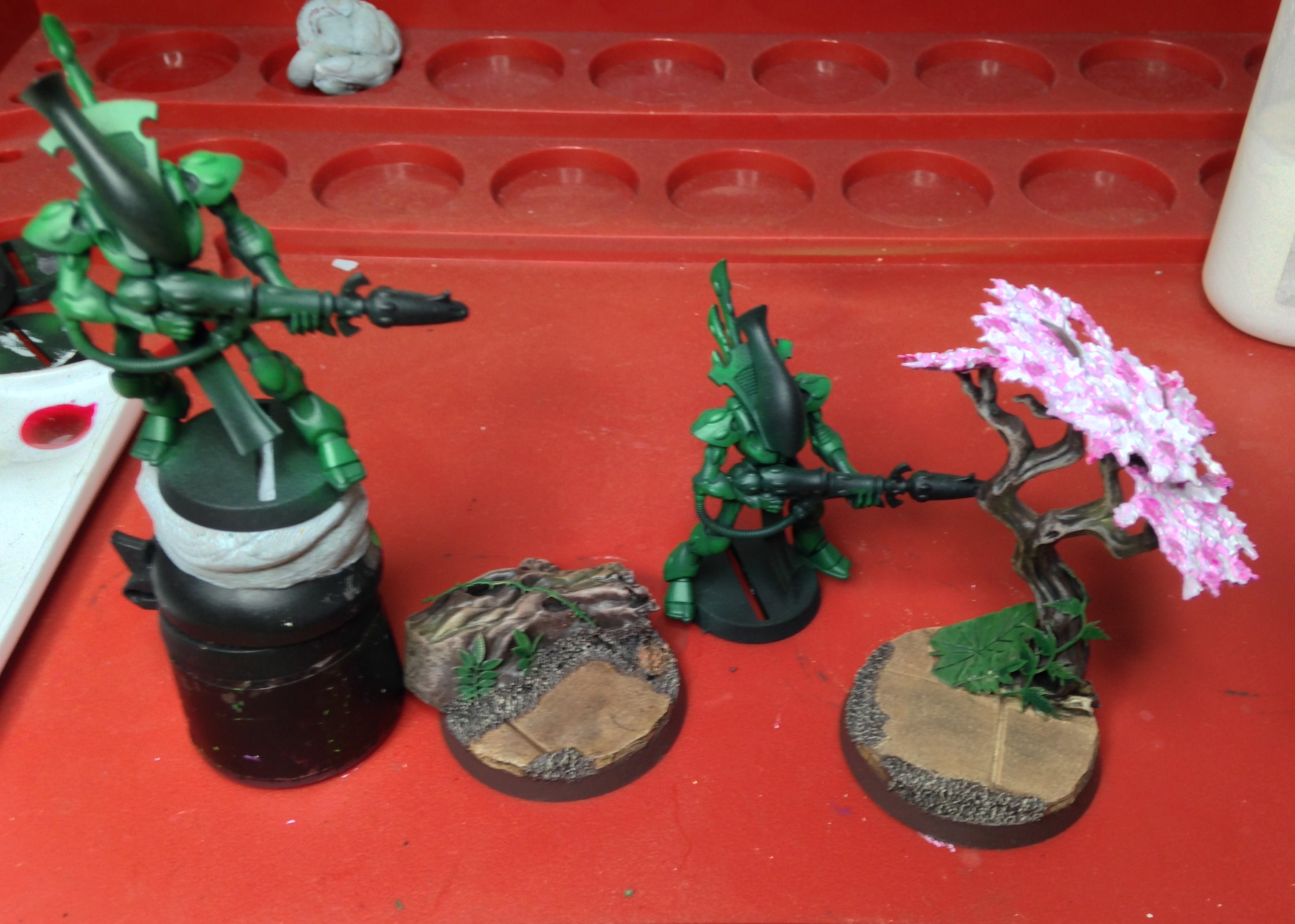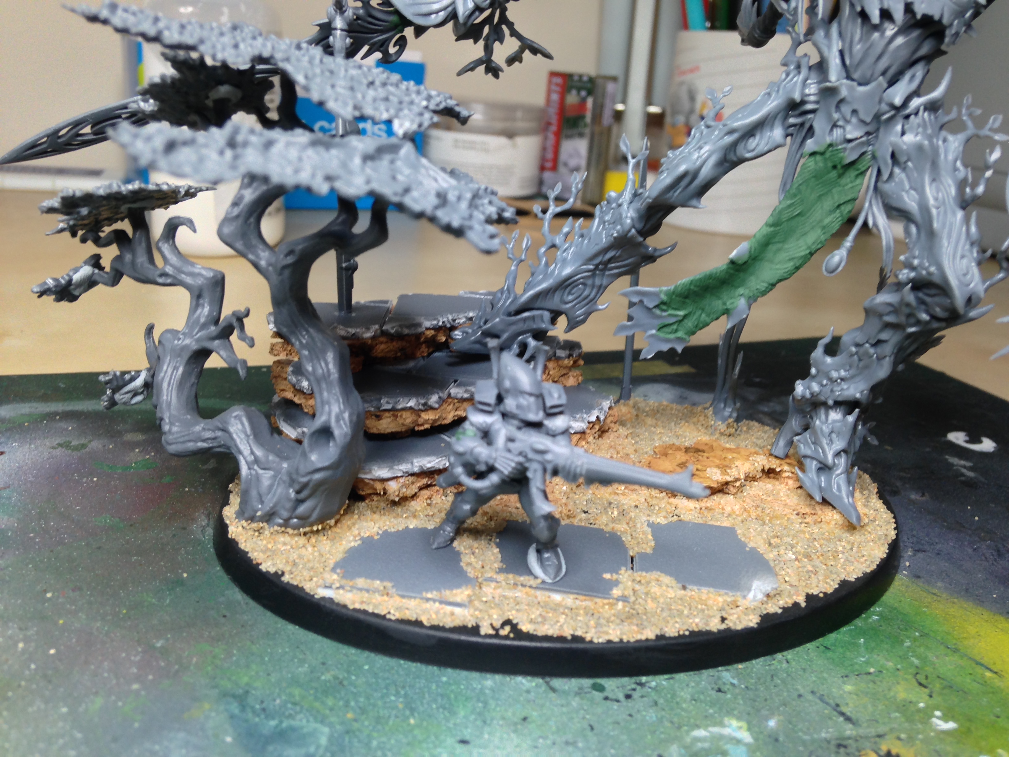 Thanks bud. Managed to sit down to do a little hobby for the first time in a week. The second objective marker is all finished, with the wraithguard primed for painting. Put the first layer on the leaves quickly.