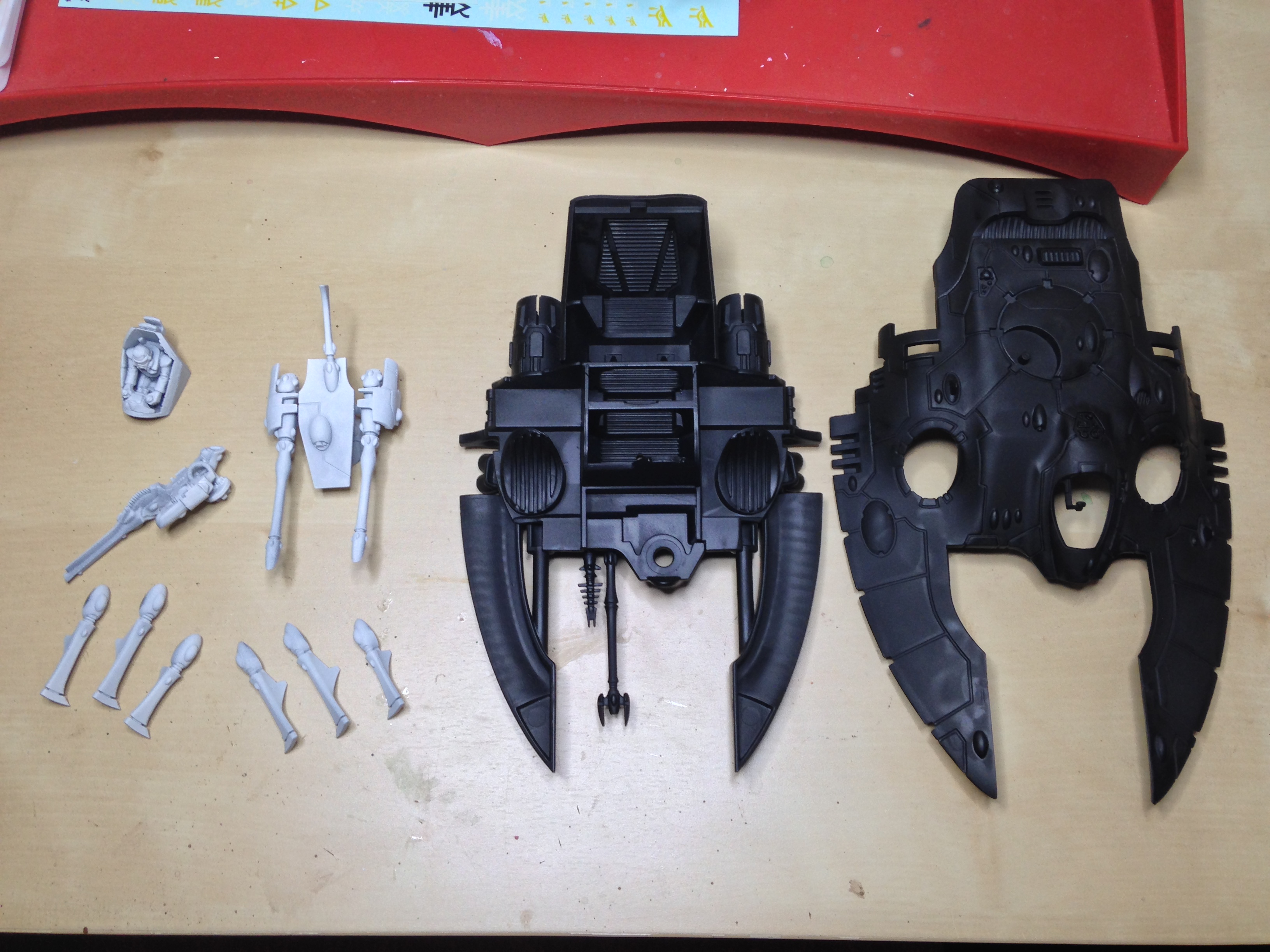 The Wave Serpent is built and primed and being kept in a few separate pieces for ease of painting. I am currently toying with the idea of trying a freehand design on top of the serpent, but not having done much freehand before am looking at ways to test if its in my capability. The plan is to paint all pieces except the top panel, and then sketch a few ideas on paper before trying it on the model. I'll post the ideas as get to them.
