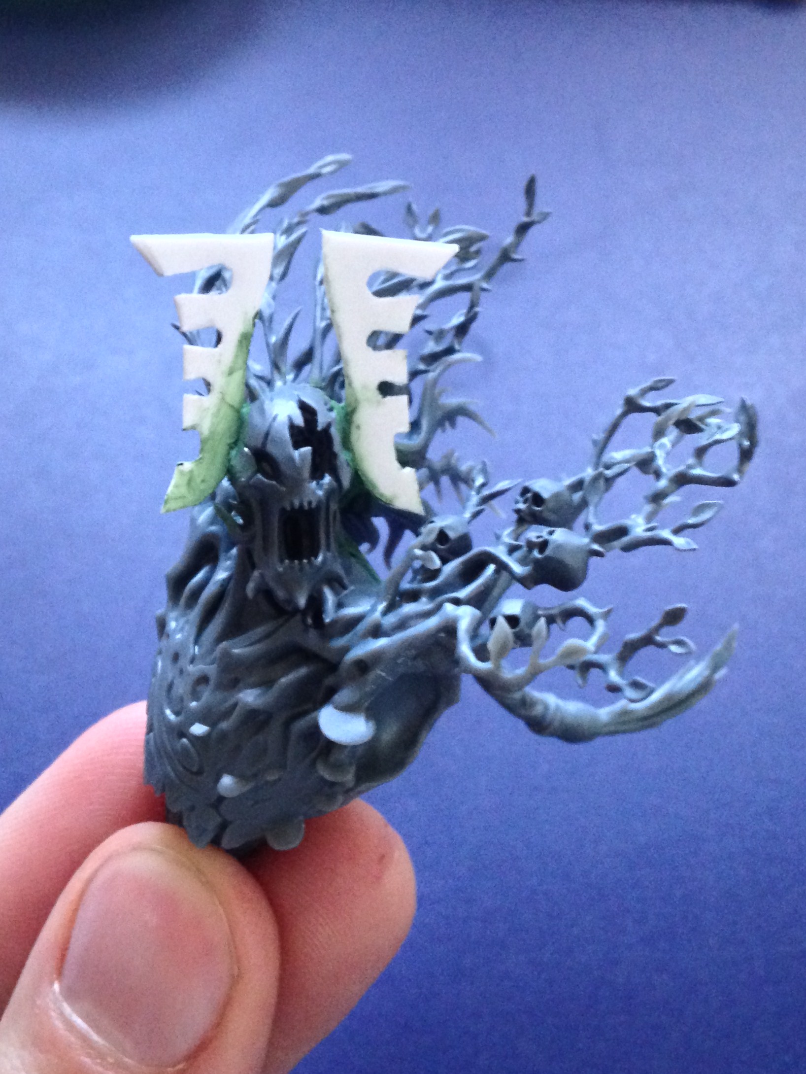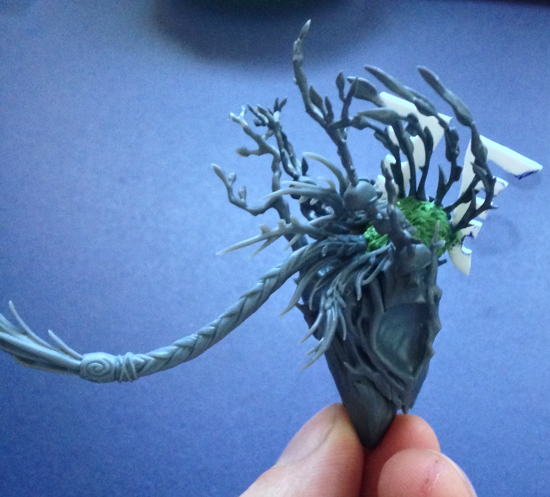 Got distracted from the painting by an idea (not mine) to convert an avatar from the gamesworkshop plastic treeman kit. The treeman kit shoud allow me to have a unique looking piece to the army, and at the same time keep the theme. After having a look through the pieces I started to put a bit together and have the head and upper torso of the model. There are a lot of spare pieces in the kit and it appears to be very pose-able. With the kit so far a neck and head swap have changed the direction of the treeman ancients pose and his 'beard' has become the avatars hair. Also Durthu's face is suitably aggressive. What do you think so far?