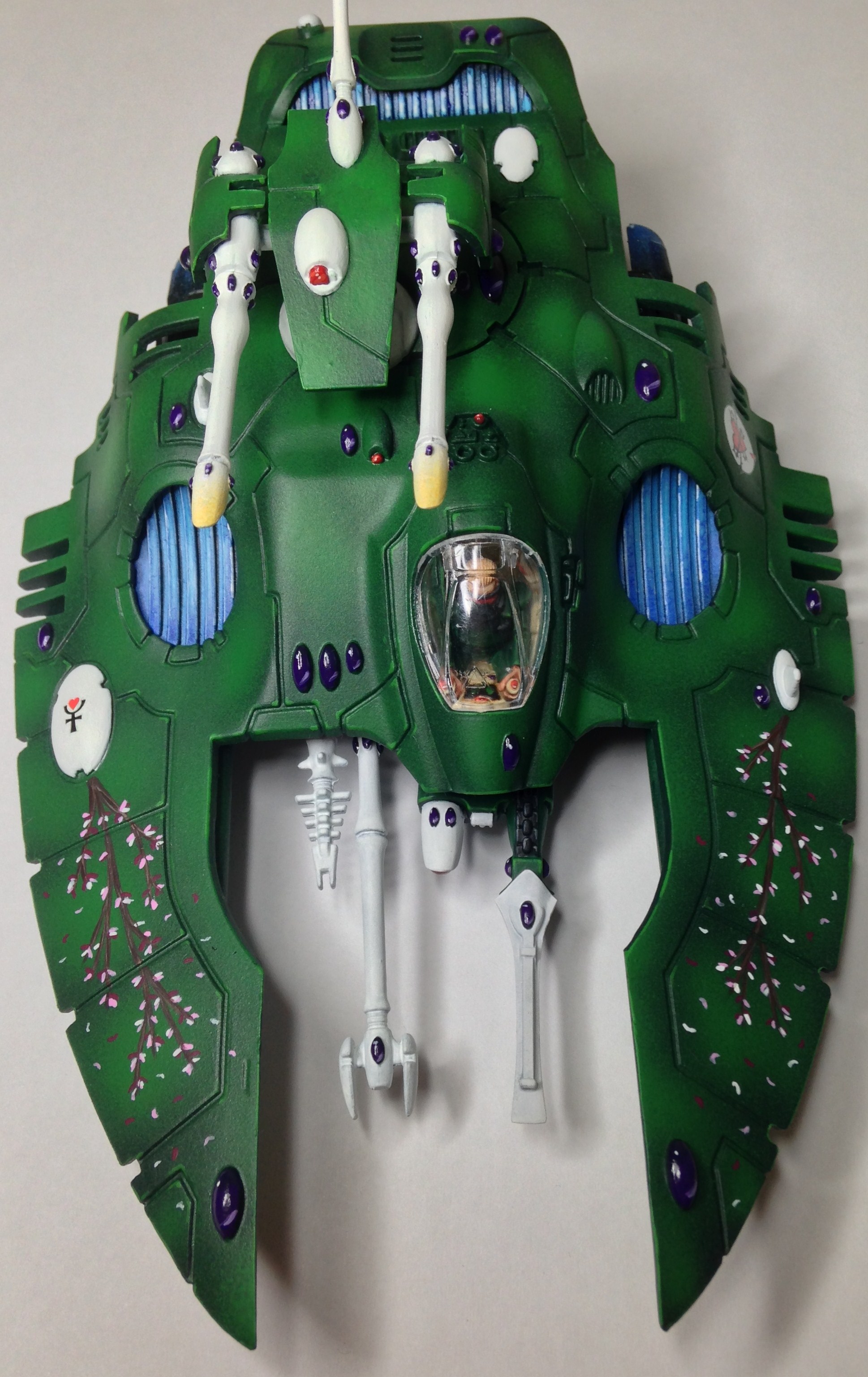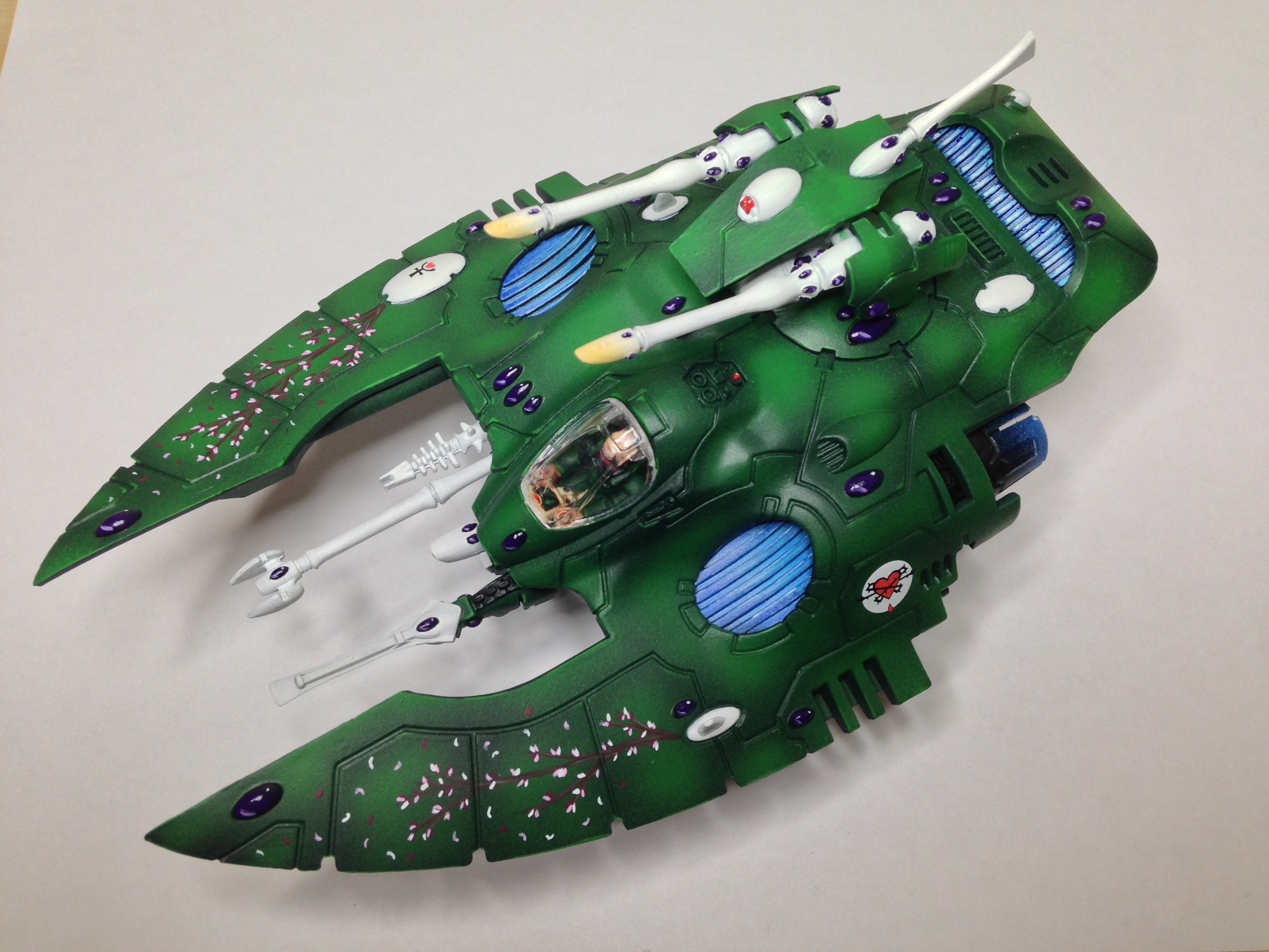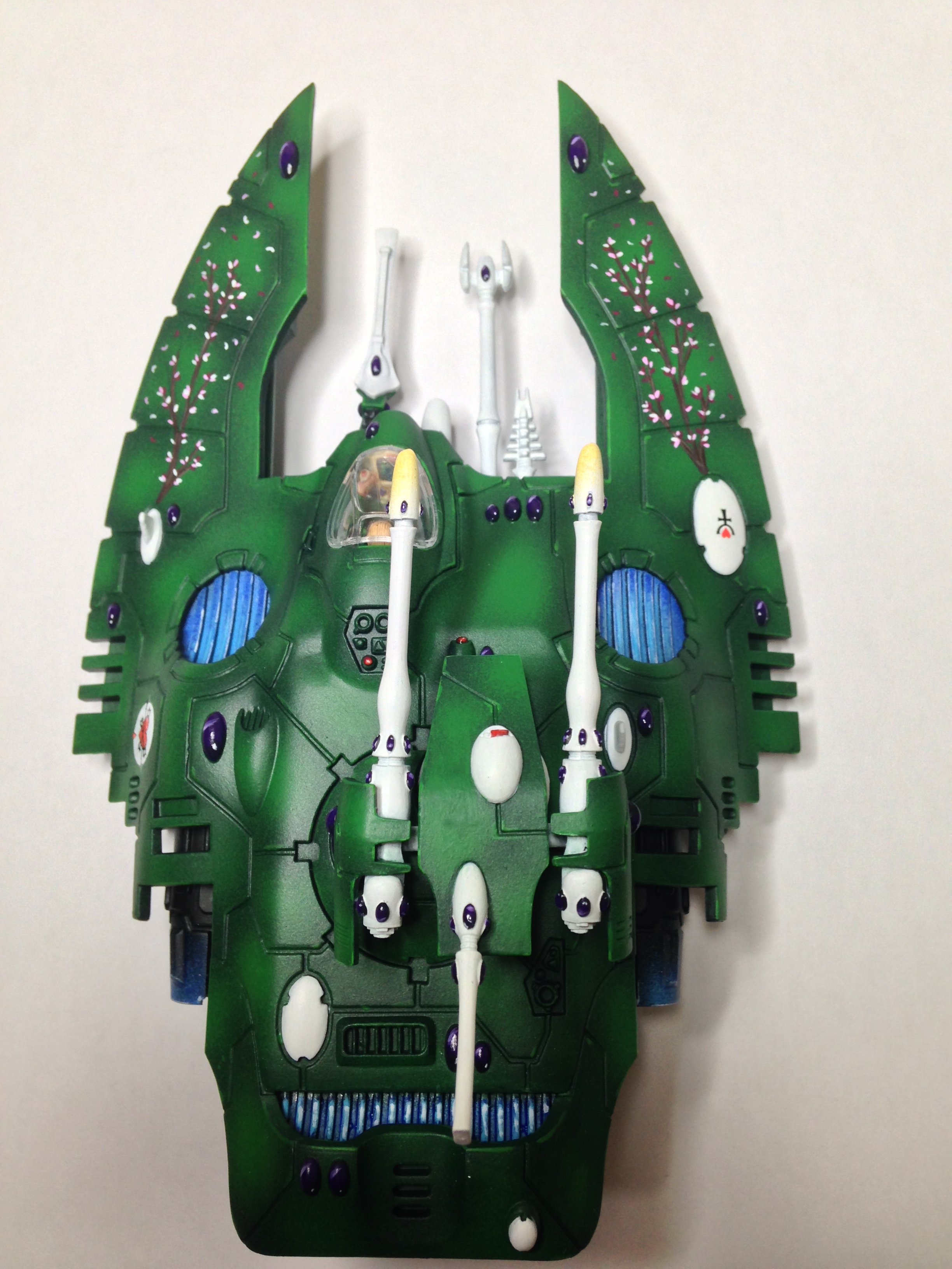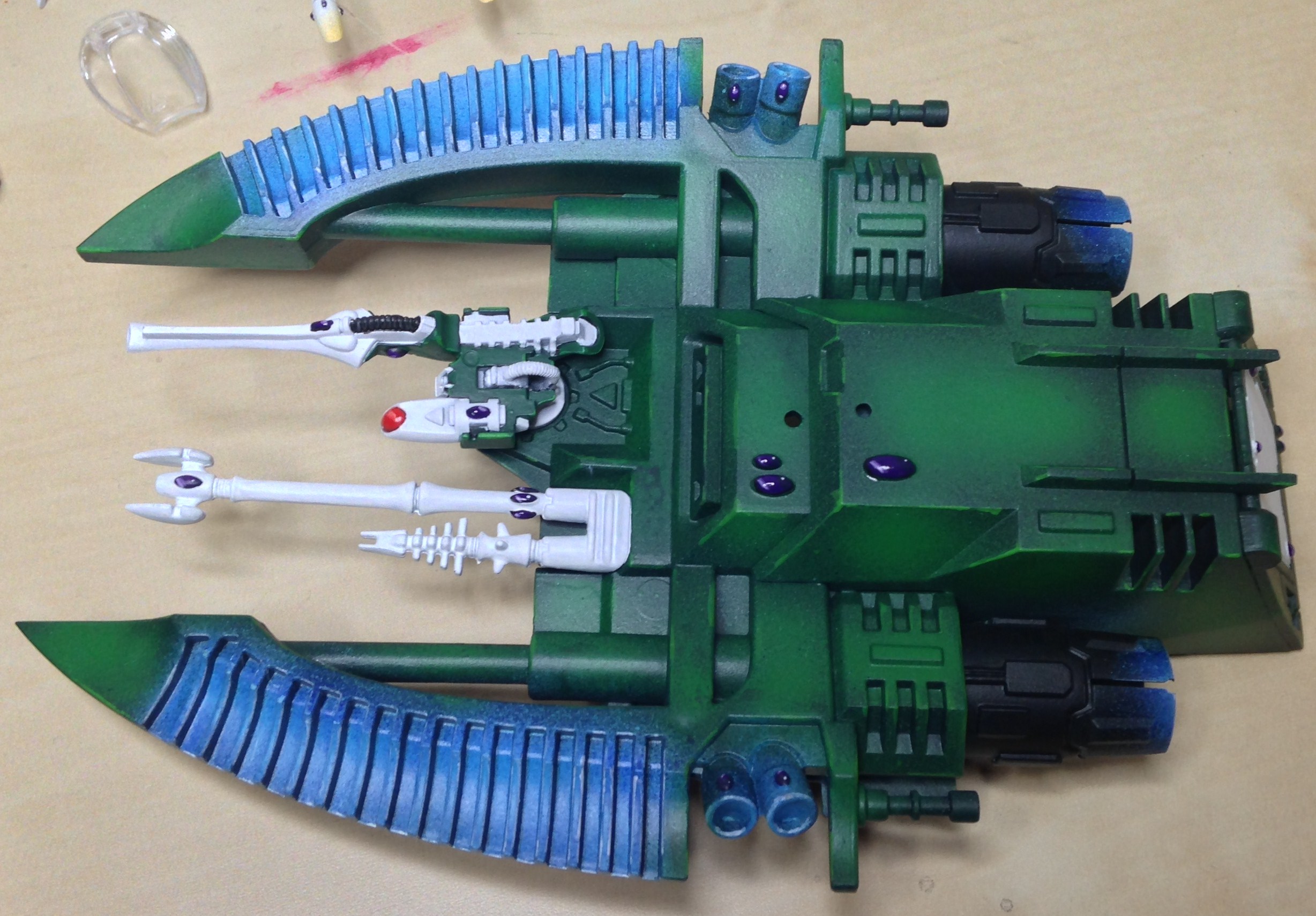 The wave serpent is now finished. Not sure how I feel about the finished model with the freehand. Left the extras off the front in the end, and may find another use for them on something else, possibly on an objective marker.