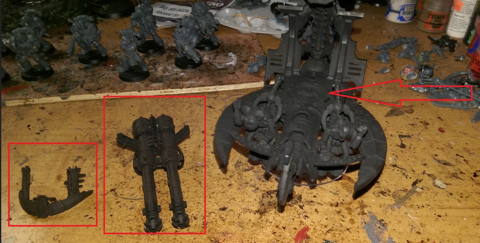Here's what I mean. Don't glue the "podium" (left box) or the Tesla Detructor (right box) to the hull of the vehicle. Both can fit in there without glue, and if you don't glue, you can have access to either vehicle.