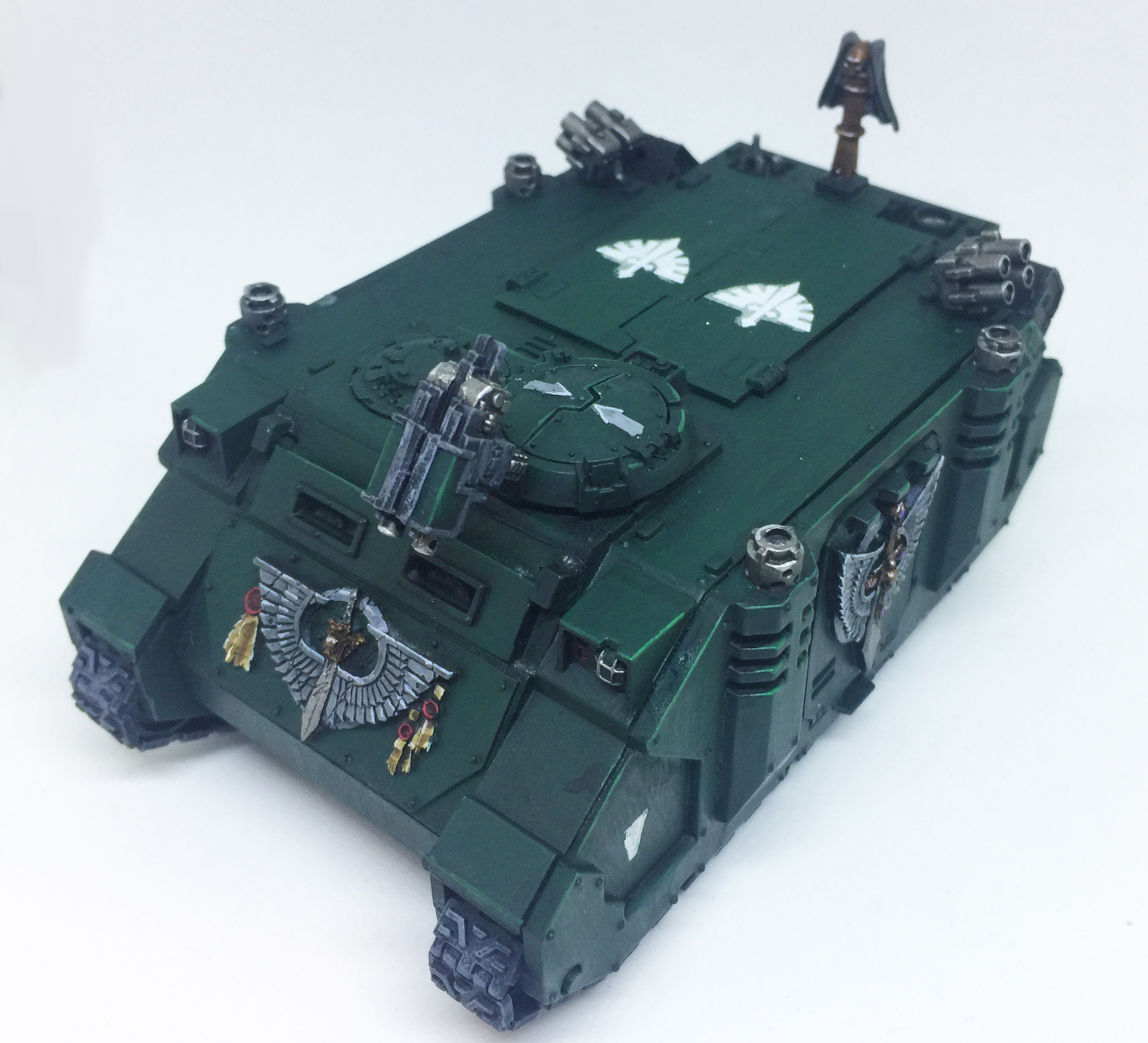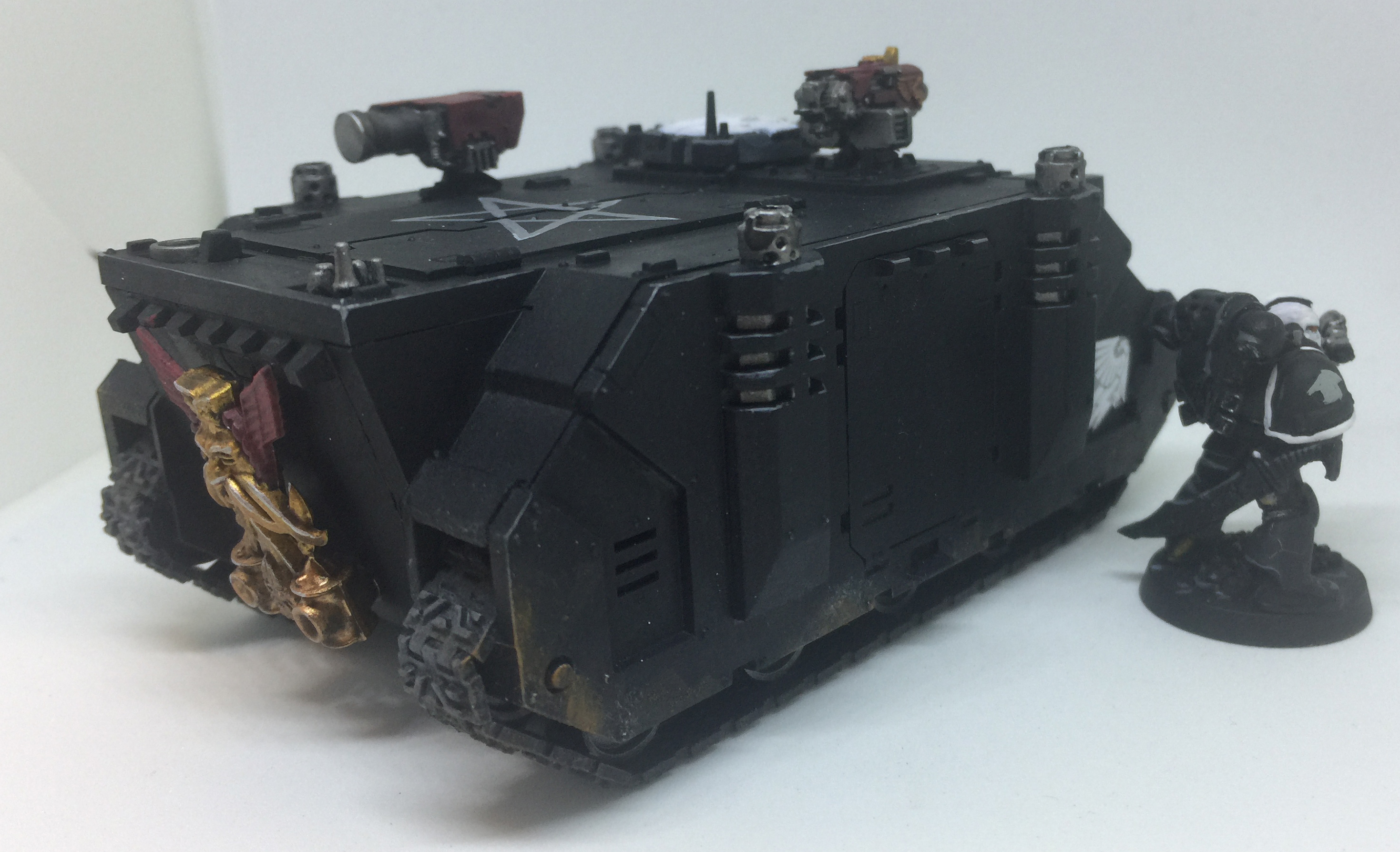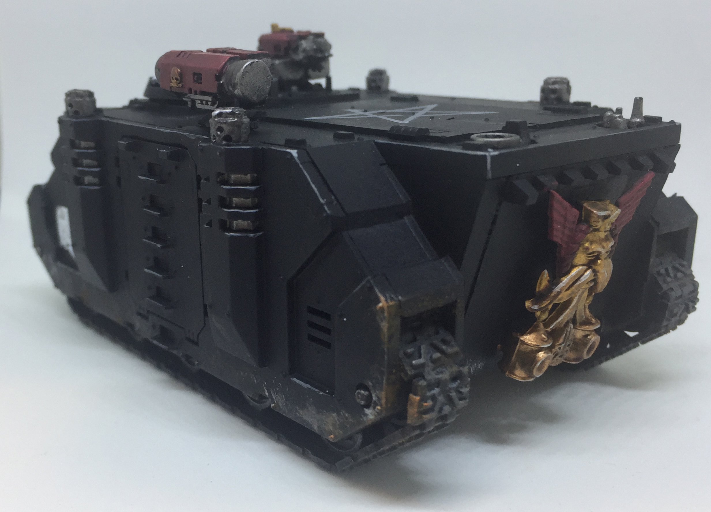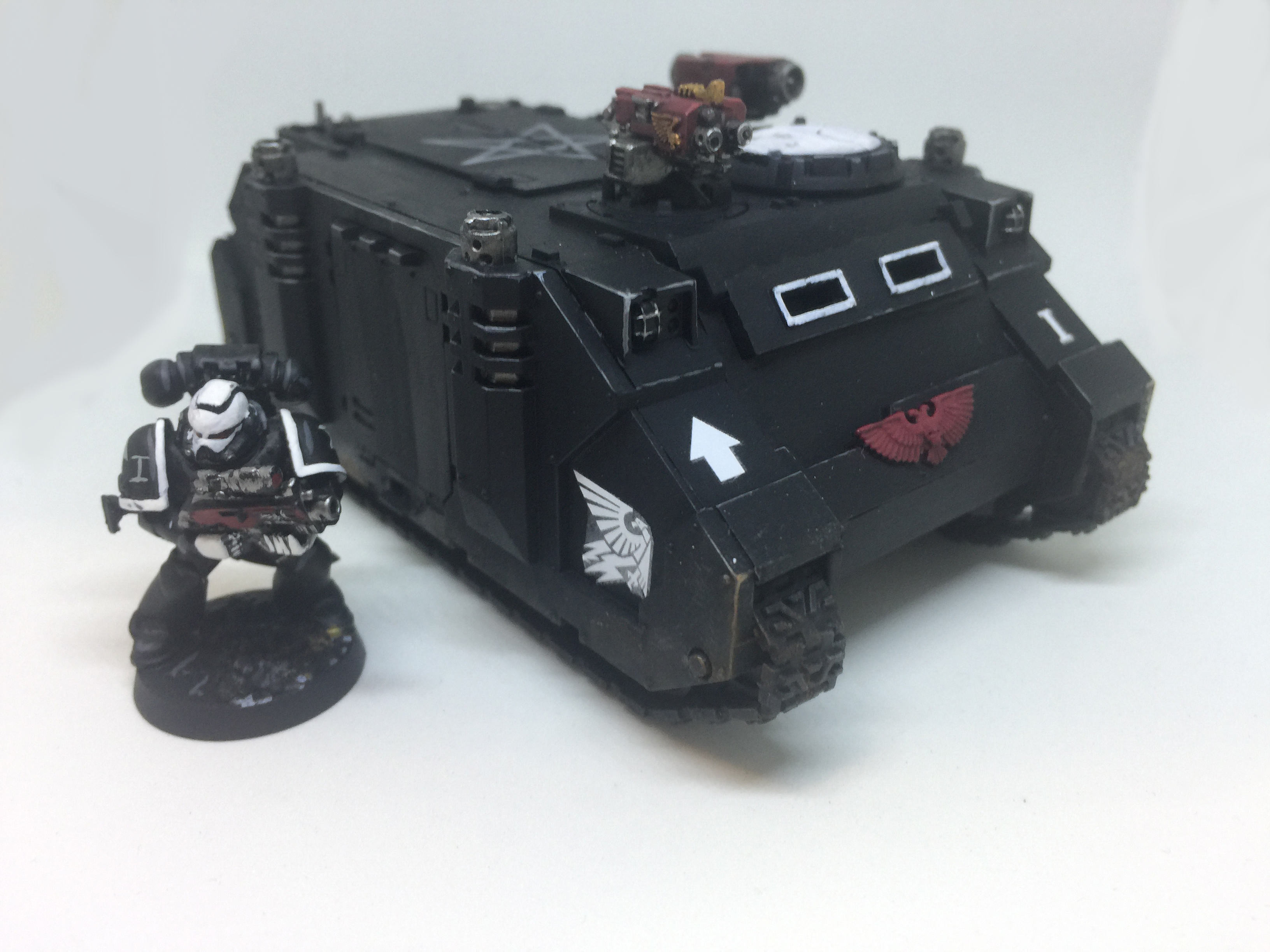 After saying my Divine Exorcists were finished, I decided the army would be radically improved by giving the marines some transportation, so here is the first of possibly two rhinos, painted to a basic standard.
